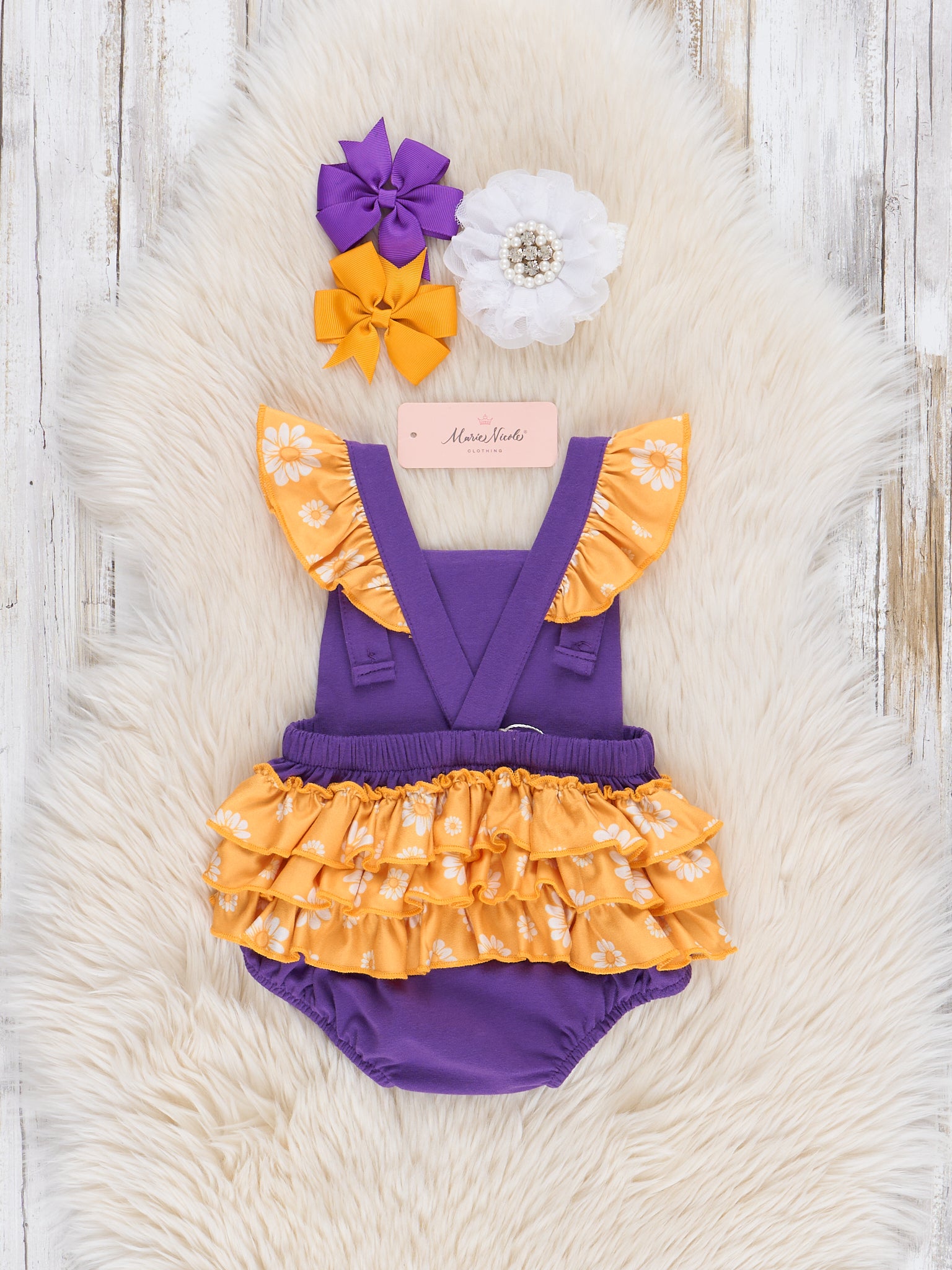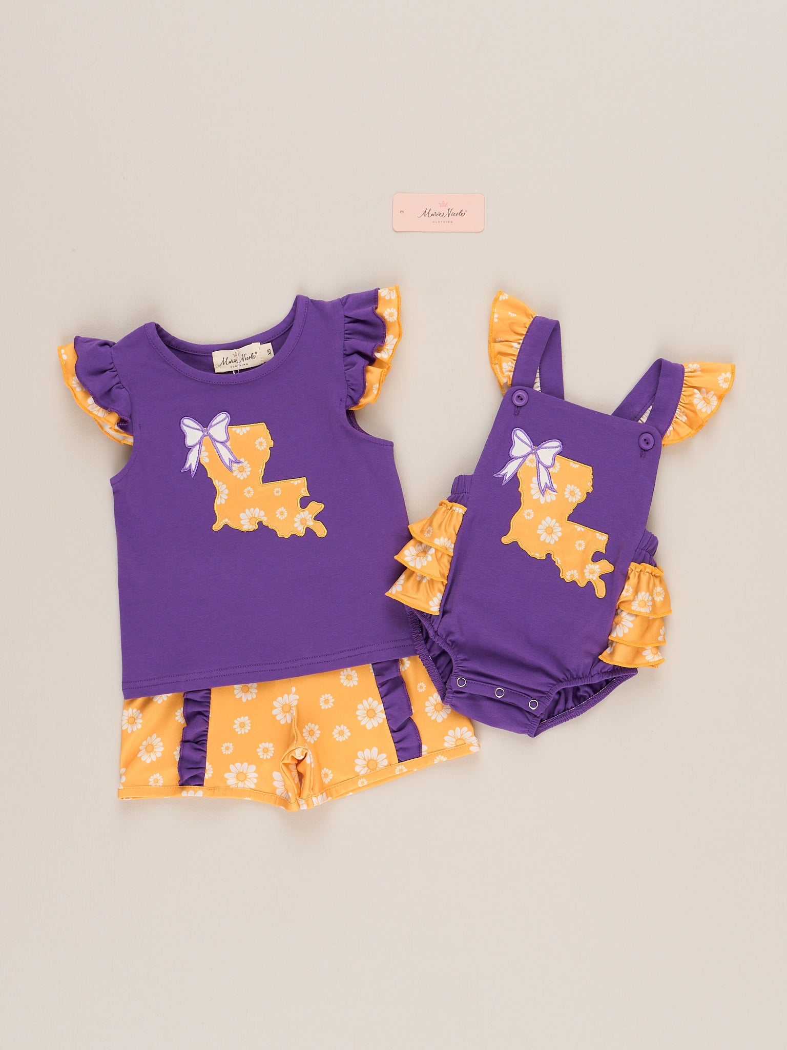The Louisiana Embroidered Floral Ruffle Bubble is a bright and playful and perfect for sunny days and sweet adventures. Featuring a bold purple color with ruffled floral sleeves and a charming Tennessee applique, this outfit from Marie Nicole Clothing is ideal for warm weather, family outings, or cheering on your favorite team in style—perfect for game day spirit!