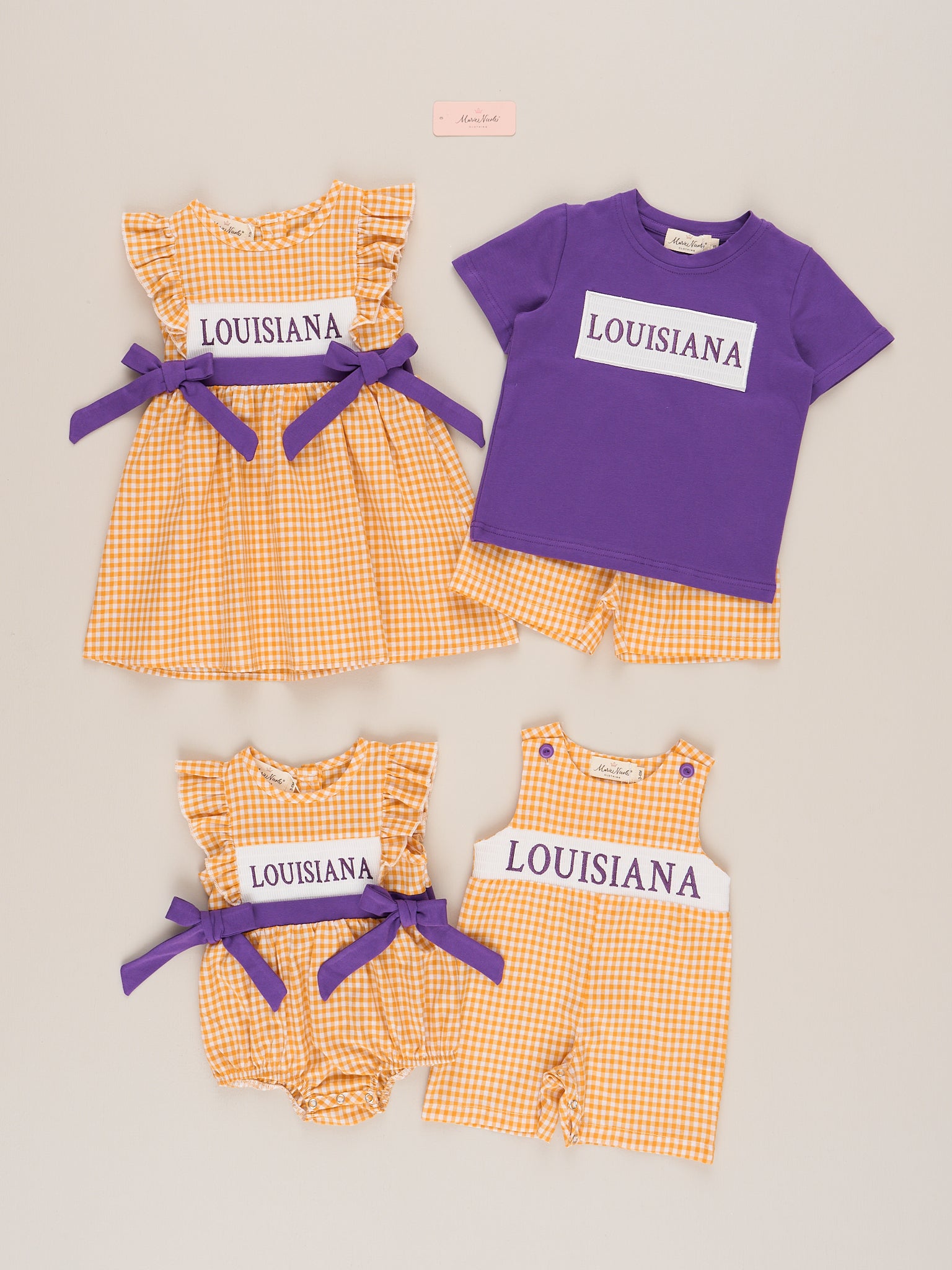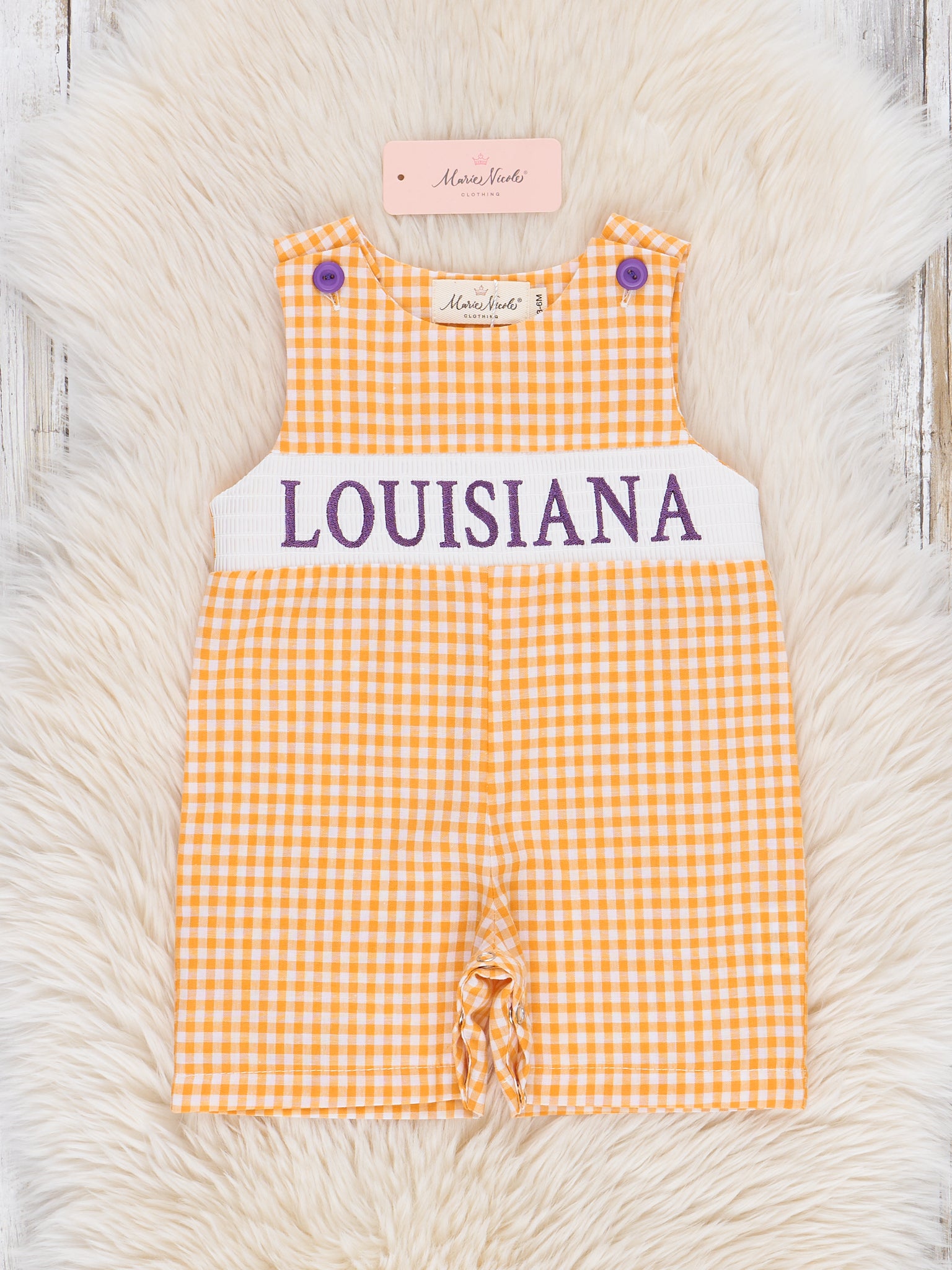 The Louisiana Smocked Gingham Johnny is a classic and charming choice for your little guy to show off his state pride. Featuring a timeless yellow and white gingham print and a smocked panel with bold “Louisiana” embroidery, this one-piece from Marie Nicole Clothing brings Southern style to game day and beyond. Lightweight, breathable, and designed with convenient snaps for easy changes, it’s a spirited outfit perfect for tailgates, family photos, or sunny adventures.