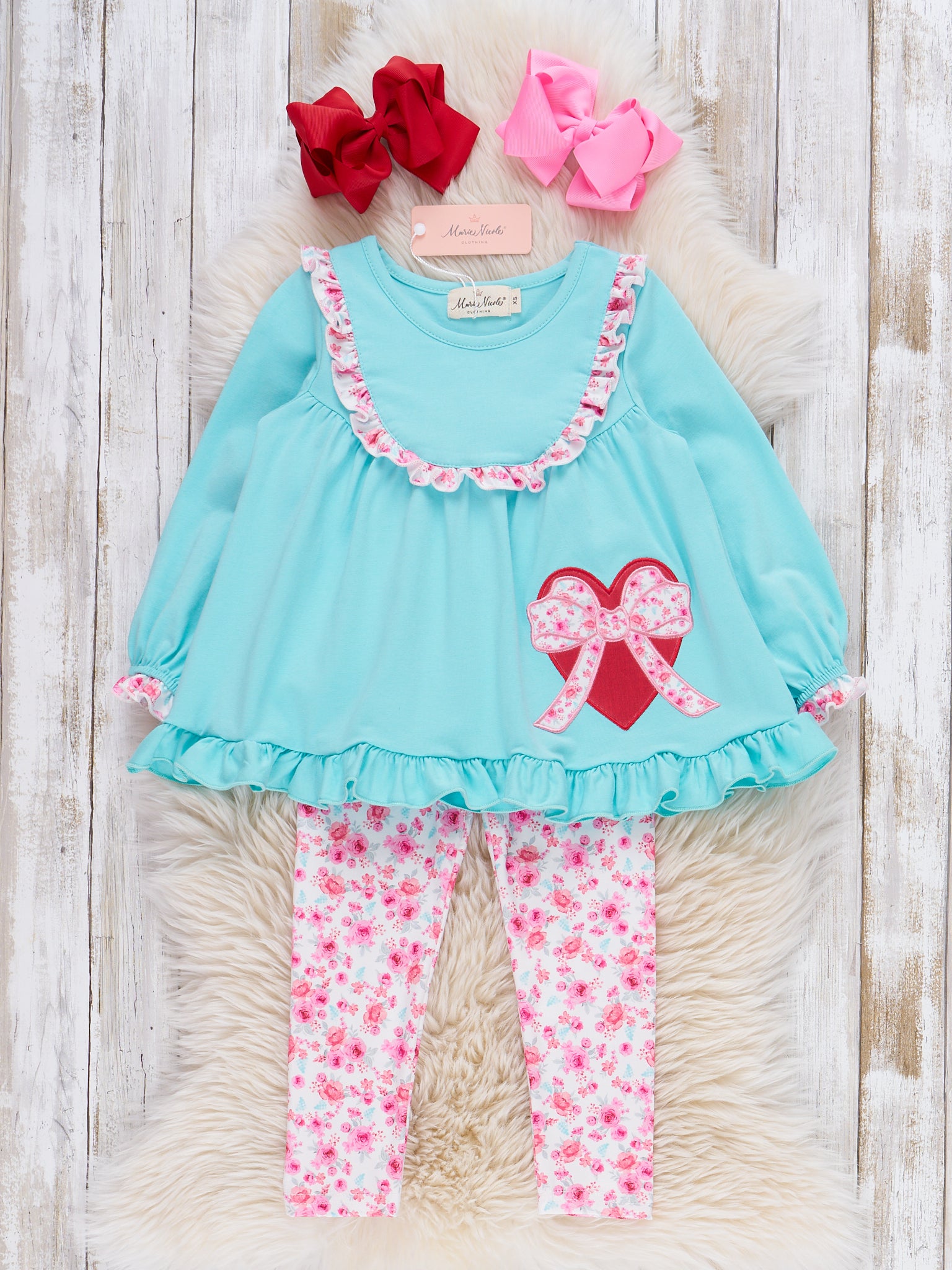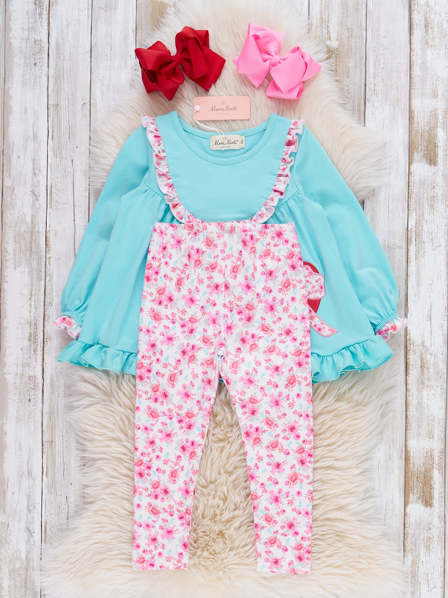 Love & Petals Embroidered Ruffle Outfit by Marie Nicole Clothing includes a flowy long-sleeve top with ruffle trim, a heart-and-bow appliqué, and playful floral leggings. This set brings together charming embroidery, a touch of frill, and a lively floral print for a sweet, coordinated look perfect for special Valentine's occasions or everyday twirls.