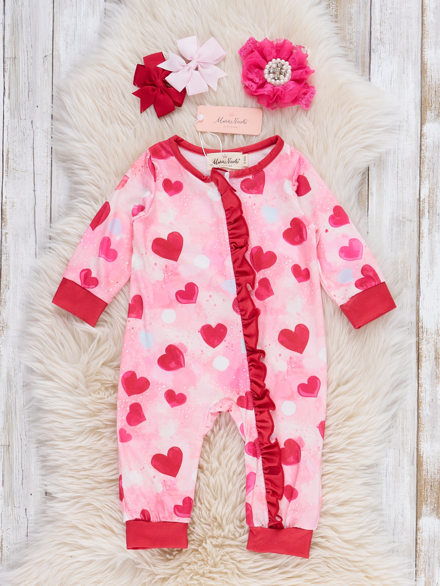 Loveburst Snuggle Sleeper Pajamas by Marie Nicole Clothing feature playful hearts in bright shades on a cozy pink background, trimmed with bold red cuffs and a sweet ruffle zipper. Designed for extra comfort and cheerful nights, these adorable pajamas bring warmth and joy—perfect for making every bedtime feel like a special, love-filled occasion.