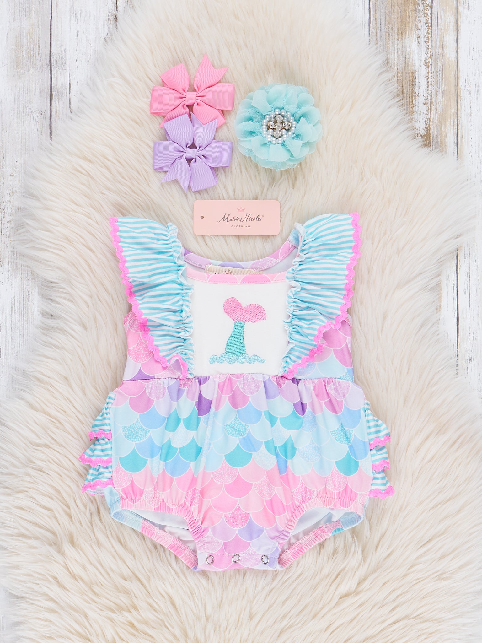 Make a splash this summer with our Mermaid Splash Ruffle Bubble! With a playful mermaid tail design and pink, purple, and blue scales printed bodice, your little girl will be the star of the beach. Plus, the ruffle shoulder detail and sister set option from Marie Nicole Clothing adds an extra touch of fun! !