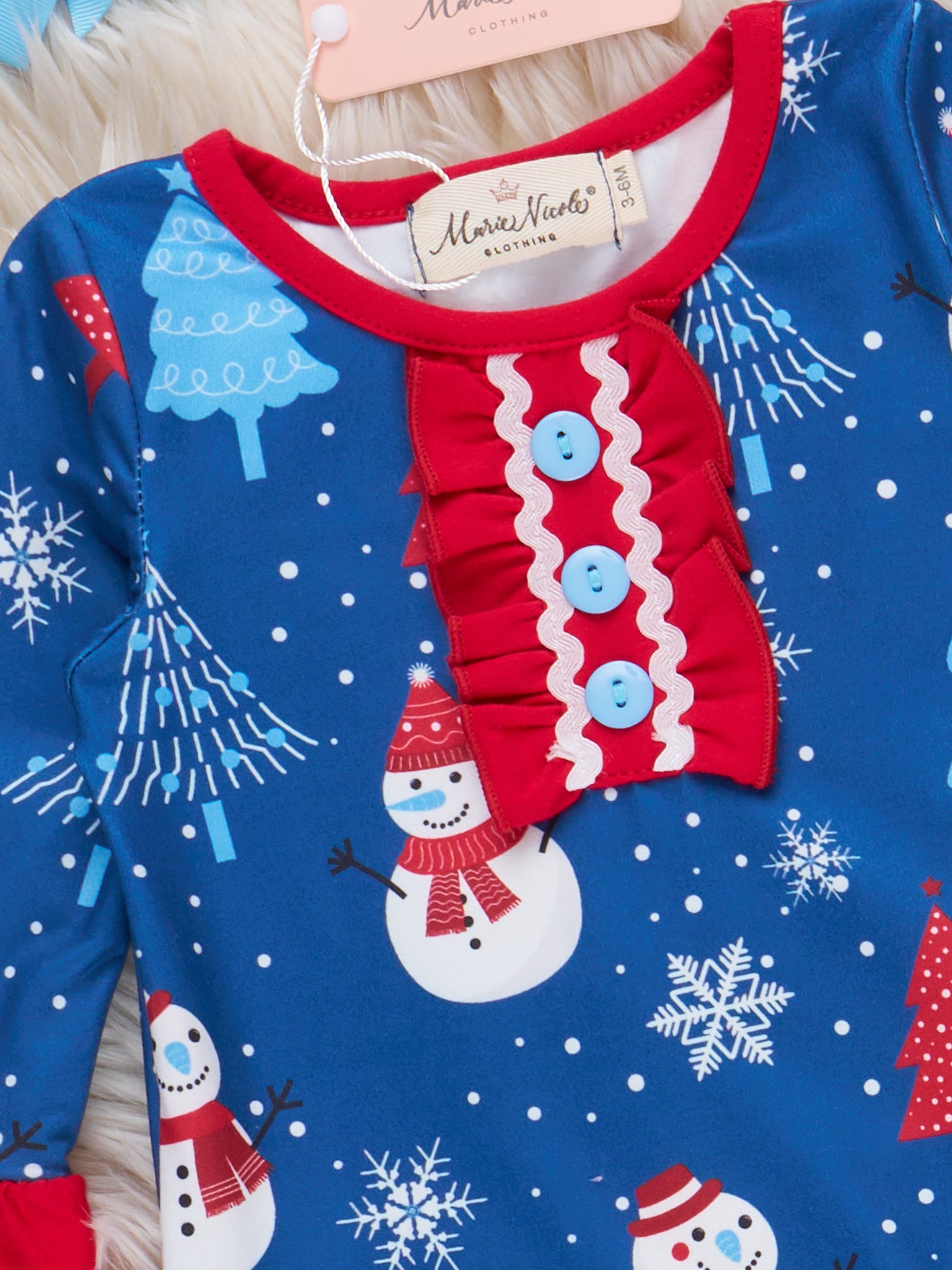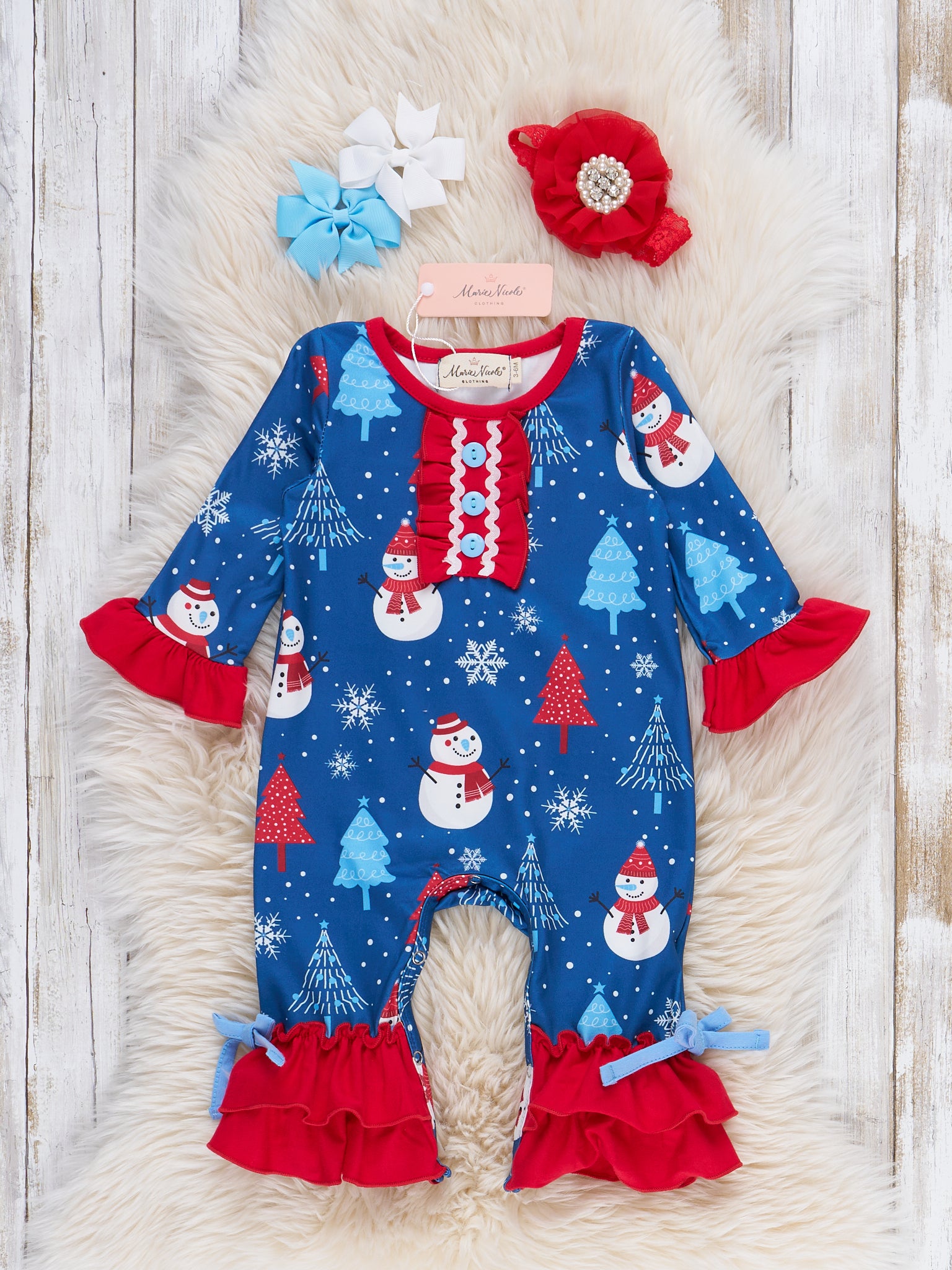 The Merry Little Snowman Ruffle Romper delights with playful snowman and snowflake prints, striking ruffle trims, and sweet bow accents at the ankles, creating a joyful look for winter celebrations. Featuring soft fabric and a comfortable fit by Marie Nicole Clothing, this romper is perfect for Christmas festivities, photos, and cozy holiday fun.