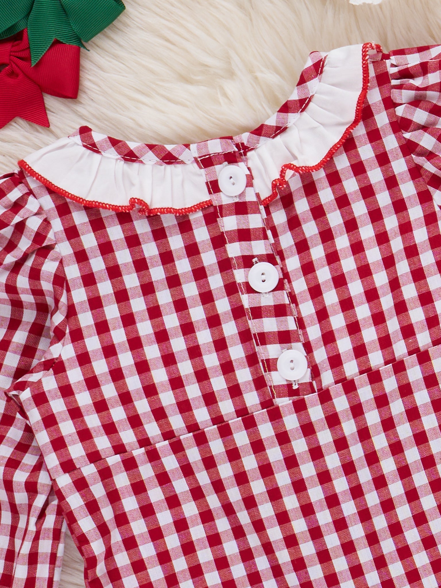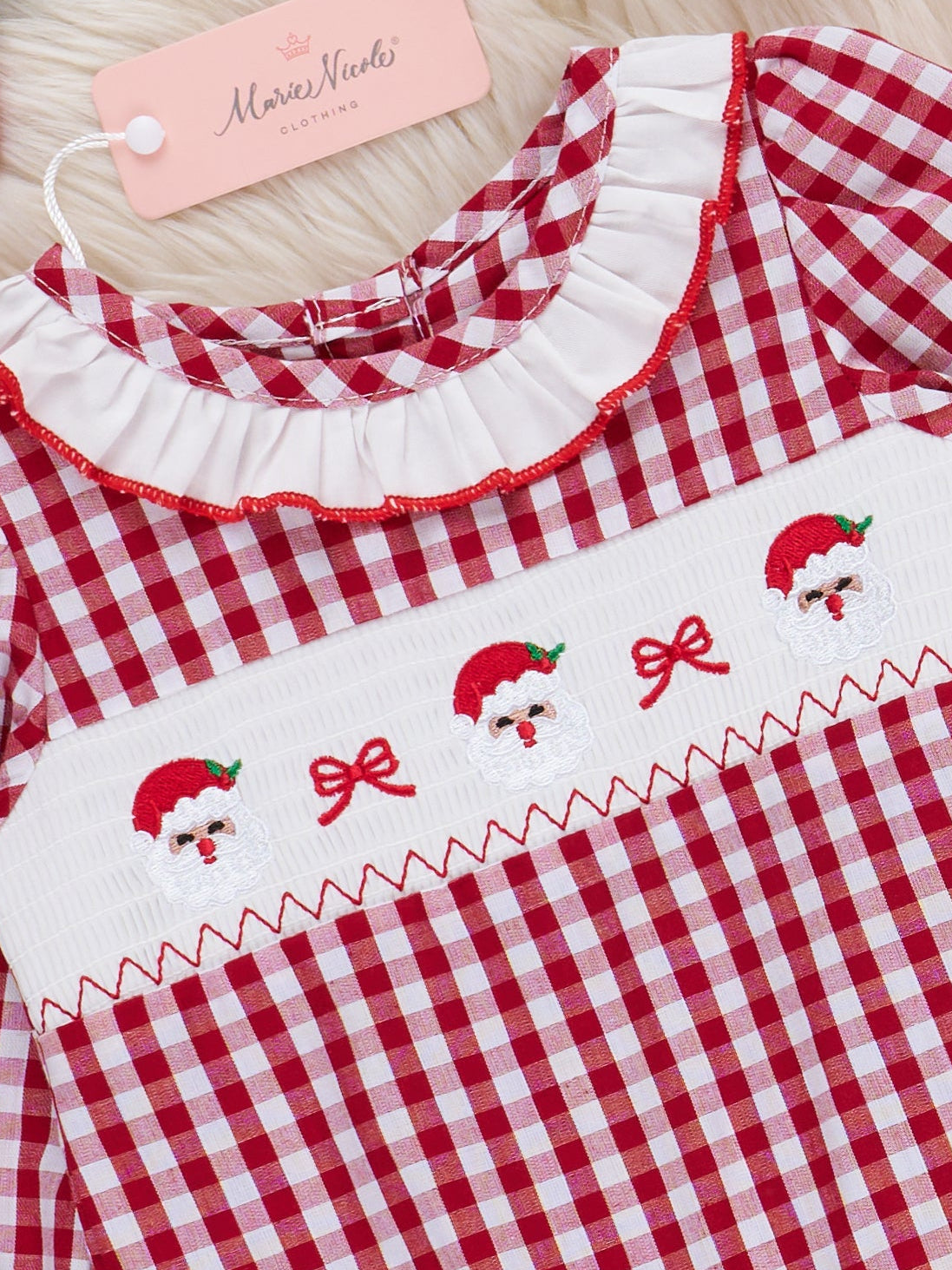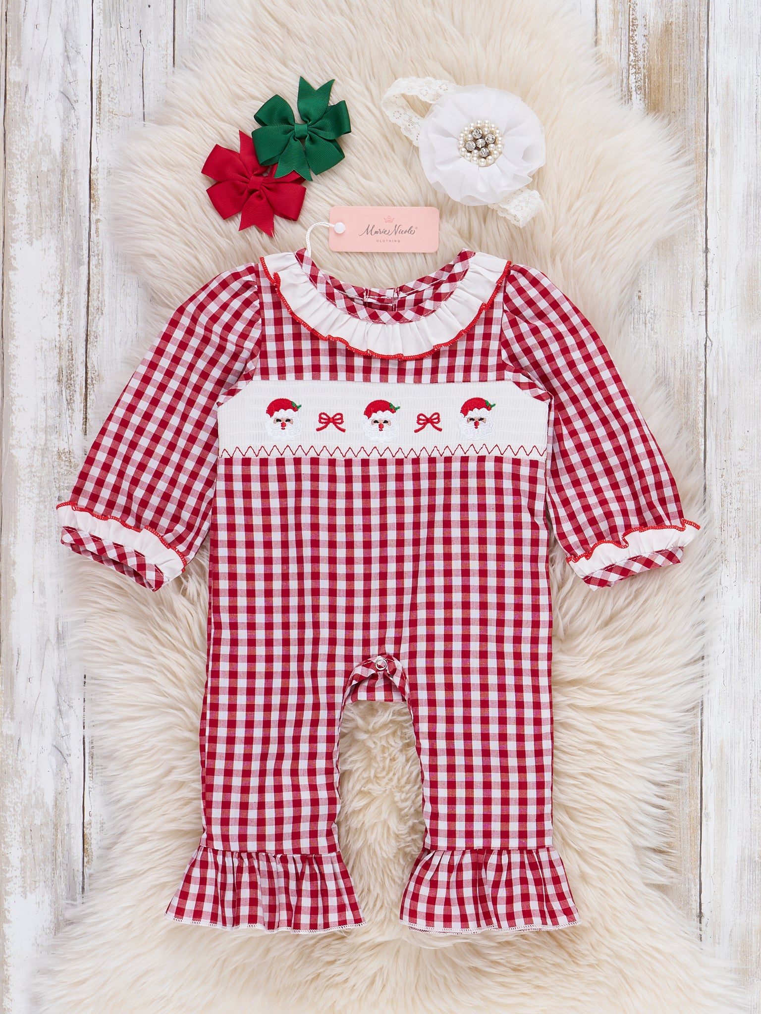 The Moments with Santa Smocked Cotton Romper by Marie Nicole Clothing features a festive plaid pattern with embroidered Santa accents and playful ruffle cuffs. Crafted for comfort and easy dressing, this Christmas romper blends holiday cheer with signature Marie Nicole style.