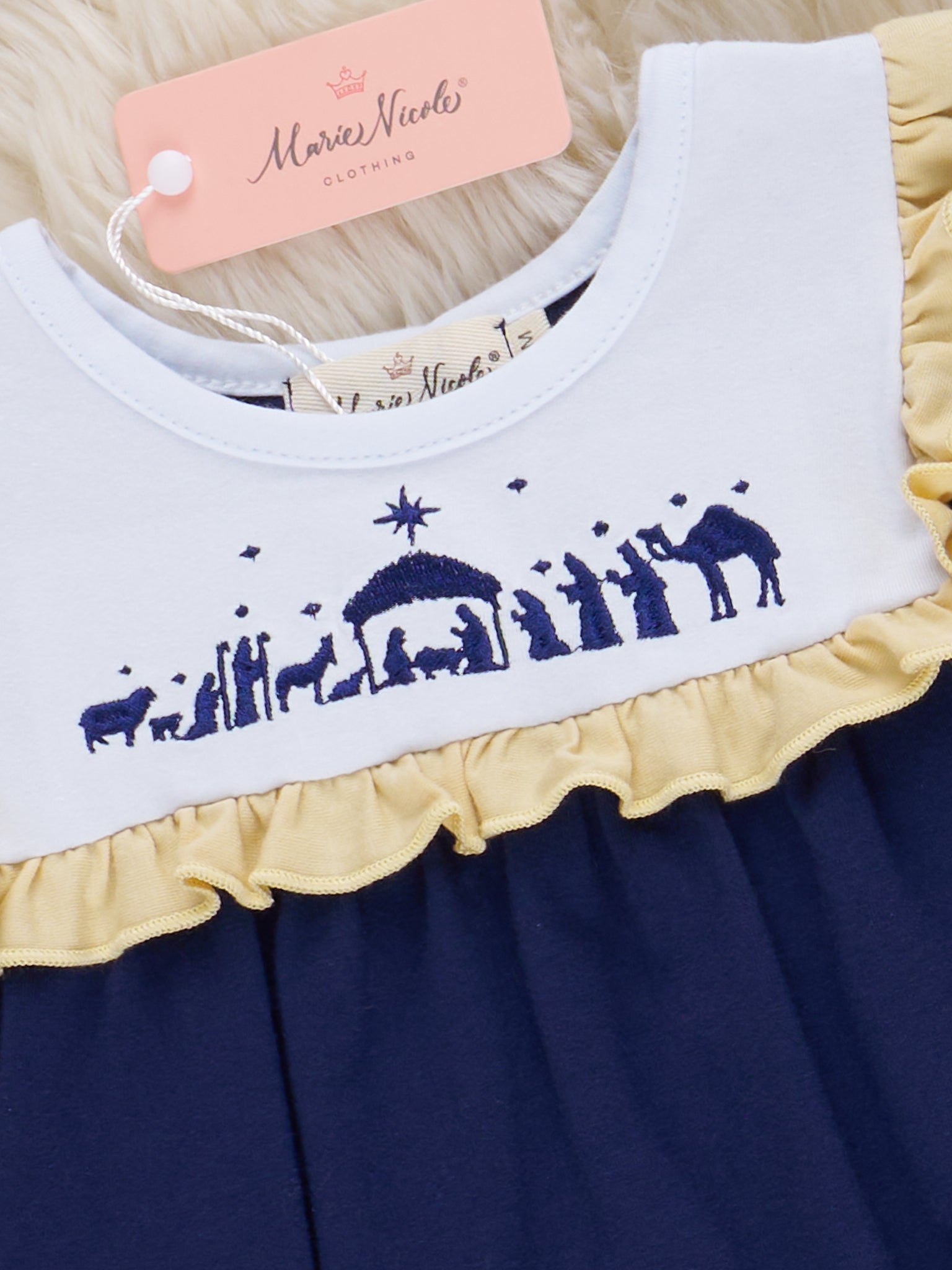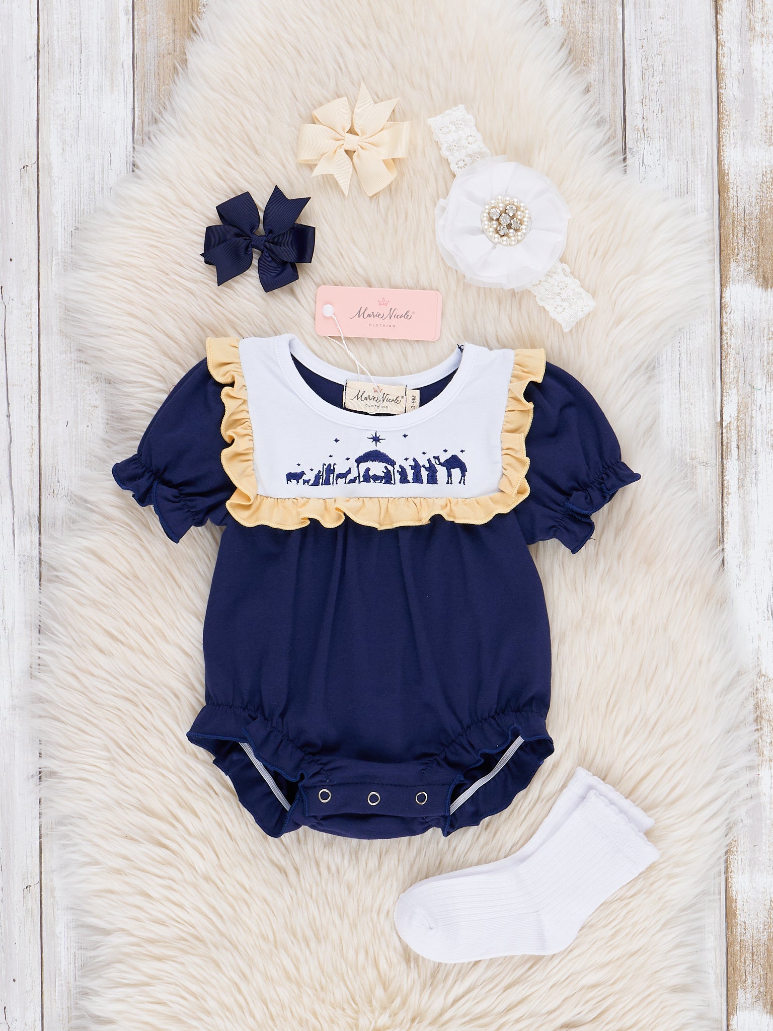 Experience a playful twist on the classic Christmas Nativity with our Nativity Embroidered Ruffle Bubble. Perfect for sisters, this girls bubble features an embroidered Nativity scene on a navy blue bodice with a fun and sweet ruffle trim. Add a touch of whimsy to your holiday wardrobe!
