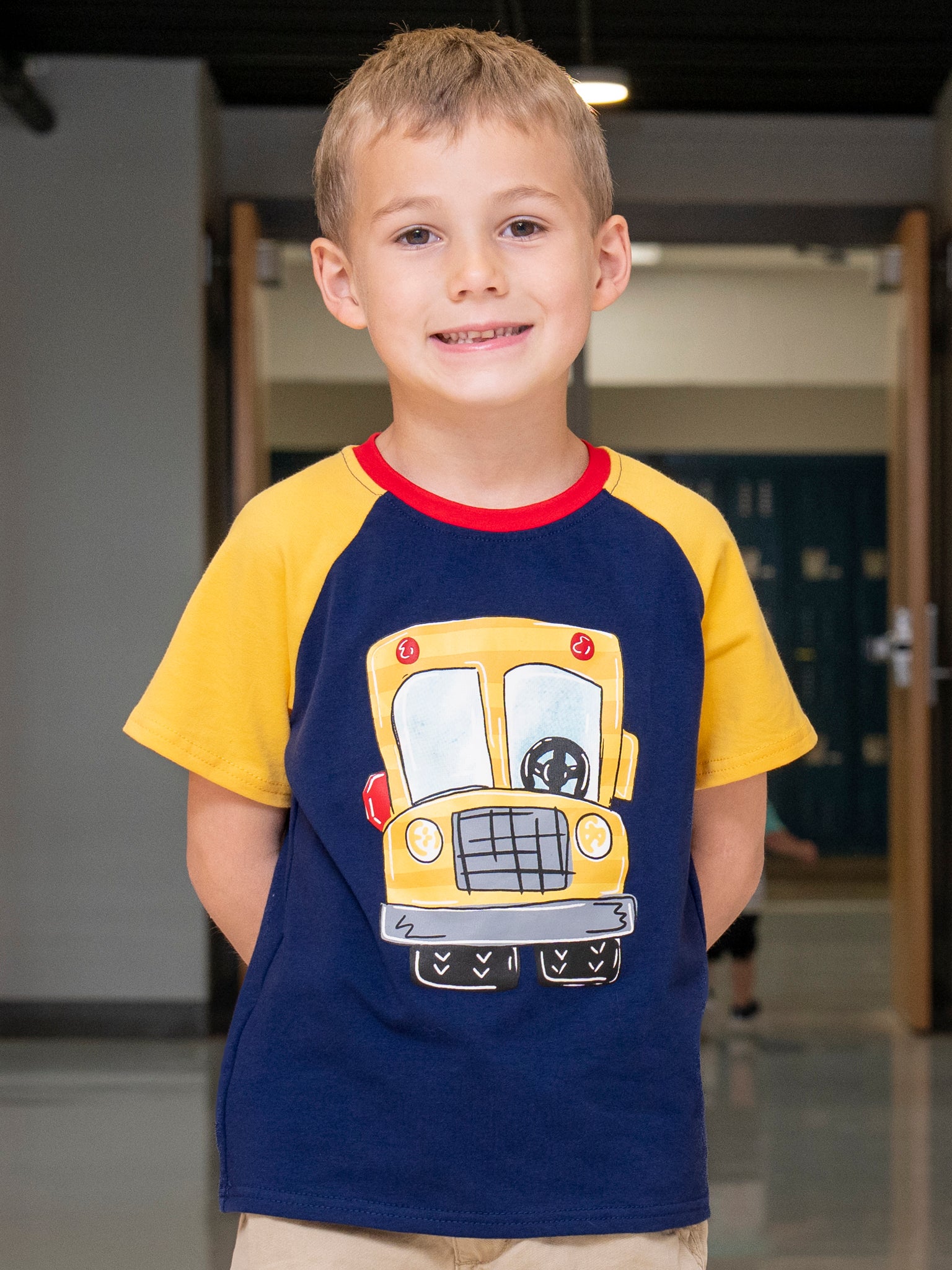 Get your little one ready for school with this playful Navy Wheels on the Bus Raglan Top! Featuring bright yellow raglan sleeves and a fun school bus design, this boys shirt is the perfect addition to their wardrobe. Complete the look with the matching sibling set. Let the back-to-school adventures begin!