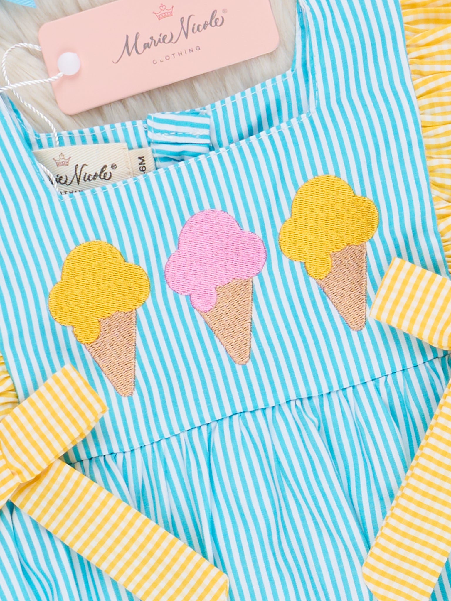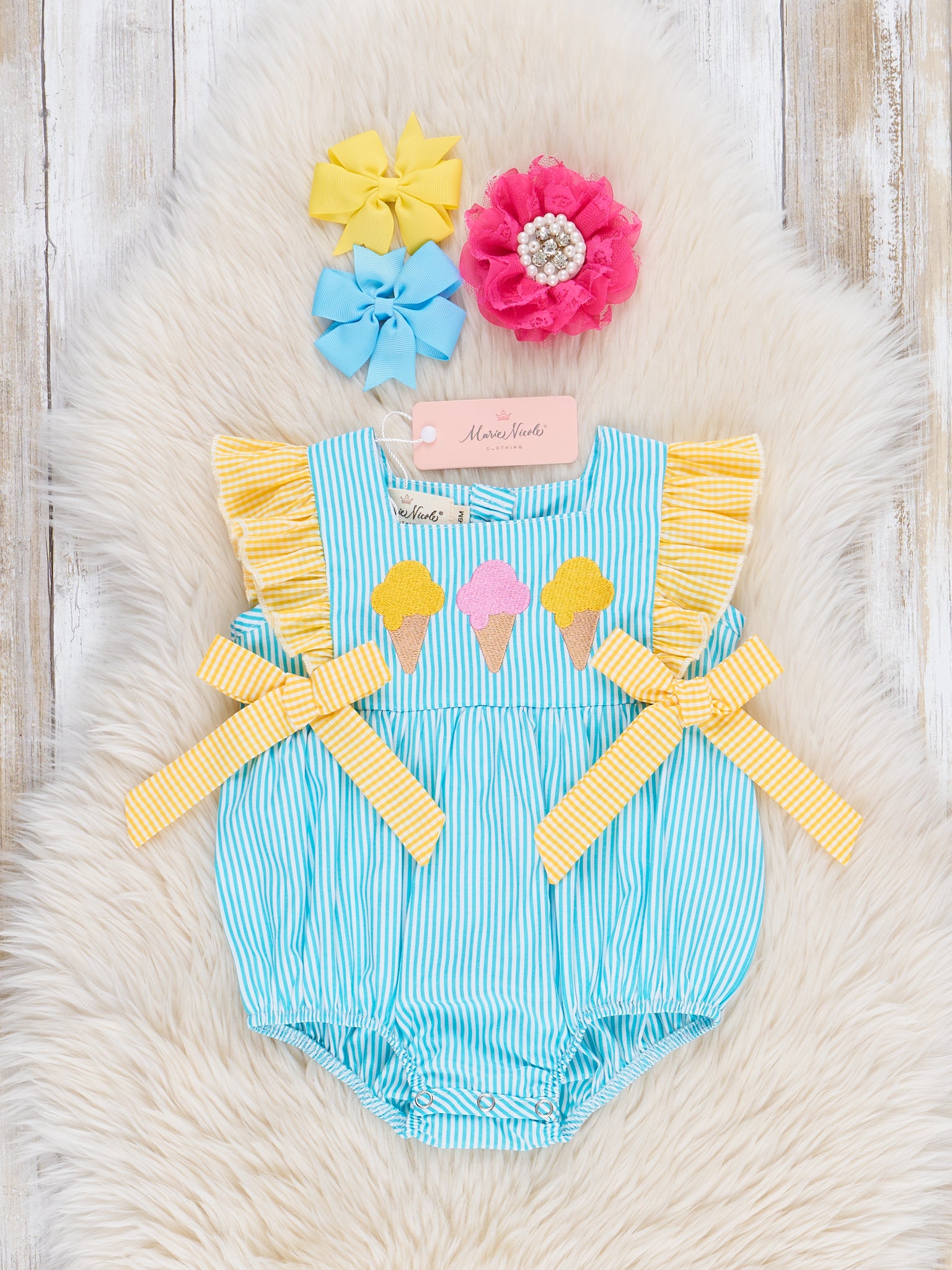 Brighten up summer days with the Neon Ice Cream Cones Ruffle Bubble from Marie Nicole Clothing! This playful bubble features fun ruffle detailing with embroidered ice cream cones that scream sweet summer fun. Made from soft, breathable cotton, it’s perfect for keeping little ones cool and comfy on sunny adventures.