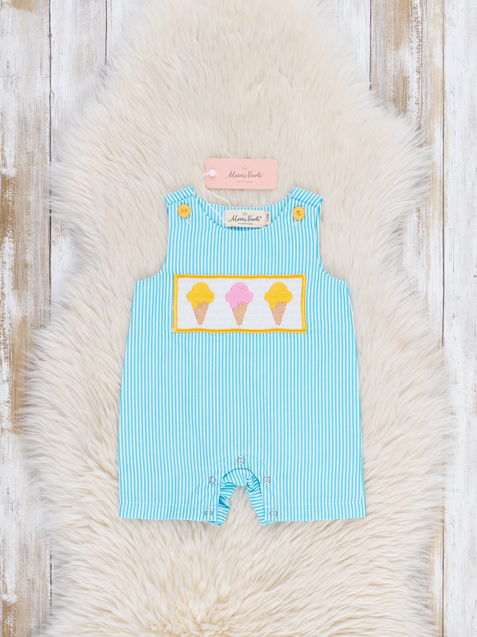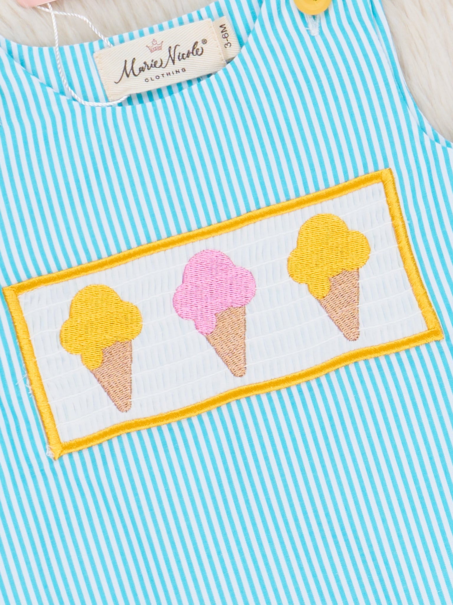 Brighten up summer days with the Neon Ice Cream Cones Smocked Johnny from Marie Nicole Clothing! This playful one-piece features colorful smocked detailing across the chest with embroidered ice cream cones that scream sweet summer fun. Made from soft, breathable cotton, it’s perfect for keeping little ones cool and comfy on sunny adventures.