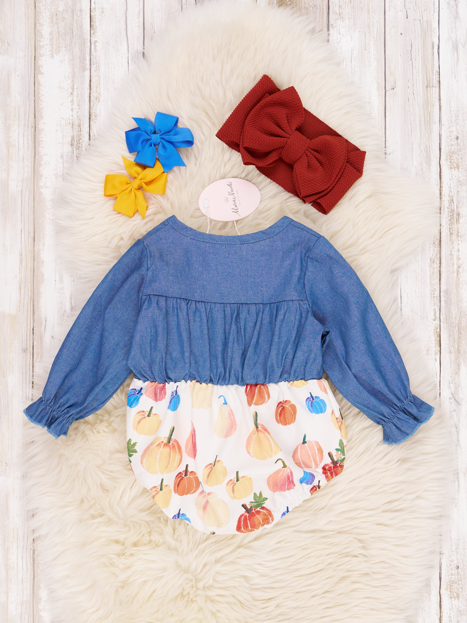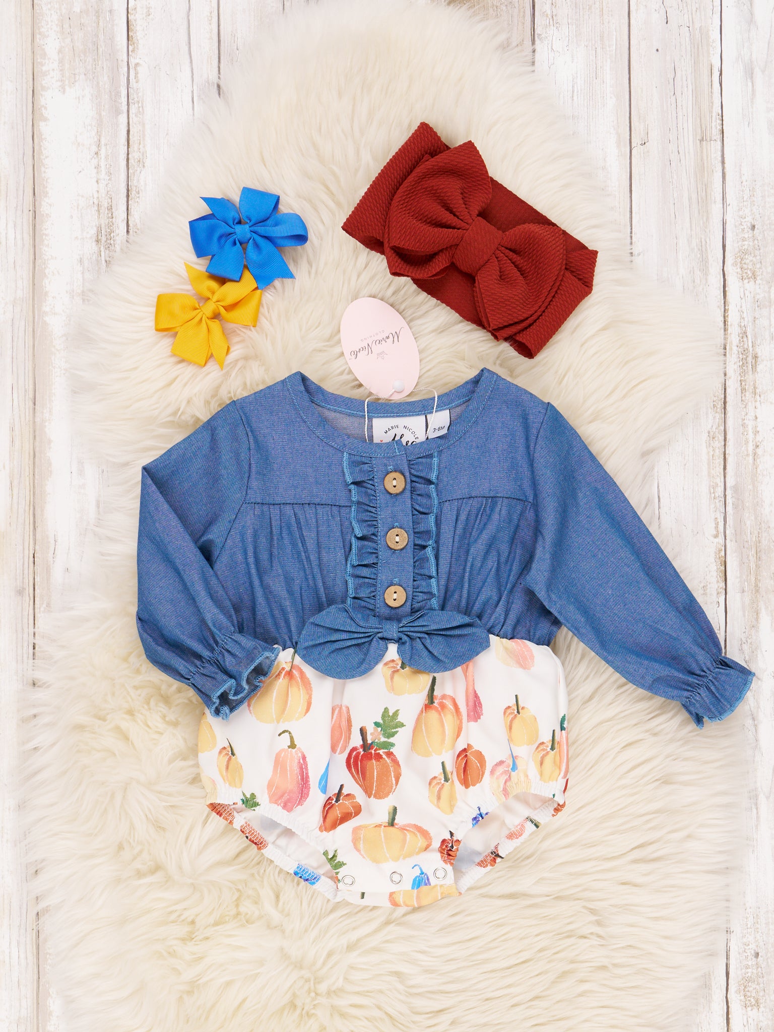 Introducing MNC x LOVE's fall collection: Party Pumpkins! This collection is inspired by the breathtaking hues of autumn. Embrace the charming pumpkin details in shades of vibrant orange, golden yellow, and serene blue. This Party Pumpkins Chambray Bubble Romper is the perfect outfit for any fall occasion. It has cute wooden buttons, cinched sleeves, a cozy chambray top, and a non-functioning but adorable bow detail - all topped off with some party pumpkins details!