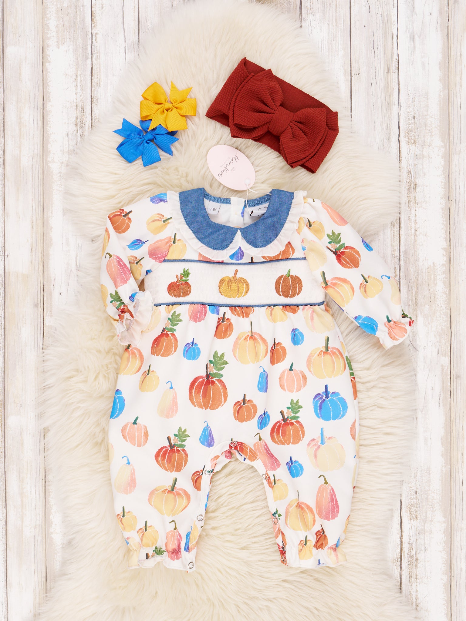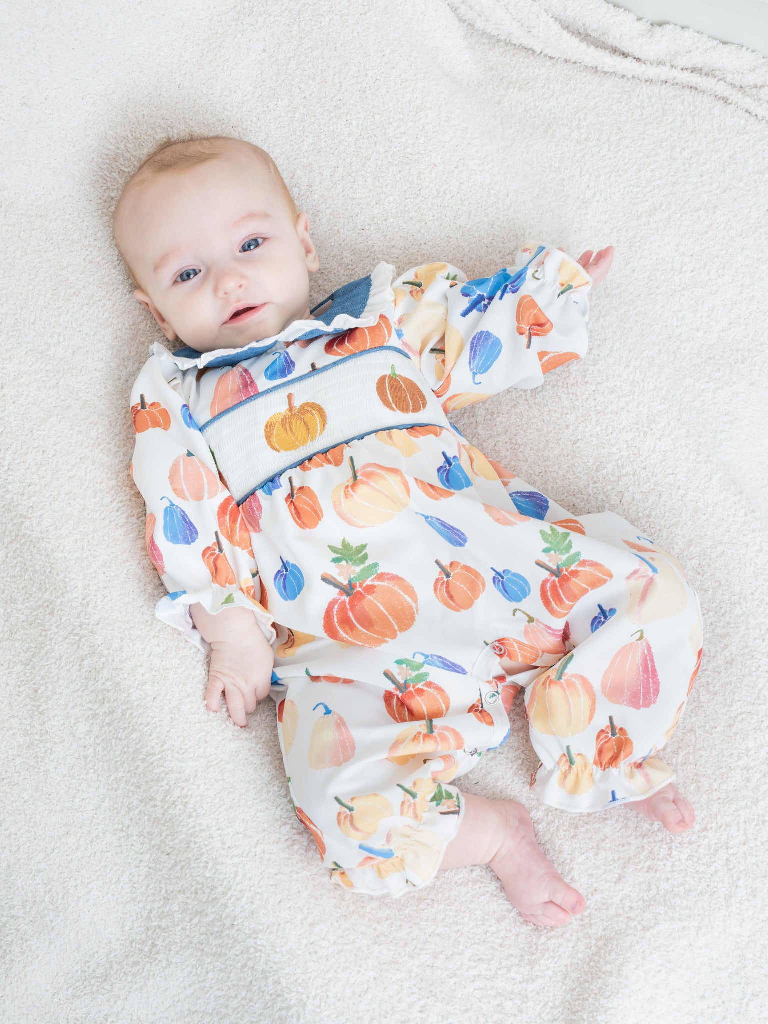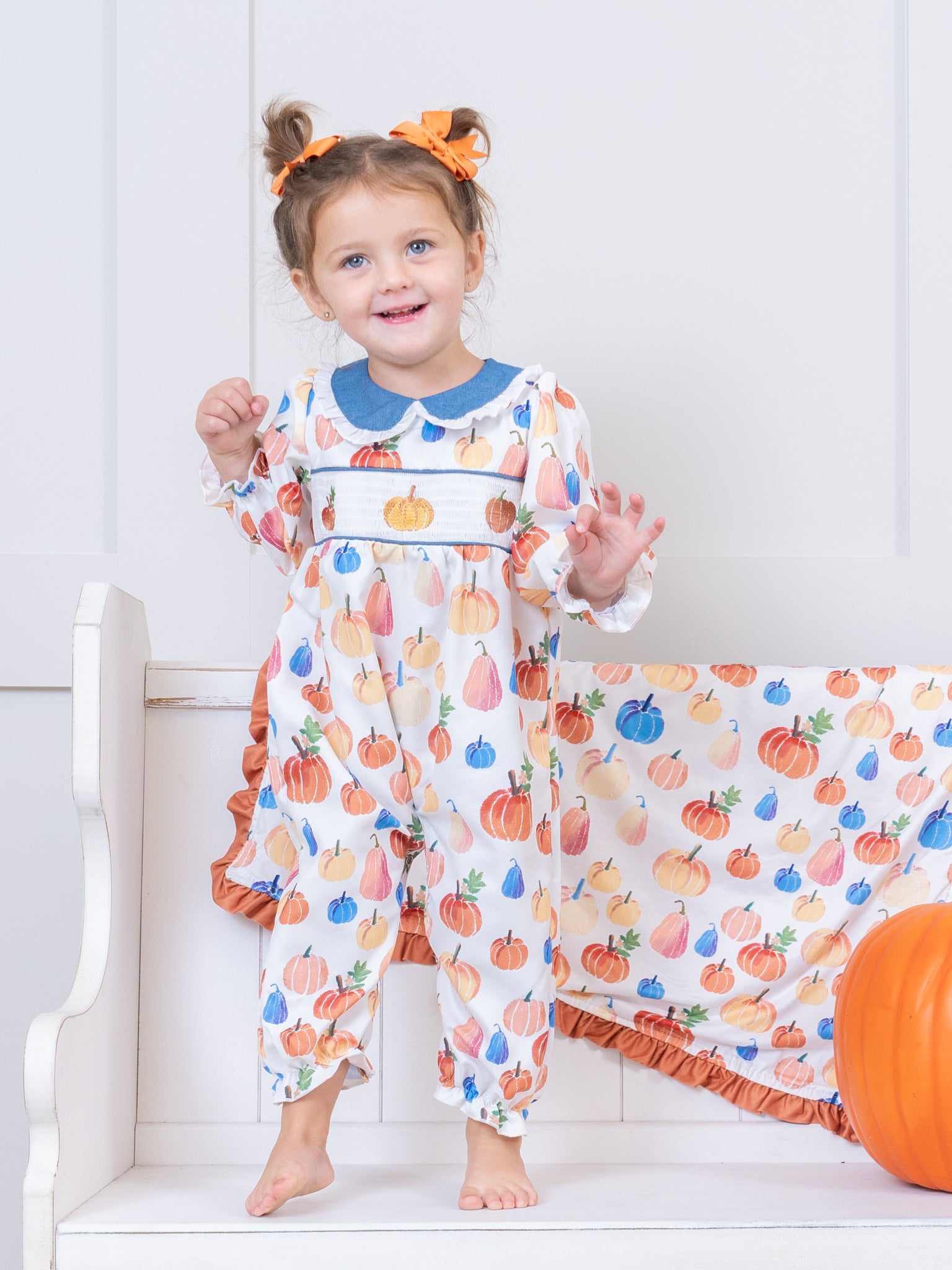 Introducing MNC x LOVE's fall collection: Party Pumpkins! This collection is inspired by the breathtaking hues of autumn. Embrace the charming pumpkin details in shades of vibrant orange, golden yellow, and serene blue. This Party Pumpkins Chambray Ruffle Romper has all the style your little one needs - complete with a Peter pan collar, smocking with embroidered pumpkin details, and functioning wooden buttons down the back. It's long-sleeved and cinched at the sleeves and ankles for a cozy fall look that'll keep your little one festival-ready!