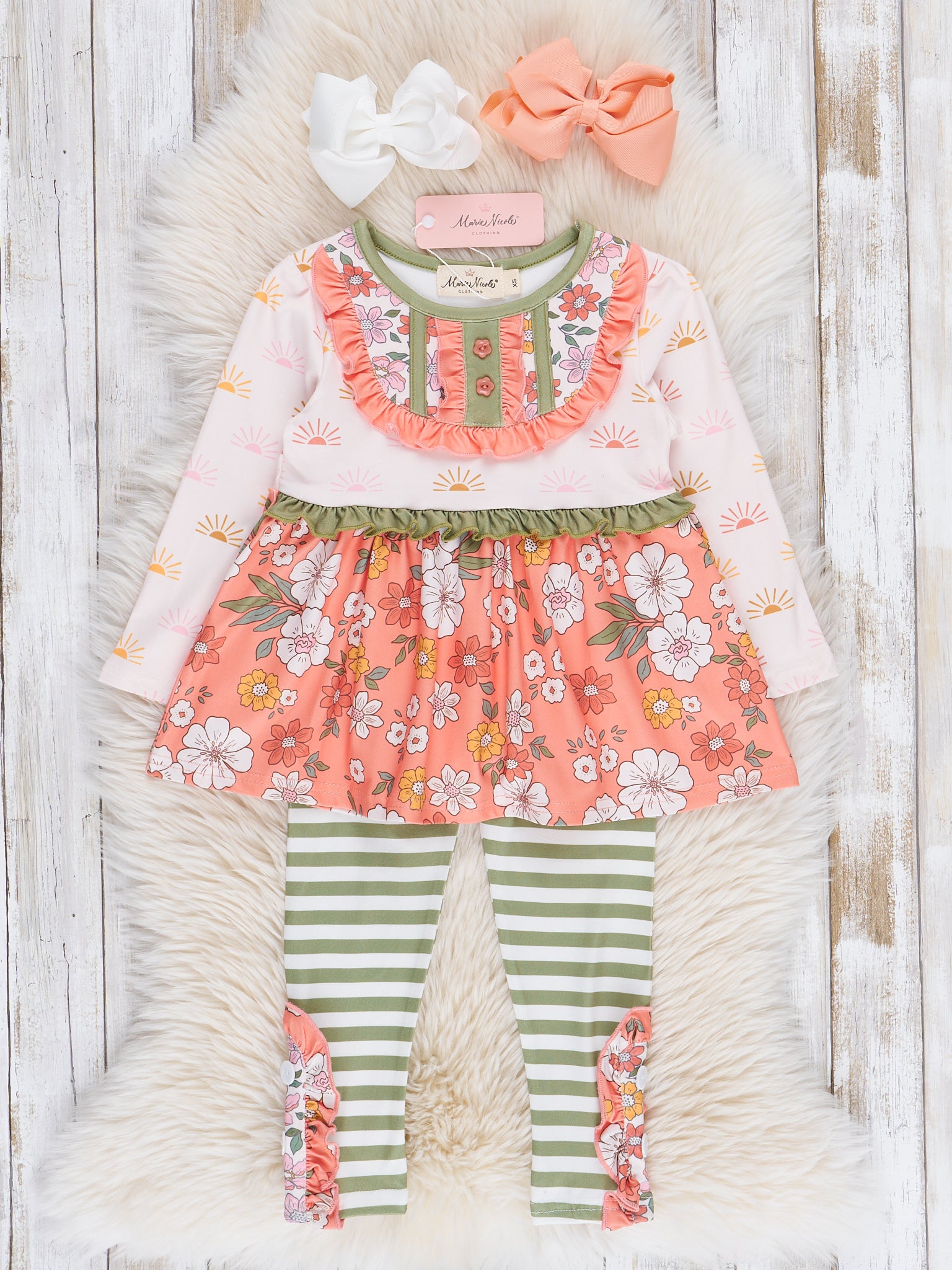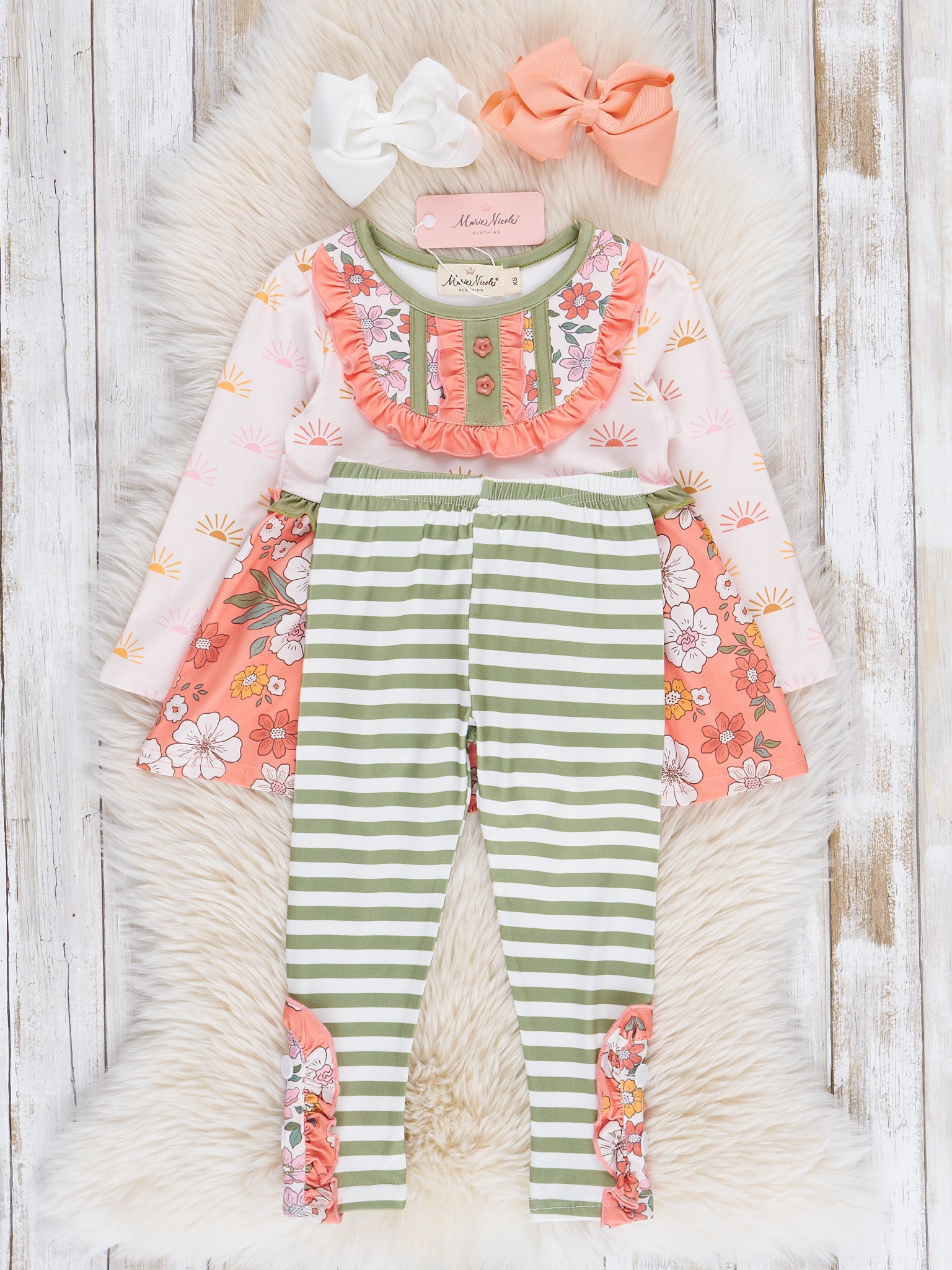 This adorable outfit features a peach garden & sunshine print with olive green ruffle detail paired with olive striped leggings. Perfect for any little girl, it also comes in a sister set for matching outfits. Bring some fun and color to your child's wardrobe with the Peach & Green Daisy Garden Ruffle Outfit.