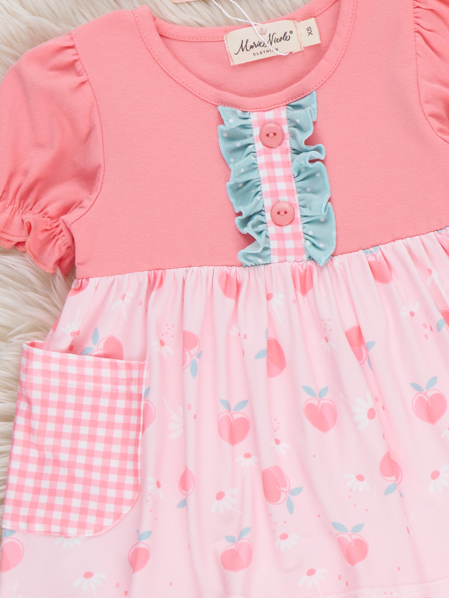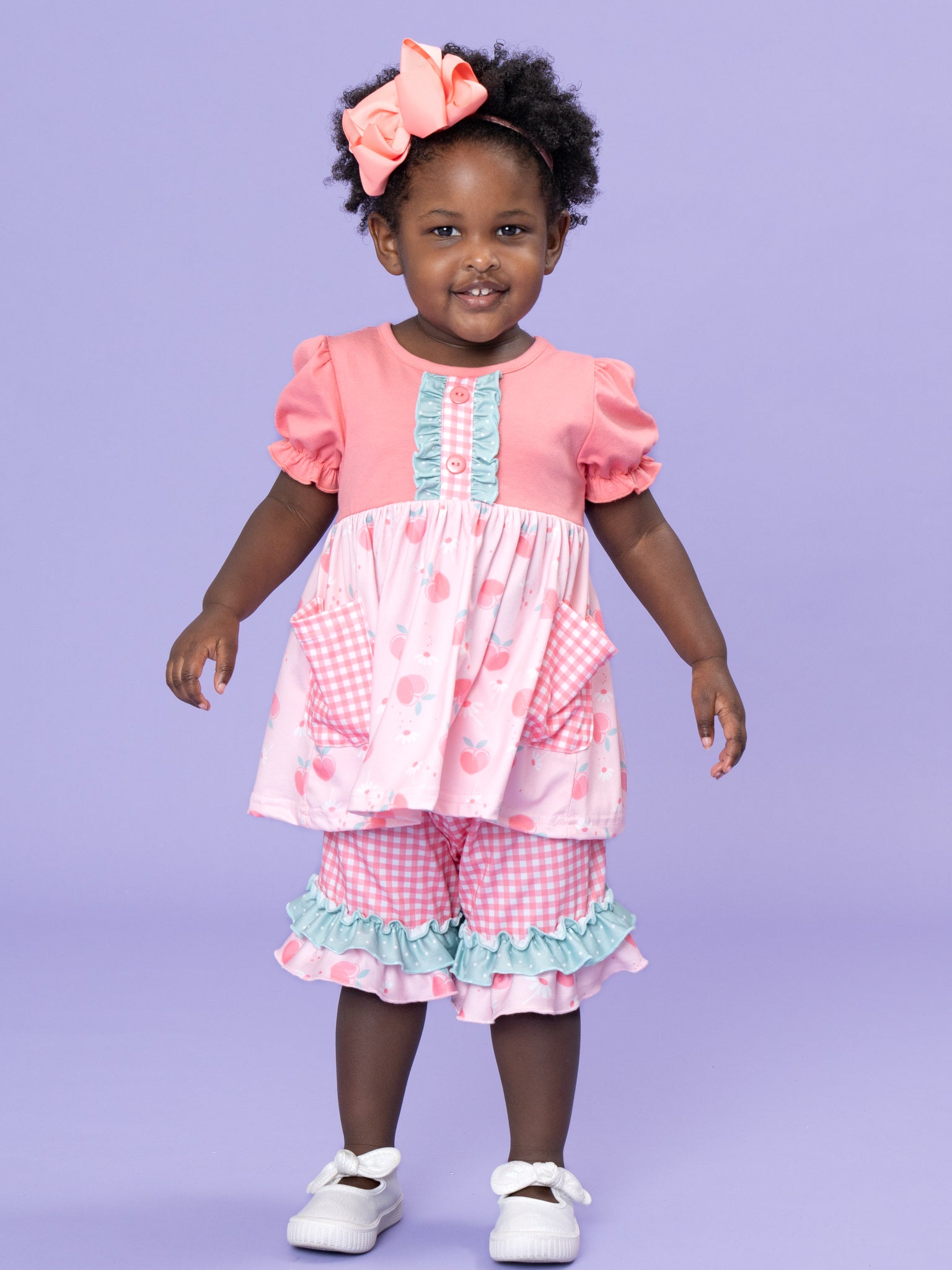 The Peachy Dreams Ruffle Outfit by Marie Nicole Clothing combines comfort with a touch of whimsy. Featuring a playful peach print and ruffled accents, the top pairs perfectly with the gingham shorts, offering both style and ease. Ideal for sunny days and casual outings, this outfit is a delightful choice for little ones.