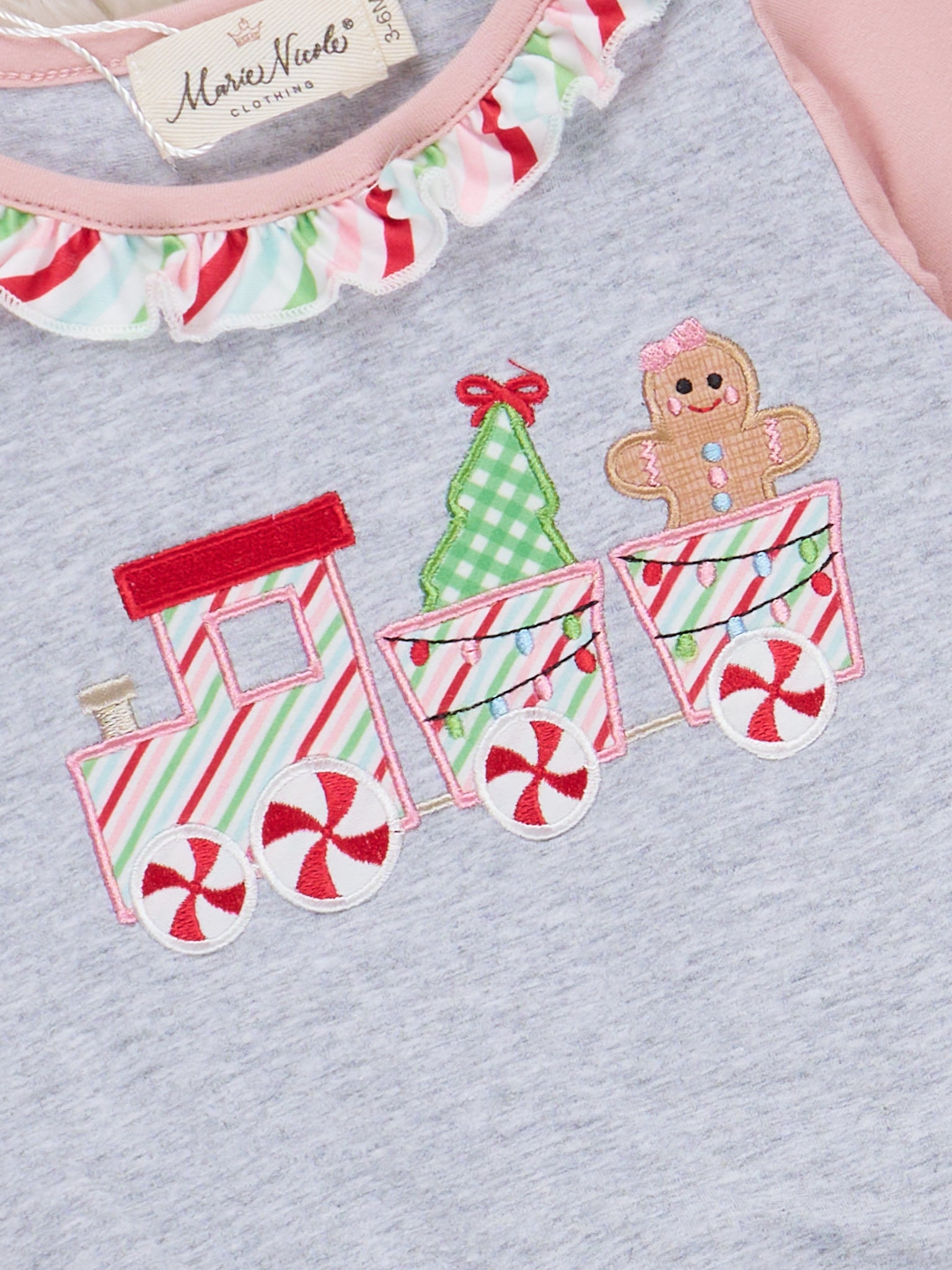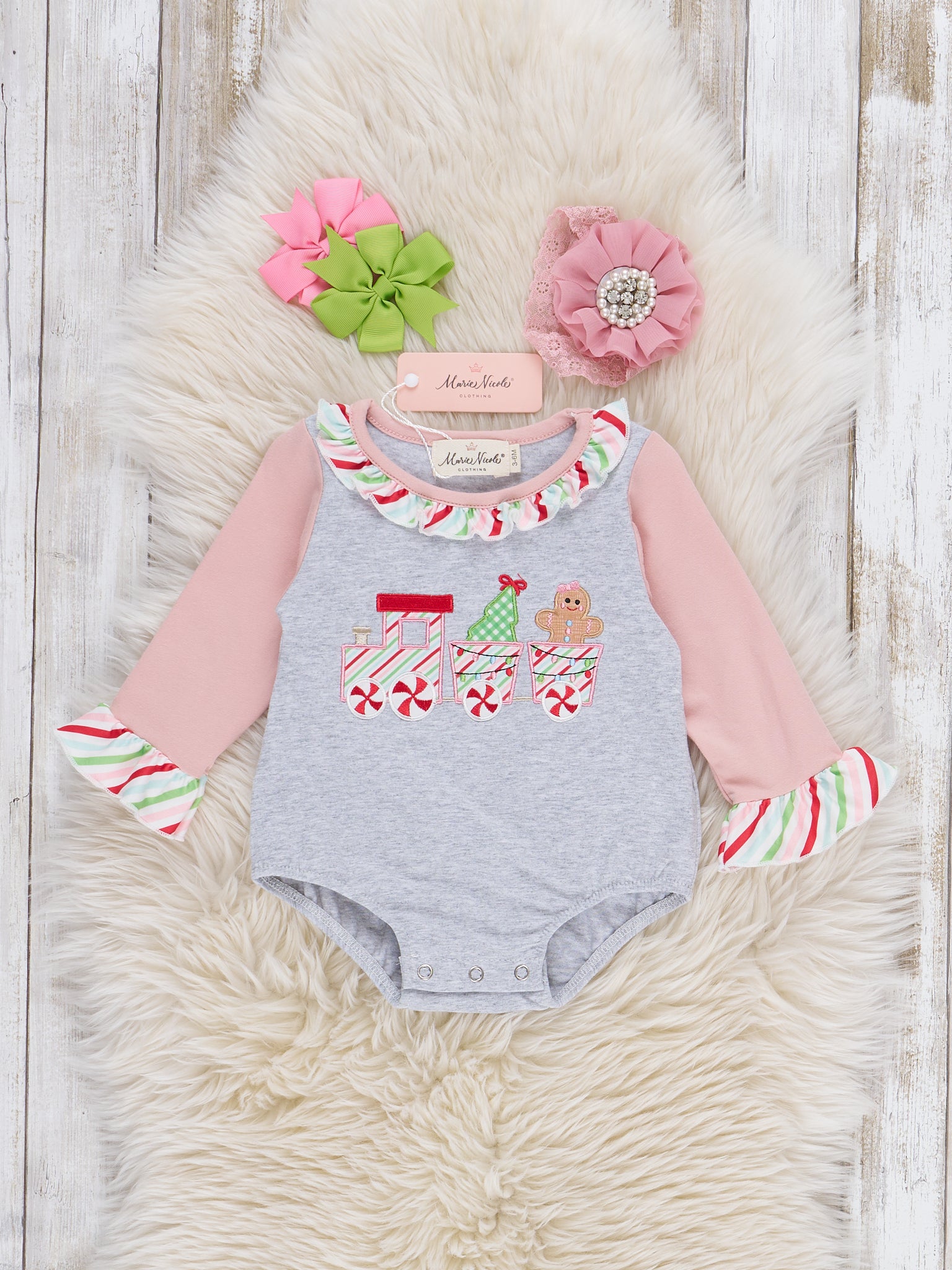 The Peppermint Trim Ruffle Romper Romper by Marie Nicole Clothing is an adorable, festive outfit designed to bring holiday cheer. With its charming holiday-themed accents and soft, comfortable fabric, this romper is perfect for family gatherings, holiday photo shoots, or cozying up during the festive season. A must-have for your little one's wardrobe.
