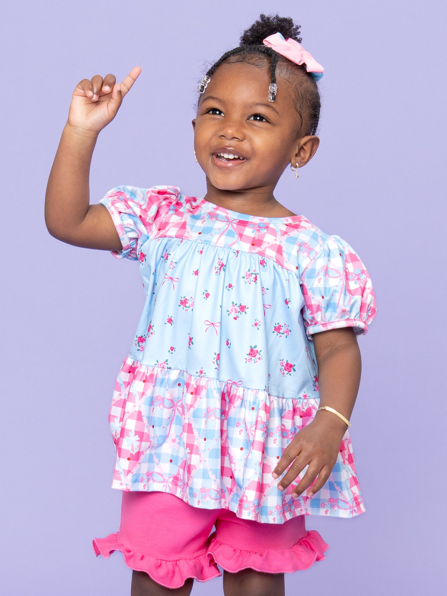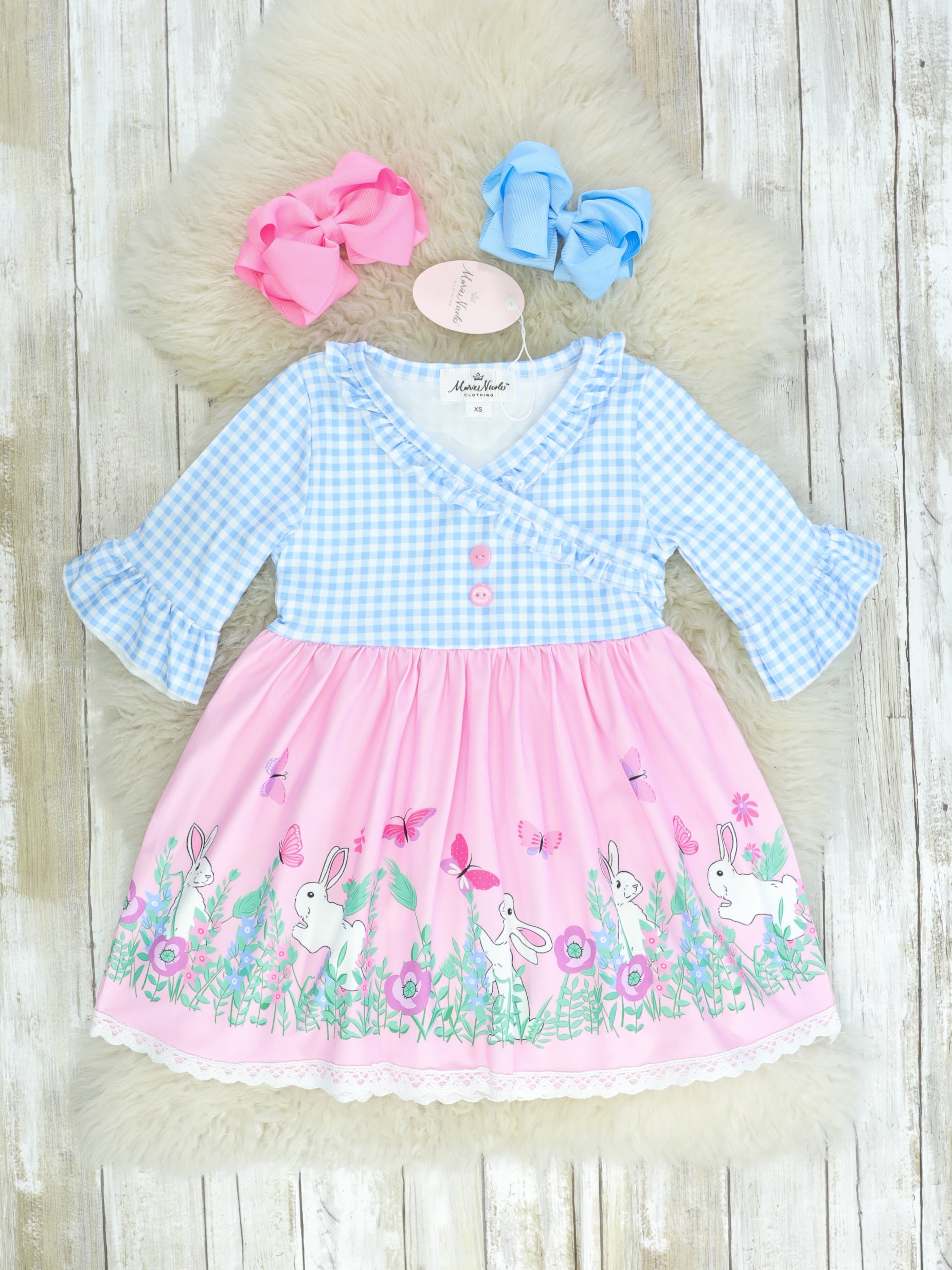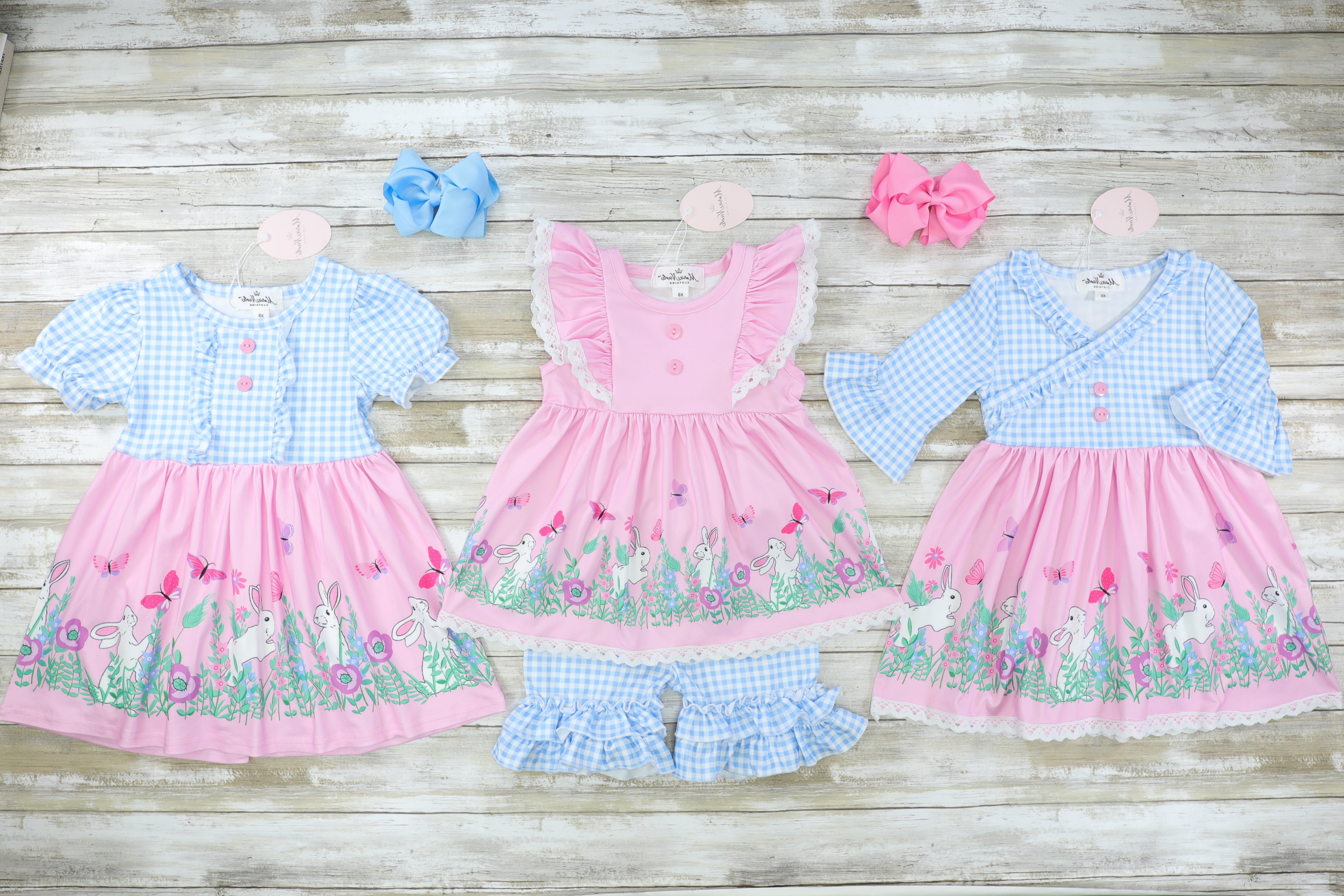 This sister set features the prettiest Spring scene details! This dress includes ruffles; bunny, butterfly and greenery details; and blue & white checks.