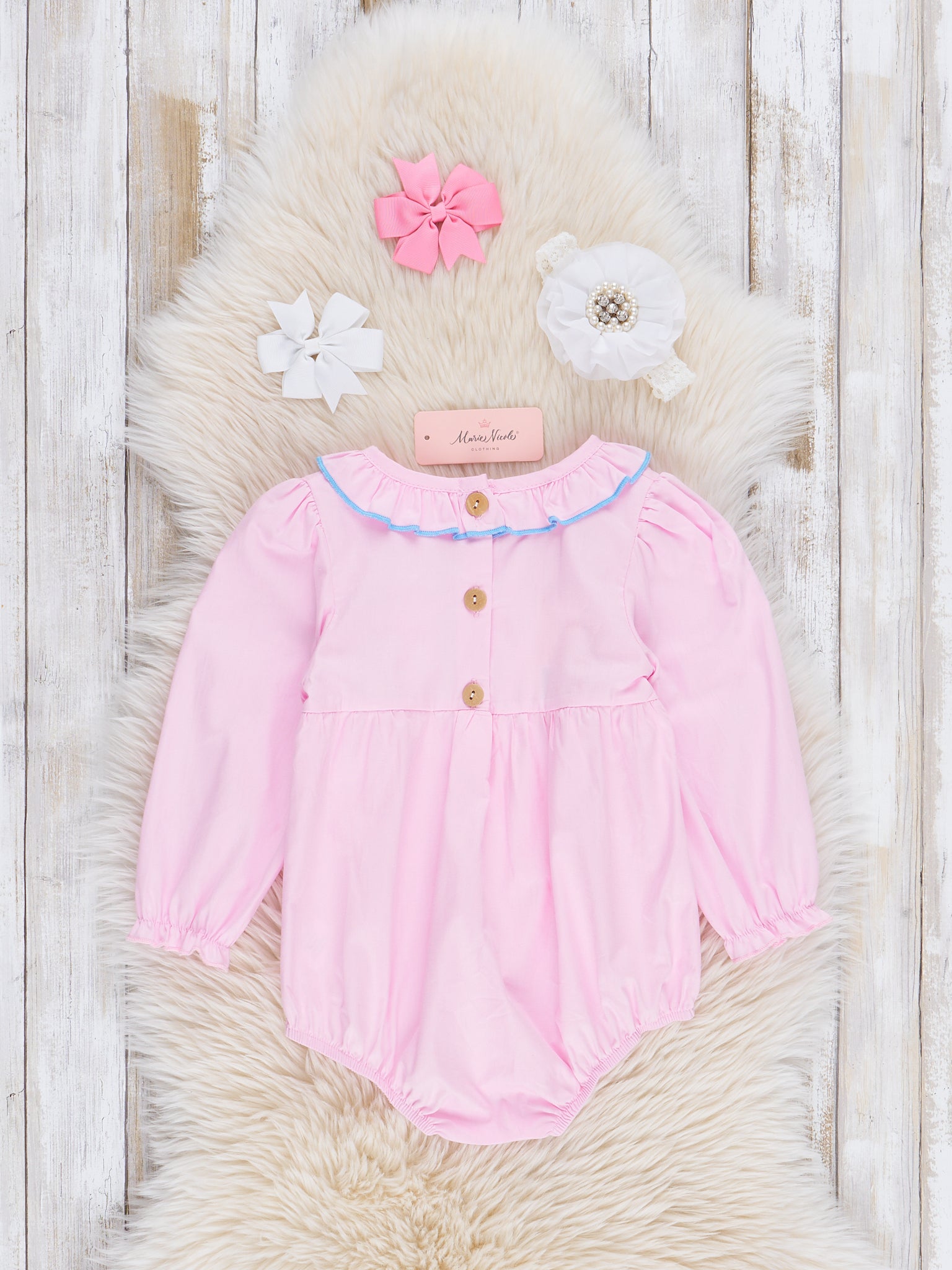 Get the party started with our Pink Cotton Birthday Party Bubble ! Made with 100% cotton, this girls bubble features an embroidered birthday party motif and a cute ruffle trim collar. With a button back closure for easy dressing and a sister set option, this bubble is perfect for any birthday celebration. Let your little one stand out in style and comfort!