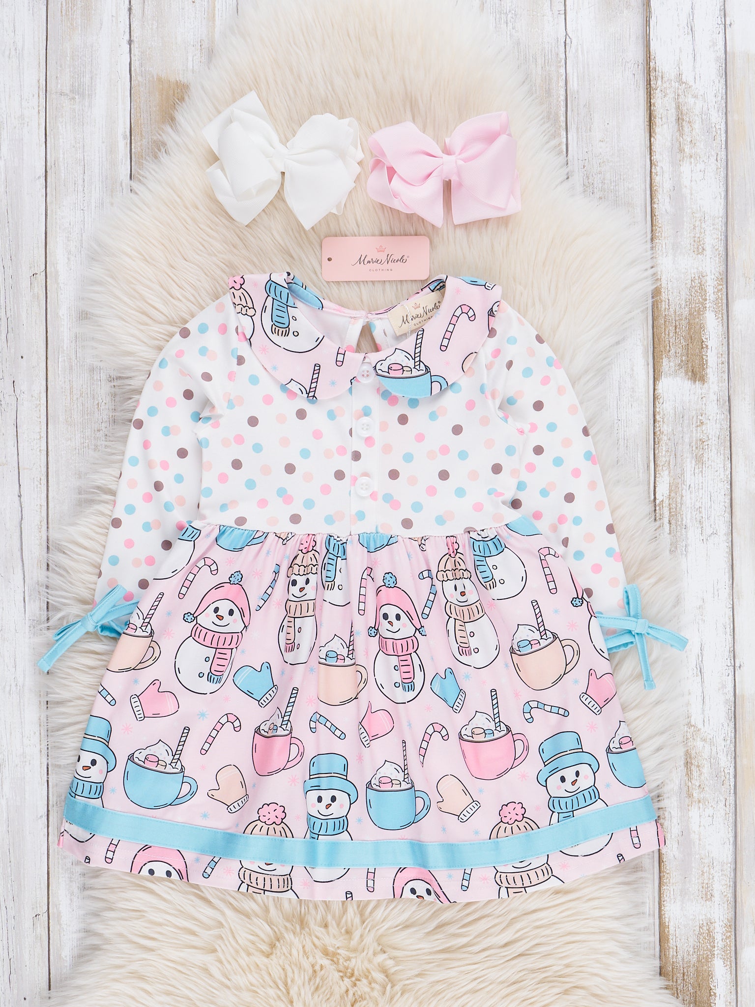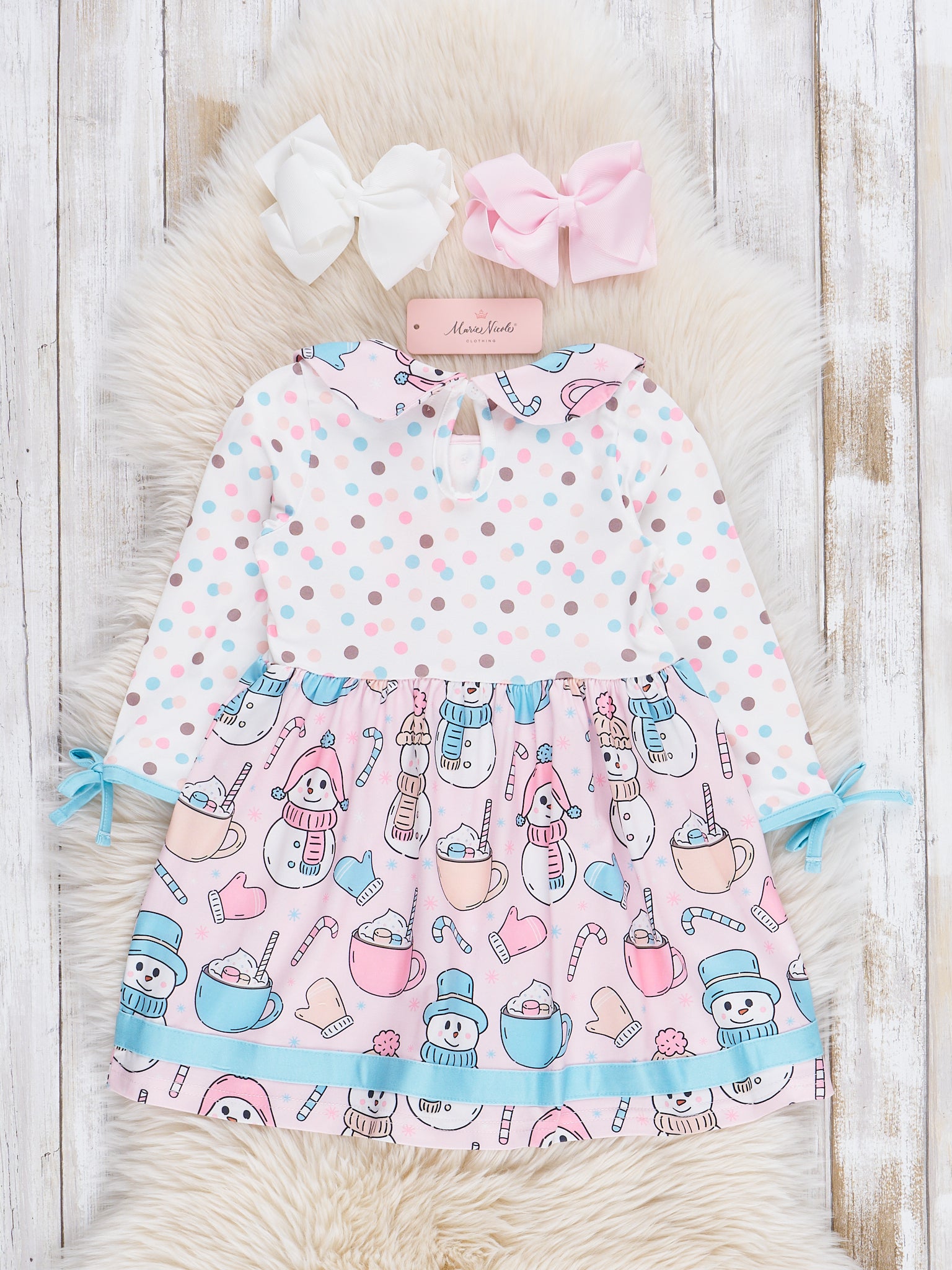 Get dressed for the holidays with our Pink Dots & Snowmen Dress, perfect for sisters to match! The polka dot bodice adds a touch of playfulness, while the snowmen and cocoa printed skirt will have you ready for Christmas in style.