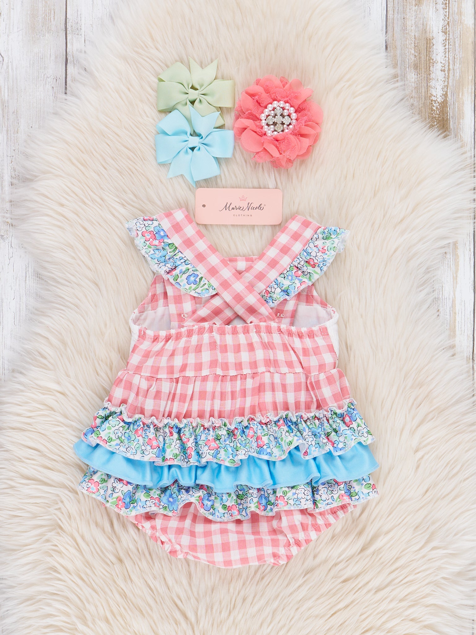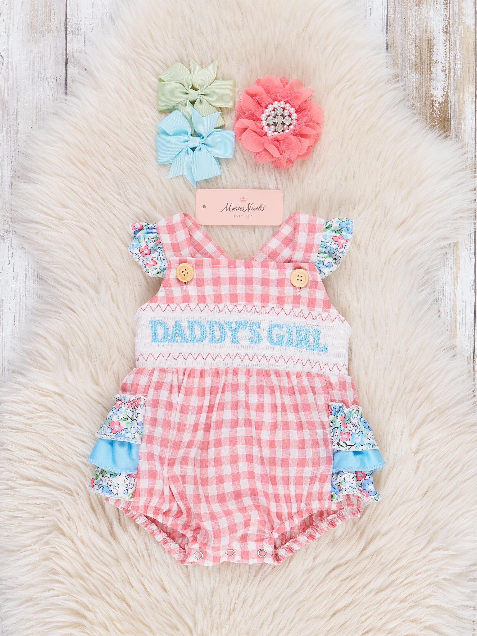 Get ready for some serious cuteness with our Pink Gingham Mama's Girl Smocked Ruffle Bubble! This adorable sister set features a classic pink gingham print, delicate floral ruffle trim, and embroidered "Daddy's Girl" message over the smocking. Your little one will be the center of attention in this playful and charming bubble.