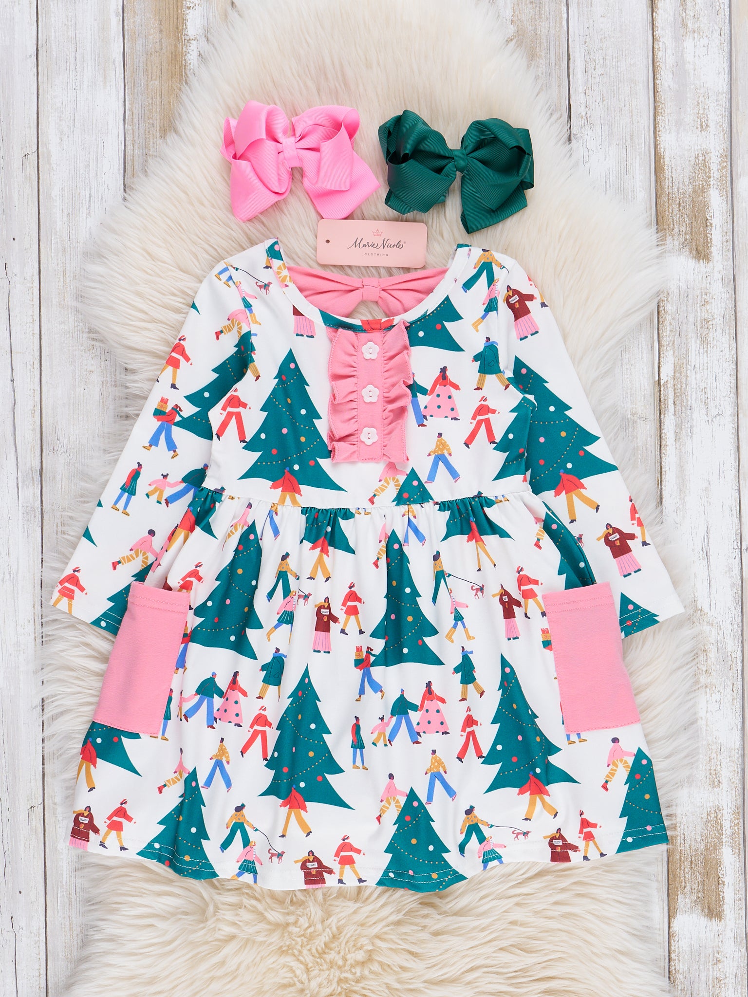 Get ready for a whimsical winter adventure with our Pink & Green Winter Wonderland Ruffle Dress! This delightful girls dress features a playful winter wonderland print and charming pink pockets & ruffle trim. Complete with a bow back detail, this sister set is perfect for spreading holiday cheer.