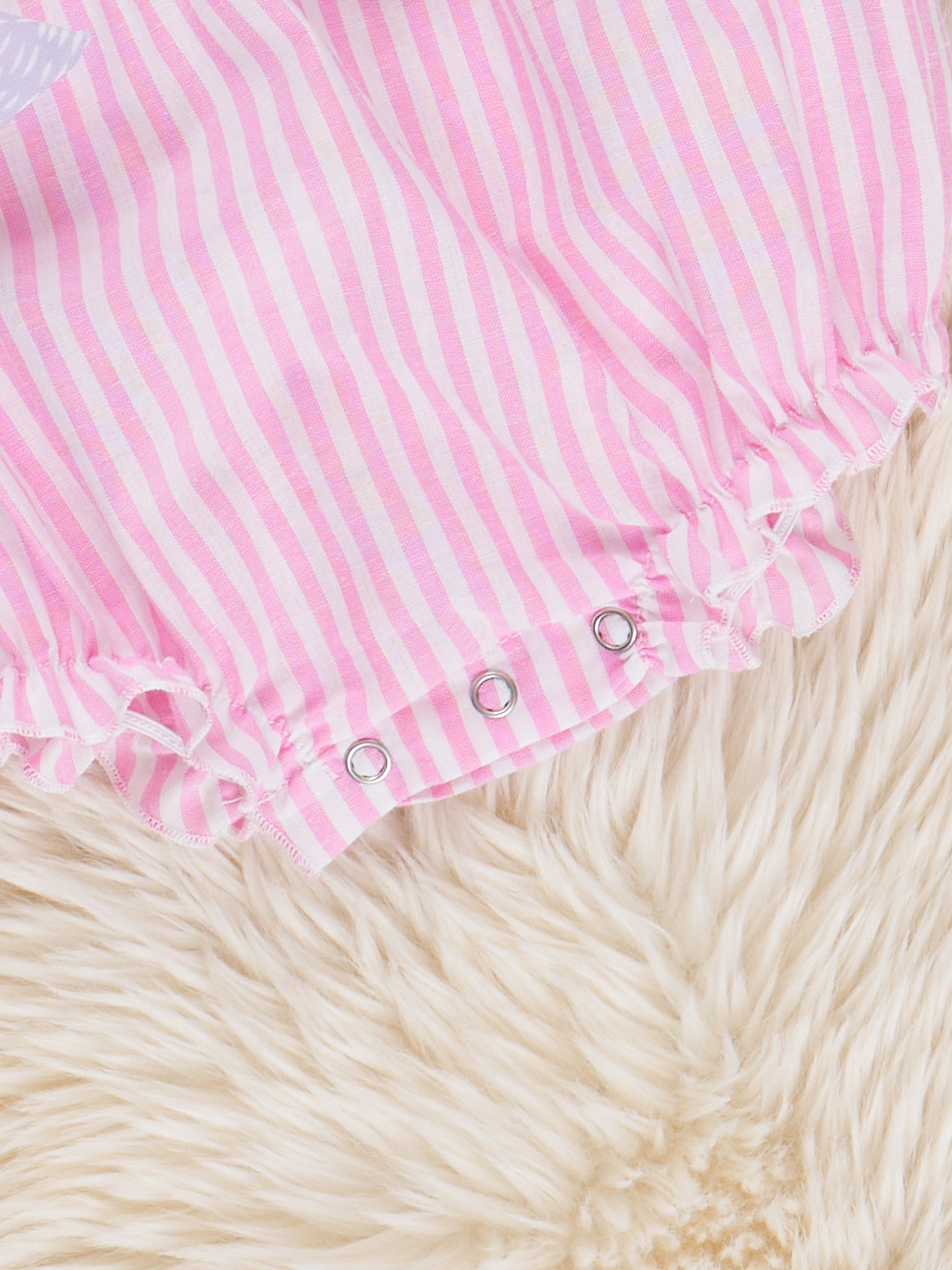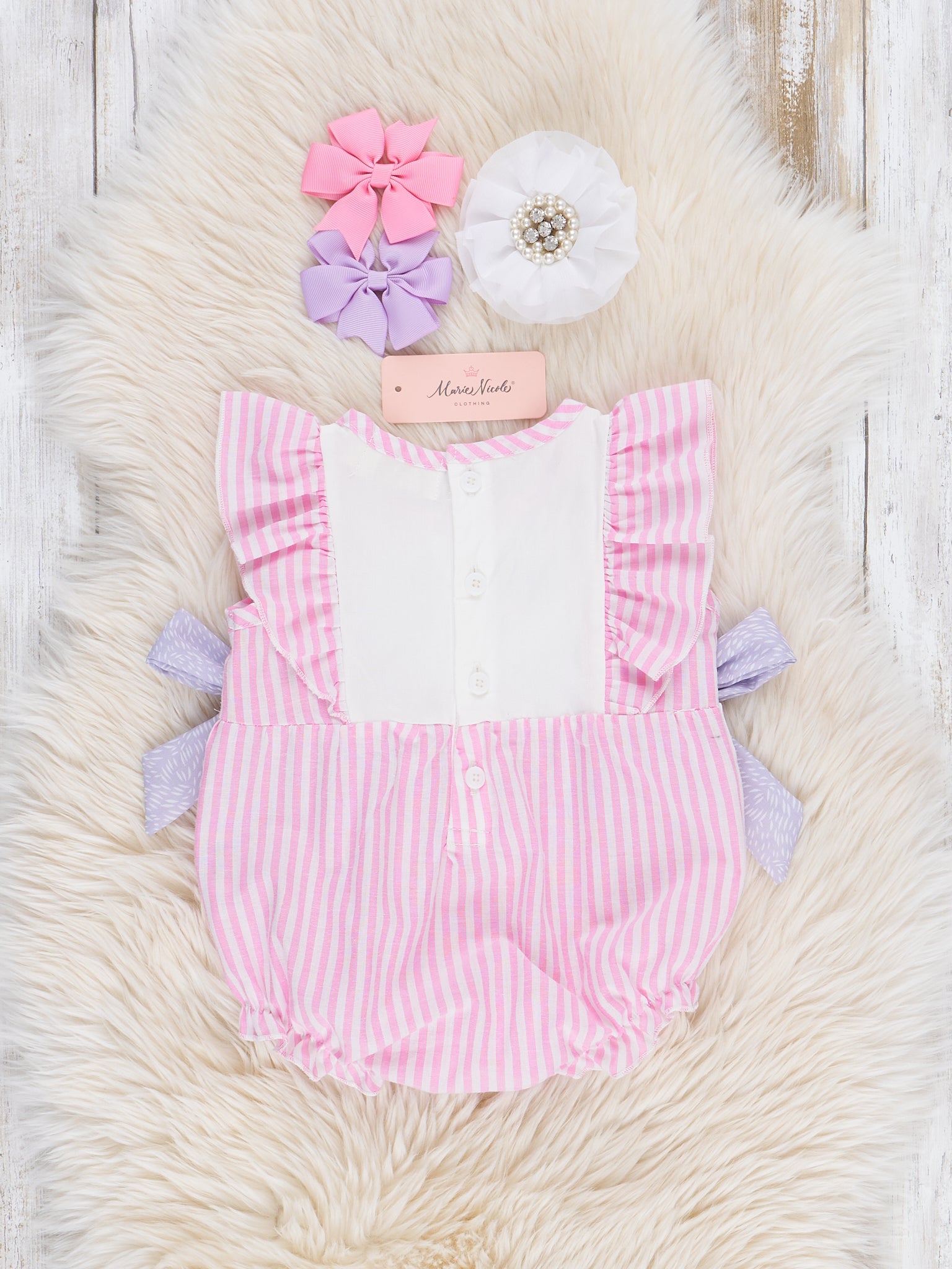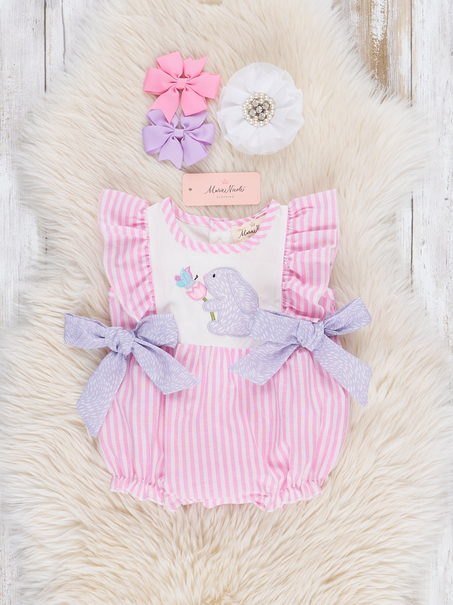 An elegant sister set for your girls who love pink! This bubble by Marie Nicole Clothing features pink pinstripes, a darling bunny appliqué, flutter sleeves, ruffles, & bow details.