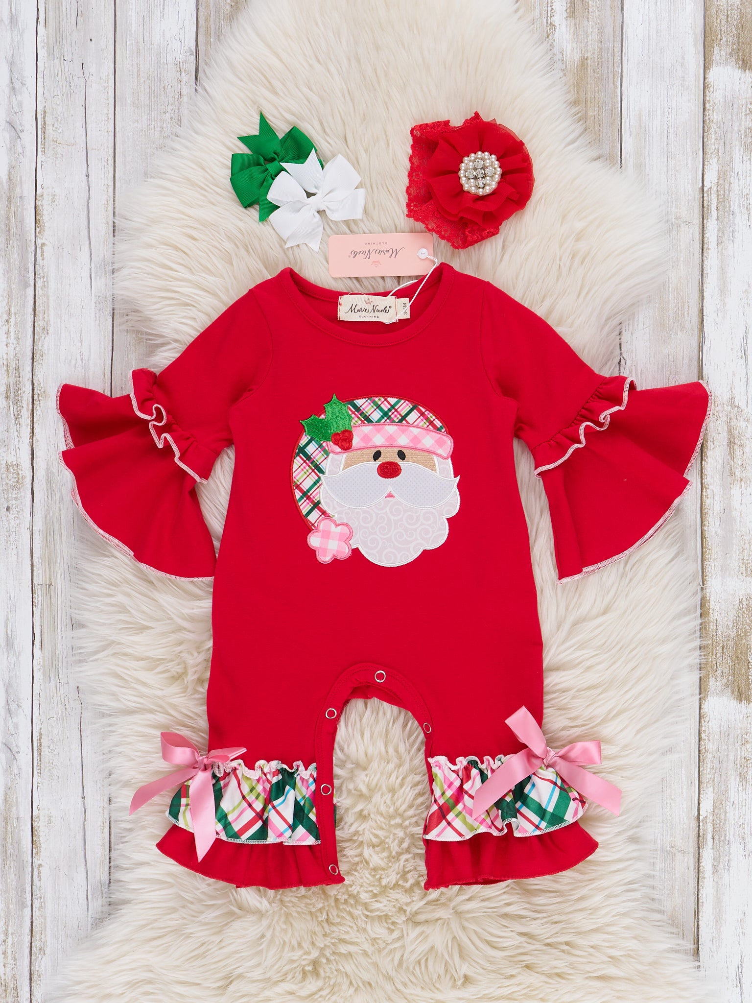Get ready to sleigh in style with our Pink & Red Santa Plaid Ruffle Romper! This girls romper features a festive red bell sleeve bodice with an embroidered Santa, paired with trendy plaid ruffle legs. Perfect for sisters to match and spread holiday cheer!