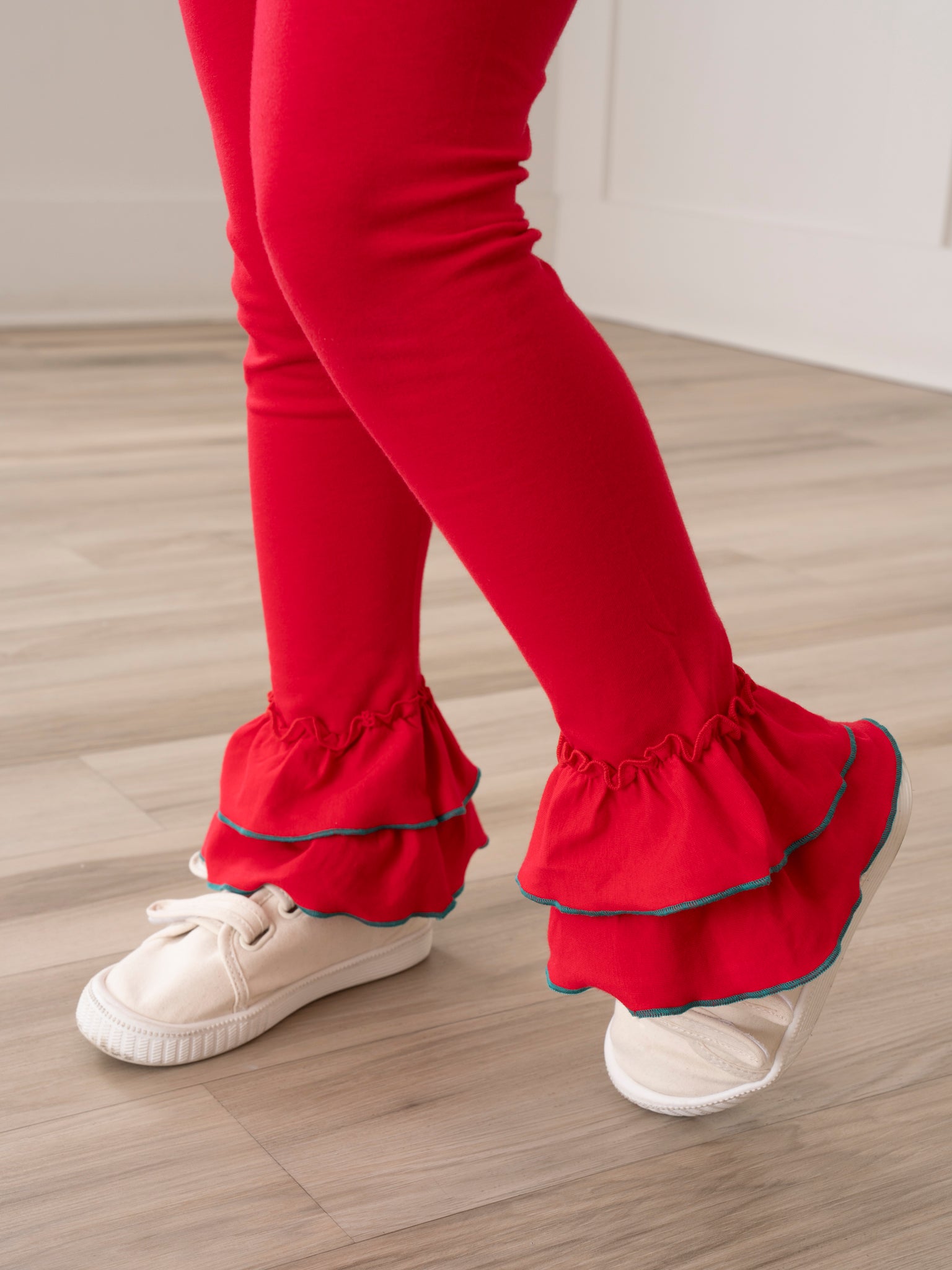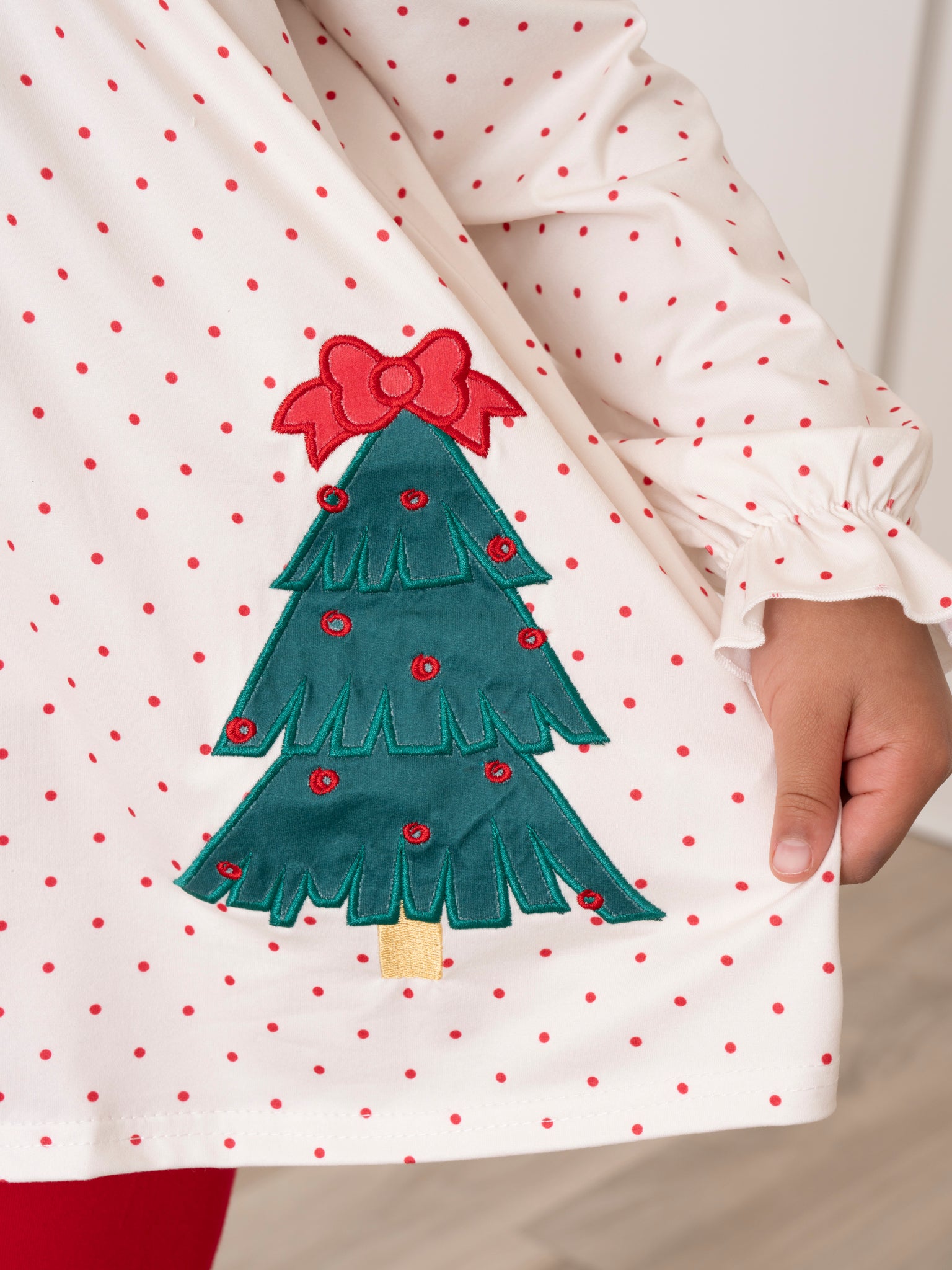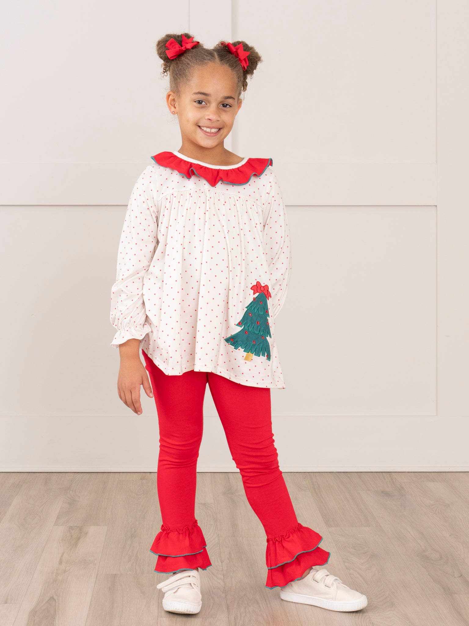 Dress your little one in playful style with this Polka Dots Embroidered Trees Ruffle Outfit. The polka dots and ruffle trim add a touch of whimsy, while the embroidered Christmas tree paired with the ruffle leggings makes it perfect for the holiday season. Complete the look with the sister set for an adorable matching outfit!