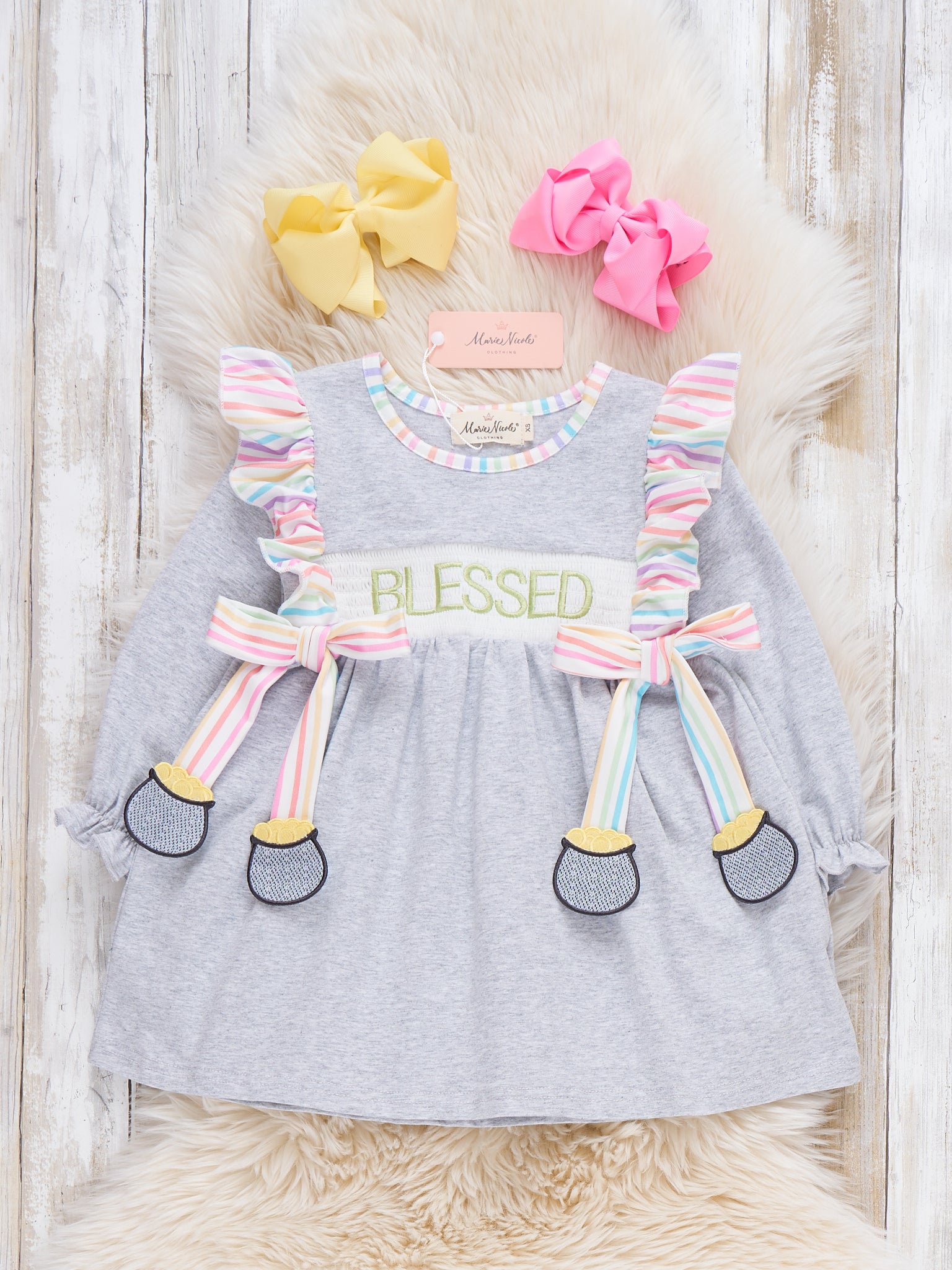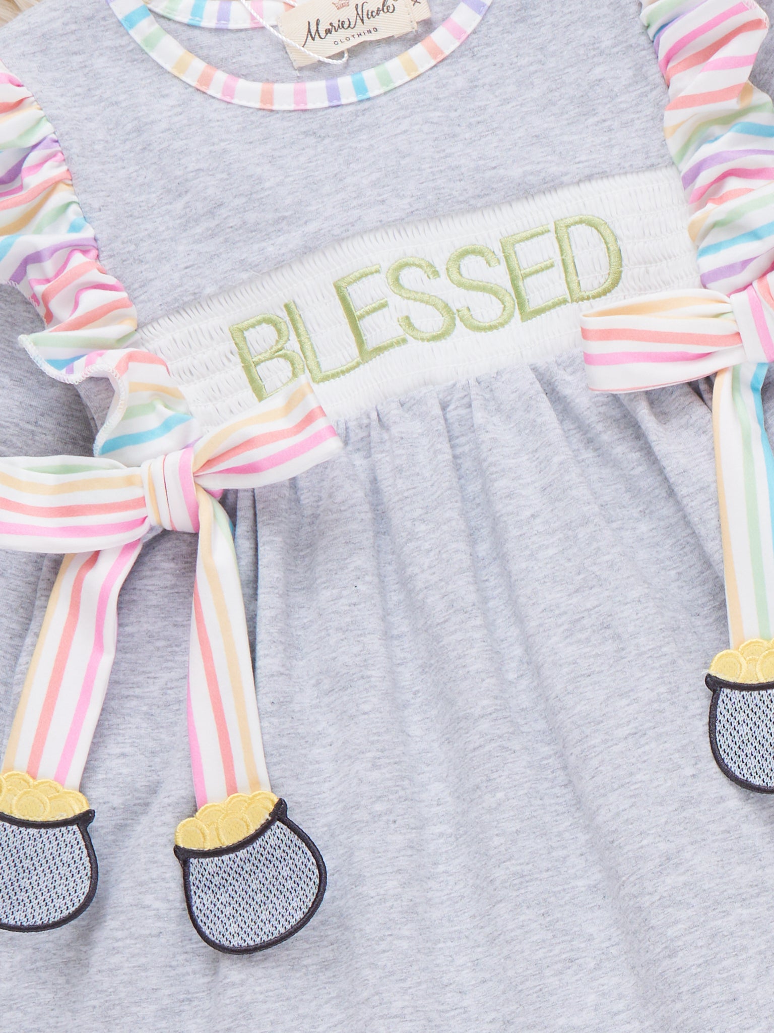 The Pot of Blessings Smocked Dress by Marie Nicole Clothing features joyful “Blessed” embroidery along with fun bow and festive accents, complemented by soft ruffle details and bows with hanging pots of gold. This charming dress is designed for memorable St. Patrick's Day celebrations and everyday twirls, combining comfort and whimsical style.