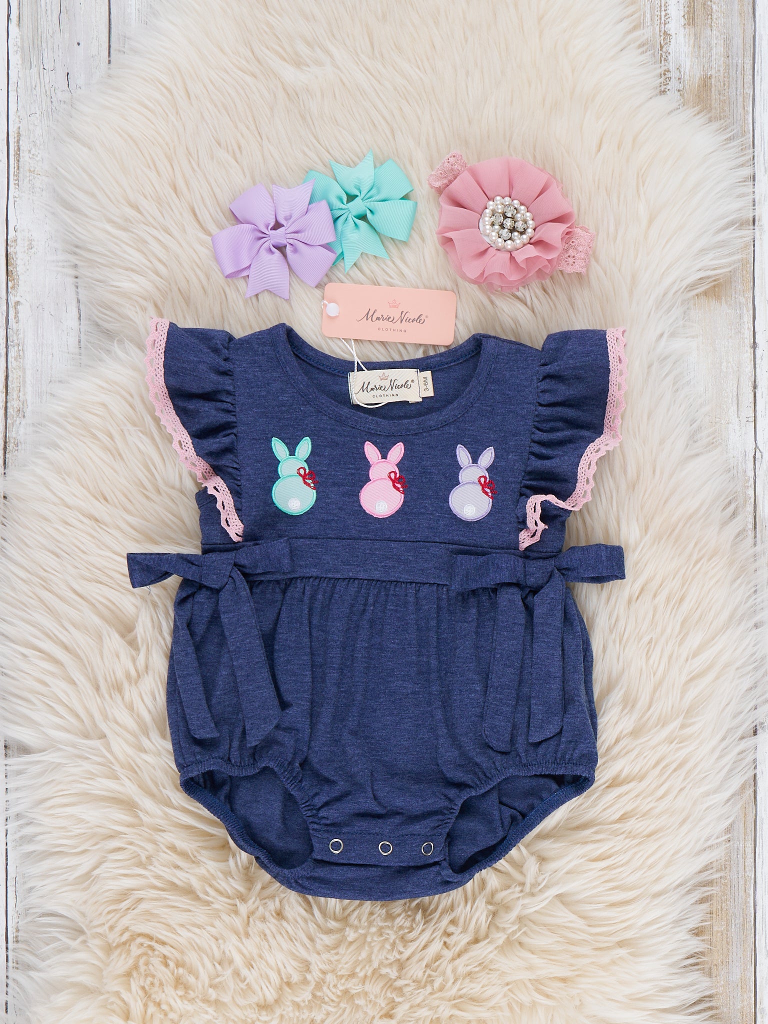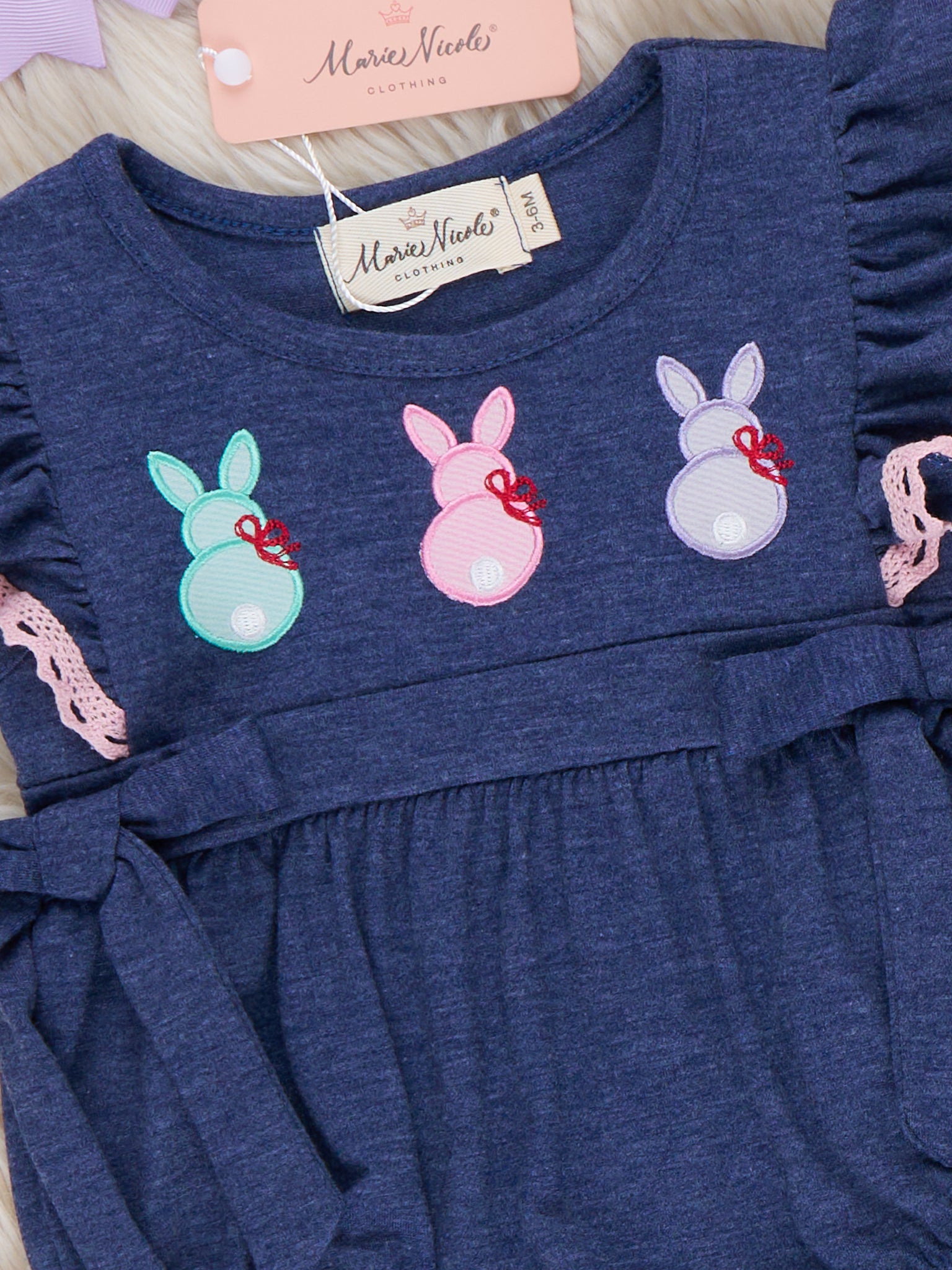 The Rainbow Bunnies Embroidered Ruffle Bubble by Marie Nicole Clothing sparkles with its trio of embroidered bunnies, flutter sleeves, and playful bubble silhouette for bouncy charm. Soft fabric ensures snug all-day comfort. Perfect for family photos, egg hunts, or joyful gatherings full of boutique delight.