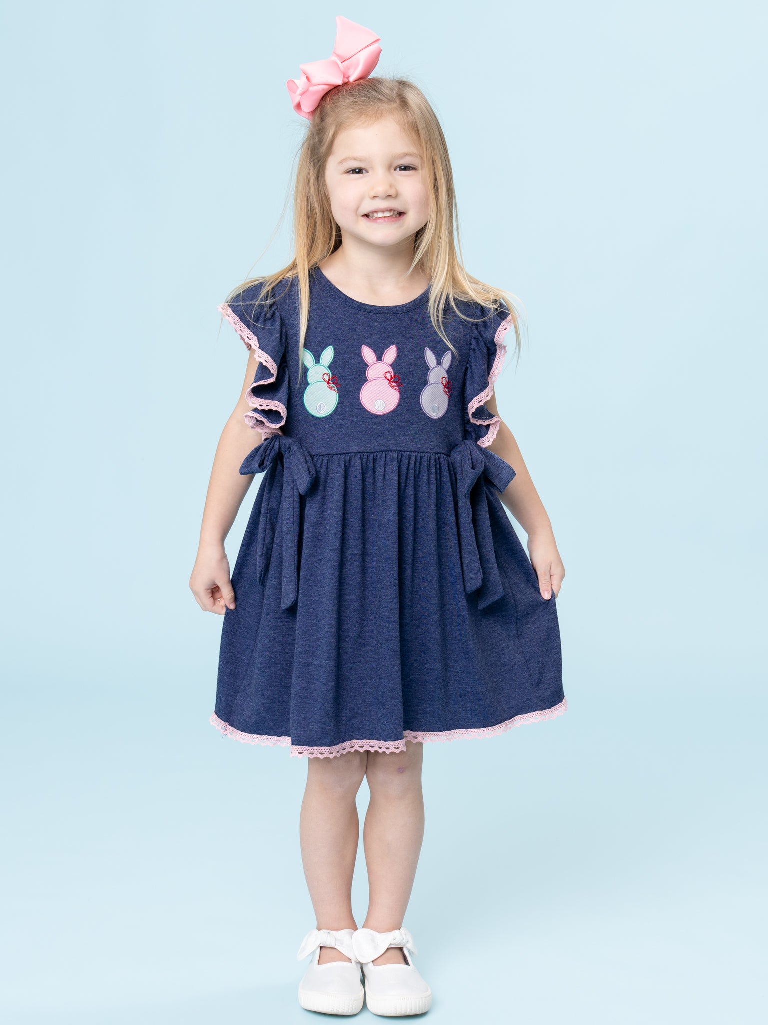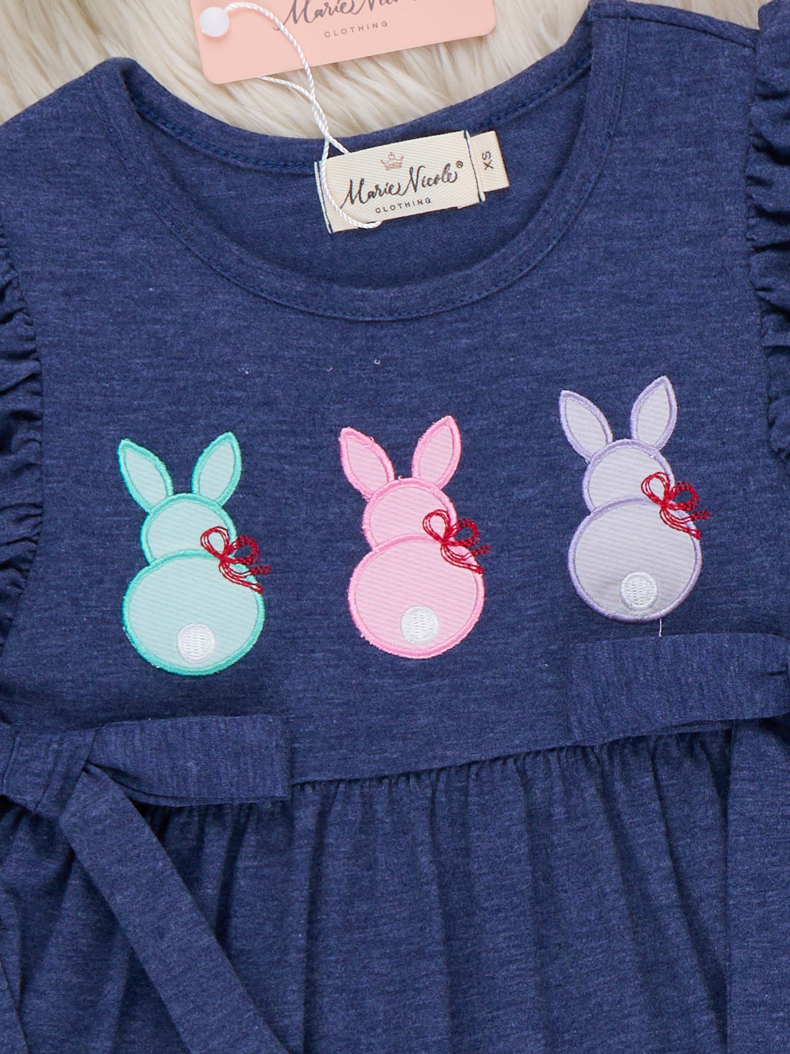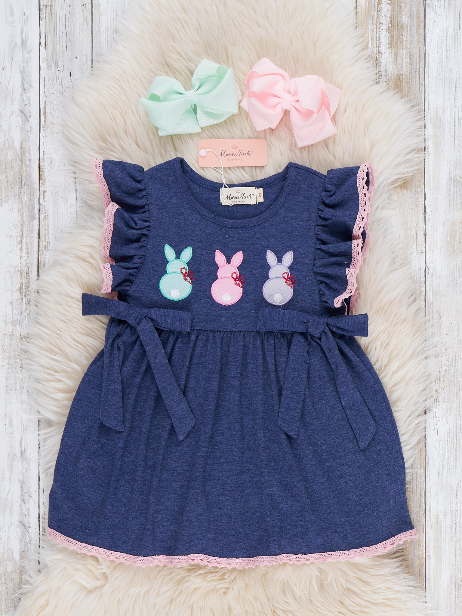 The Rainbow Bunnies Embroidered Ruffle Dress by Marie Nicole Clothing sparkles with its trio of embroidered bunnies, flutter sleeves, and gathered skirt for twirly delight. Scalloped hem add playful bounce for festive movement, while soft stretchy fabric ensures all-day comfort during adventures. Perfect for family photos, egg hunts, or joyful gatherings full of boutique charm.