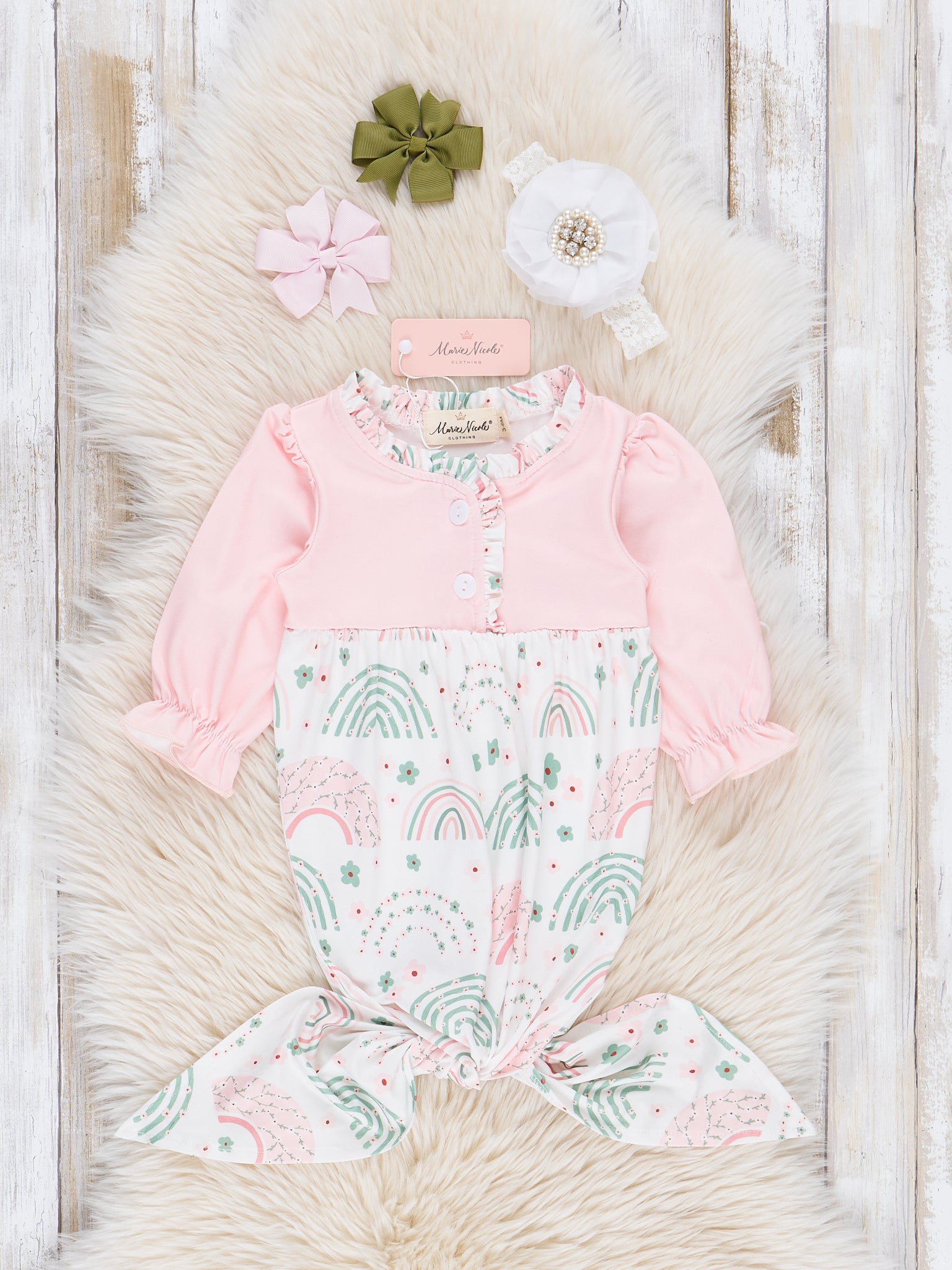 Unleash her colorful dreams with these Rainbow Dreams Ruffle Knot Gown. This girls' sleep set features a vibrant rainbow print that will make bedtime fun. The soft pink trim and ruffle detail add a touch of sweetness, making this gown by Marie Nicole Clothing both playful and cozy.