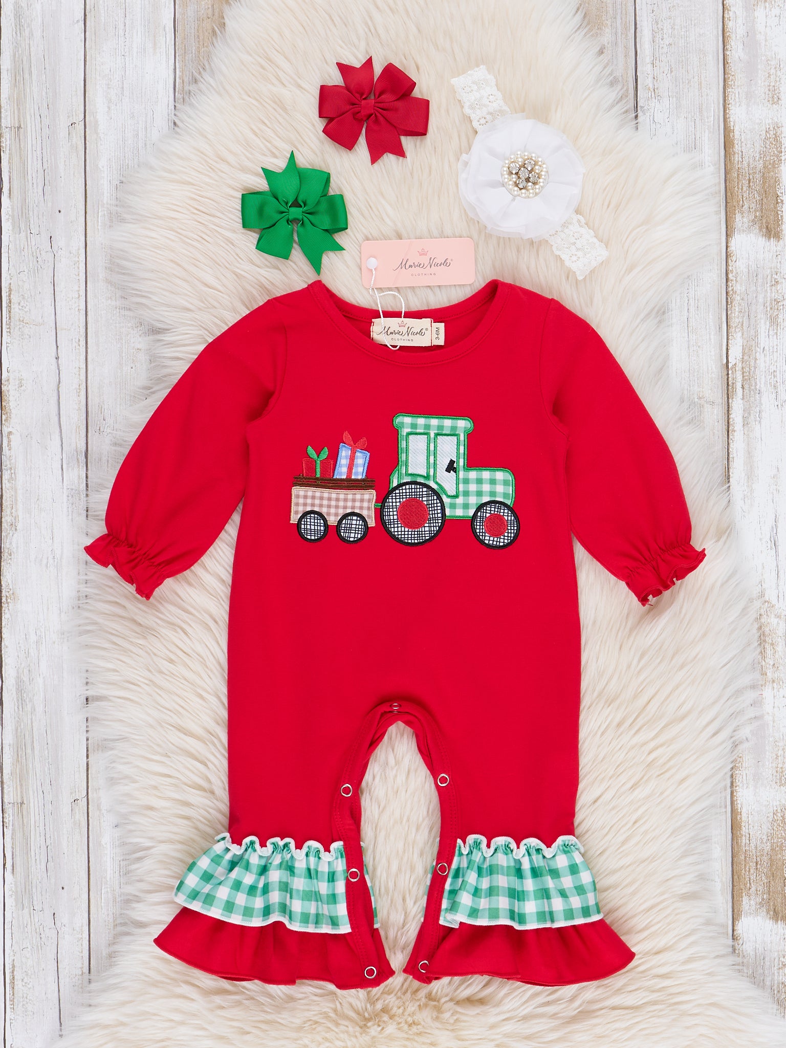 Red & Green Gingham Embroidered Holiday Tractor Ruffle Romper