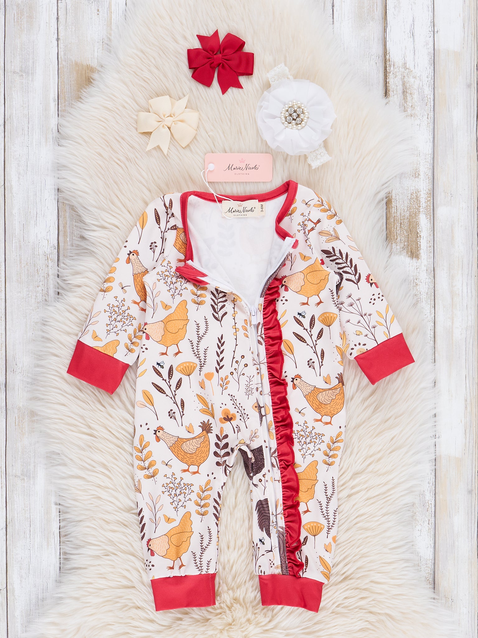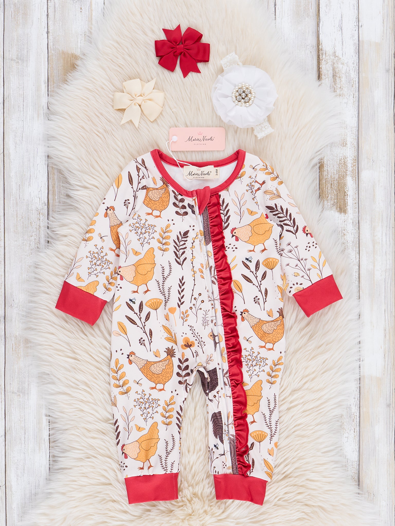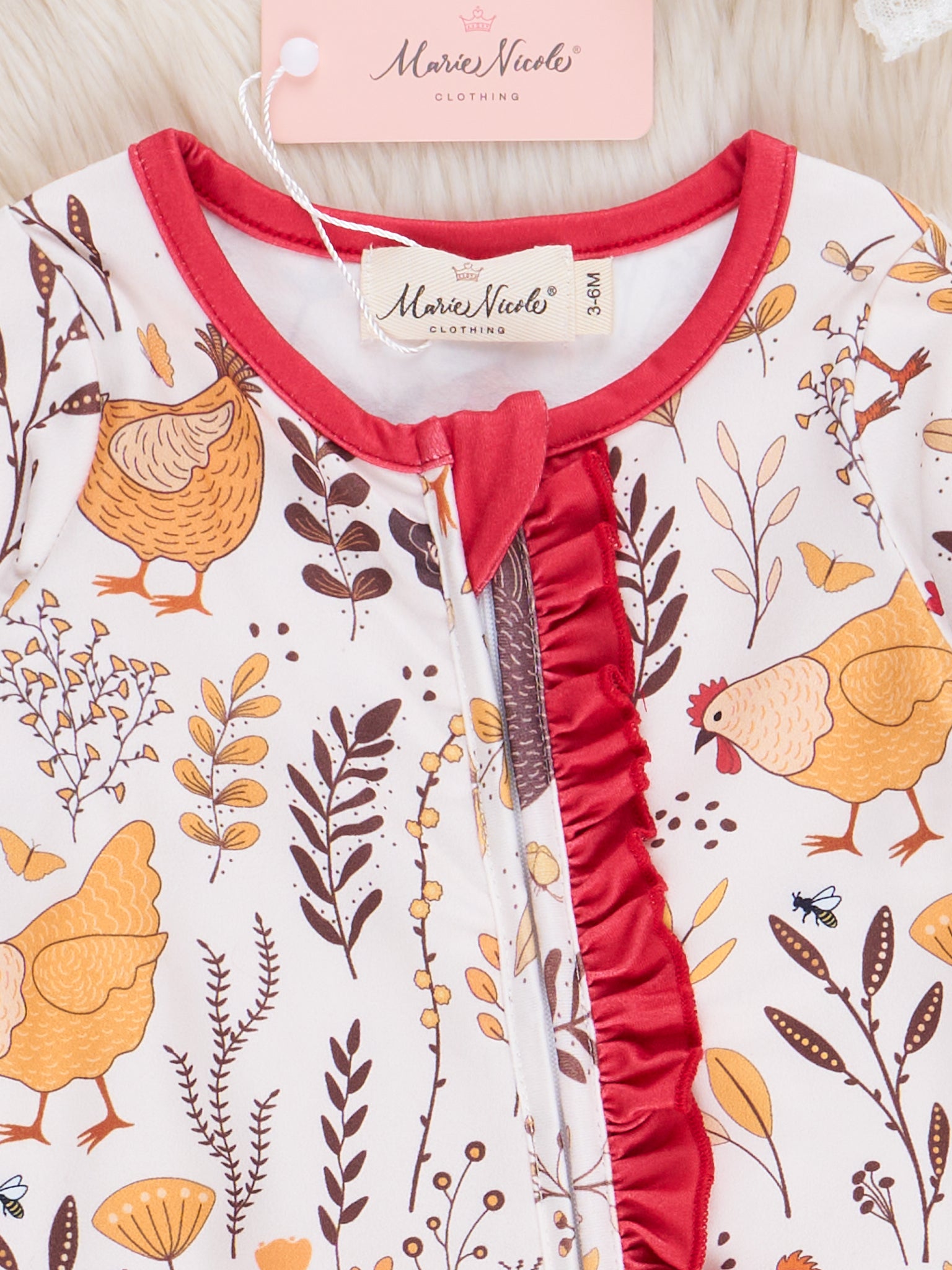 Get your little chickadee ready for a good night's sleep in these playful Red Hen Party Ruffle Sleeper Pajamas by Marie Nicole Clothing. The fun hen print adds a quirky touch, while the red trim & ruffle details make for a charming sleep set. Perfect for girls who love a bit of whimsy in their sleepwear.