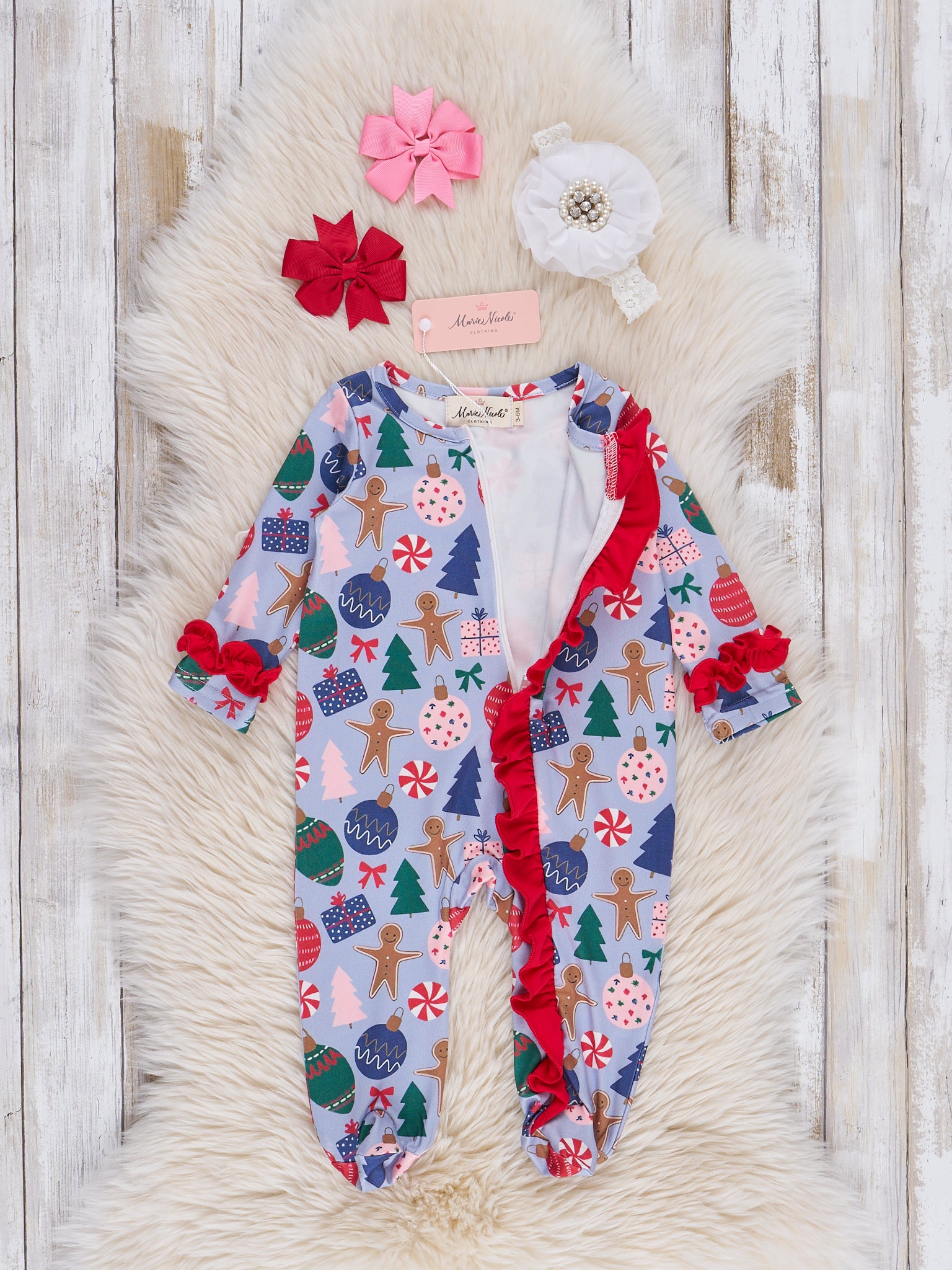Looking for sibling style? Dress your little ones in this eye-catching Red & Light Blue Holiday Joy Ruffle Romper! It features a light blue bodice with an ornament print detail and sweet red ruffles to get them in the holiday spirit! They'll be ready for family photoshoots and yuletide fun!