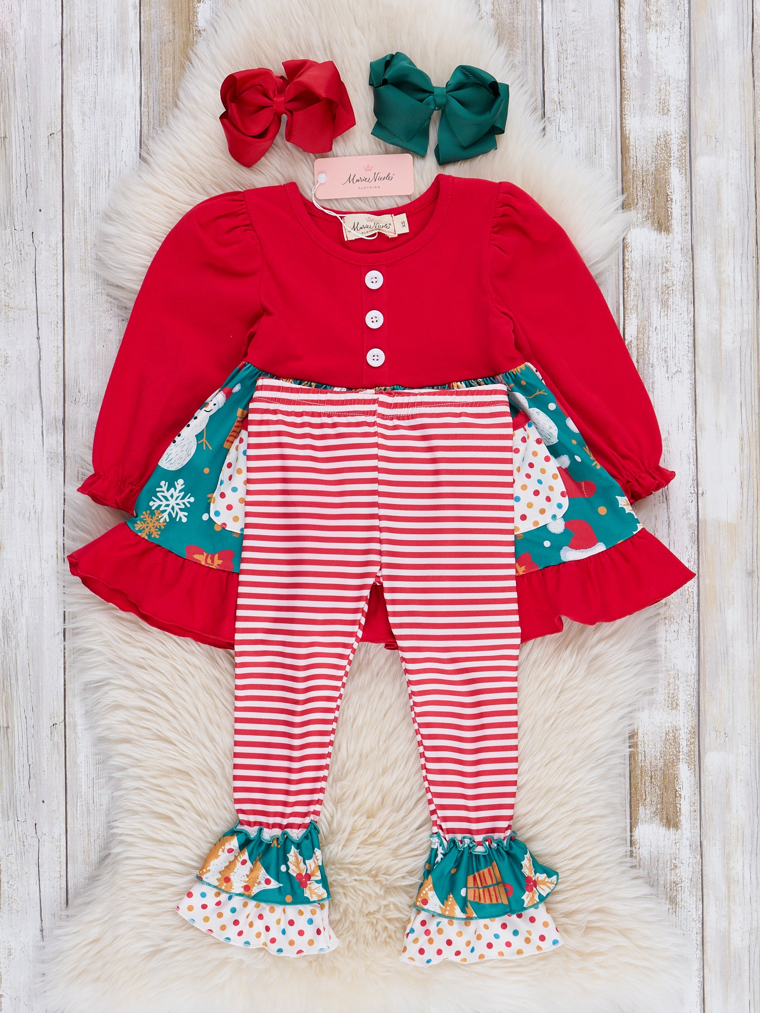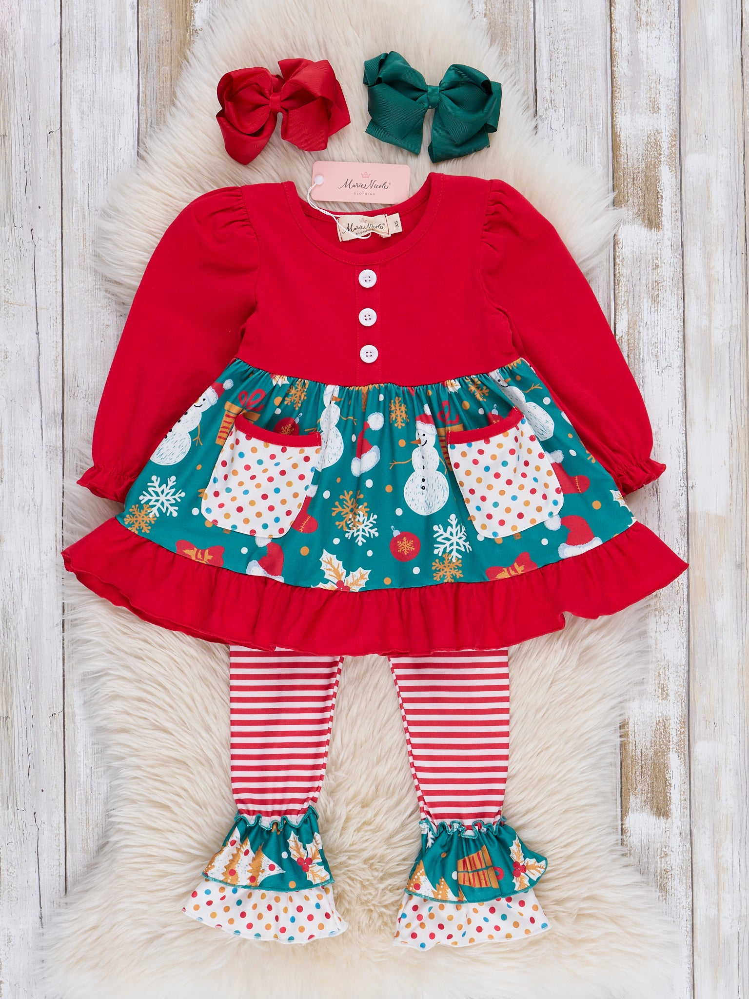 Unwrap the festive fun with our Red Peppermint Stripes & Dots sister set! This outfit includes a red ruffle top with a Christmas print and playful polka dot pockets, paired with striped ruffle leggings. Perfect for the holiday season and beyond!