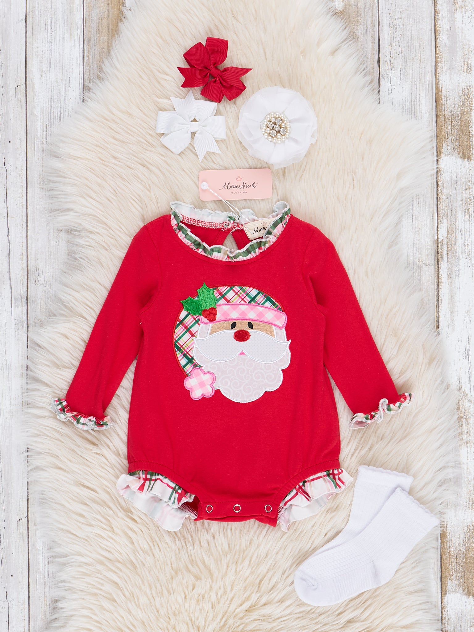 Ho ho ho, dress your little one in this festive Red Plaid Embroidered Santa Ruffle Bubble. Featuring a fun embroidered Santa on a red bodice and a playful plaid ruffle trim accent, this girls bubble is perfect for the holiday season. Get the matching sister set for double the cuteness!