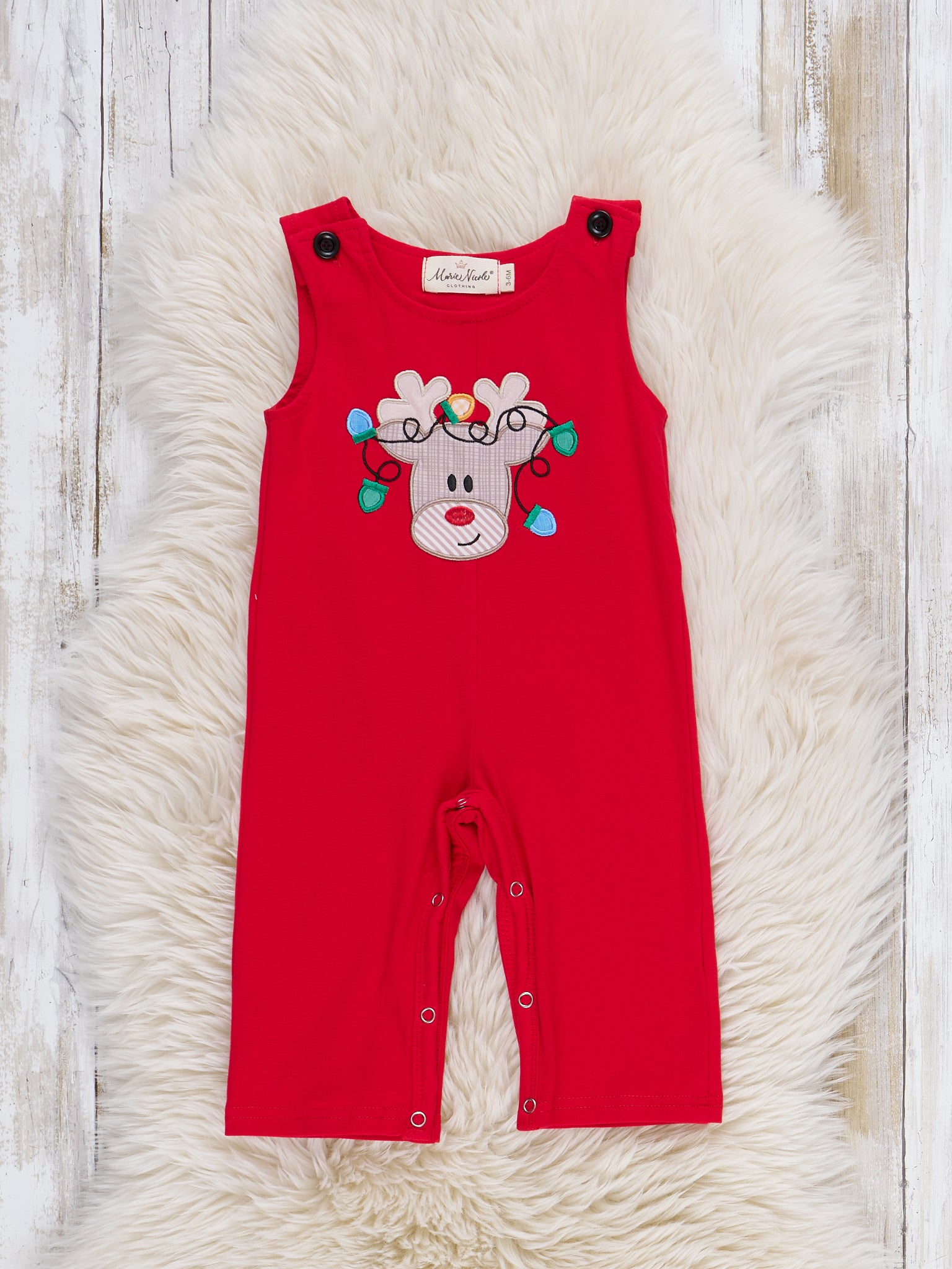 Keep the holidays bright with the Reindeer Lights Embroidered Overall Romper Set! Colorful Christmas lights adorn Rudolph on this red overall, paired with a plaid, long-sleeve underneath. This two-piece set from Marie Nicole Clothing is so cheerful and festive. Made with soft, comfy fabric, your little boy will love wearing this during the winter holidays!