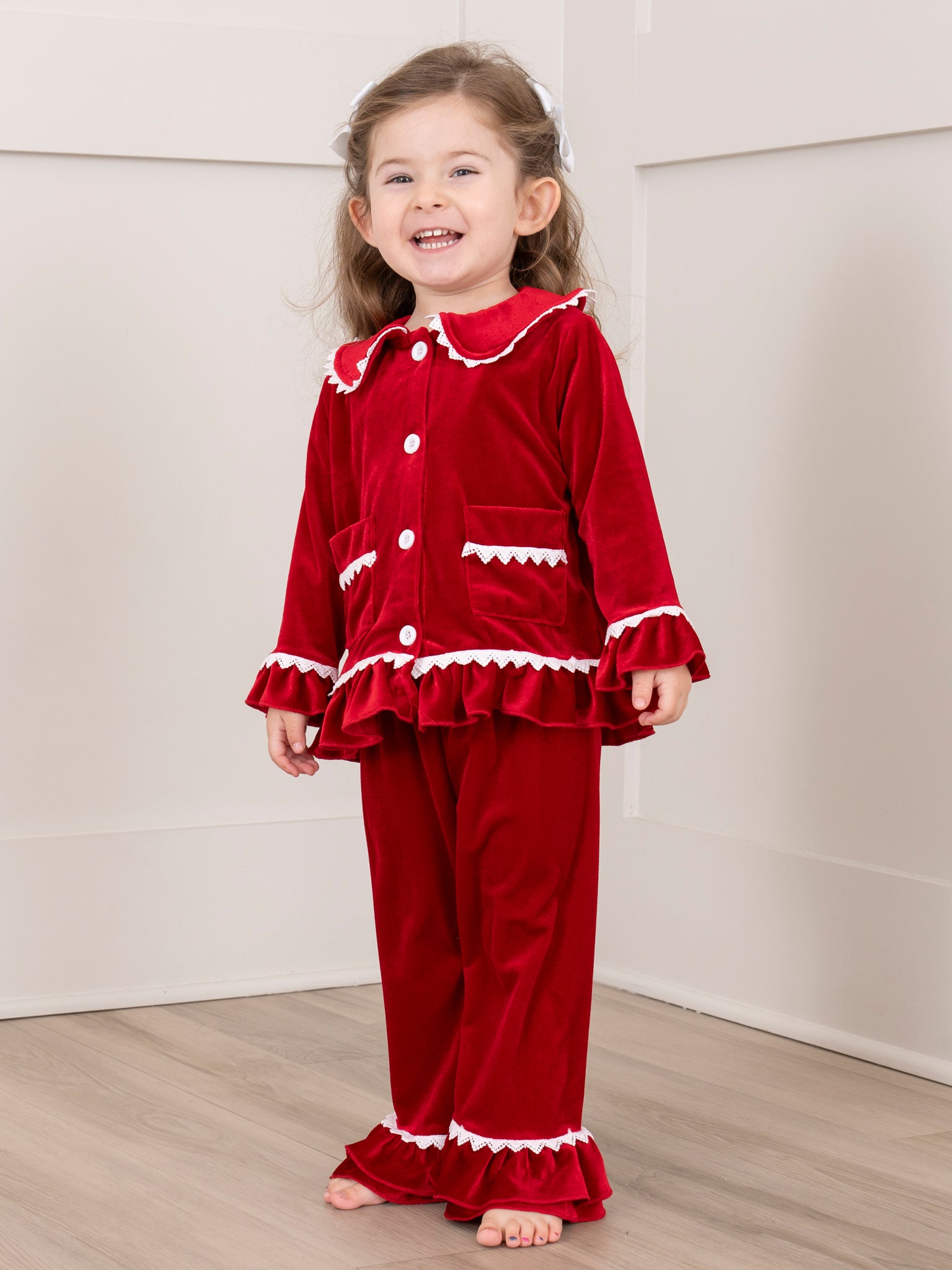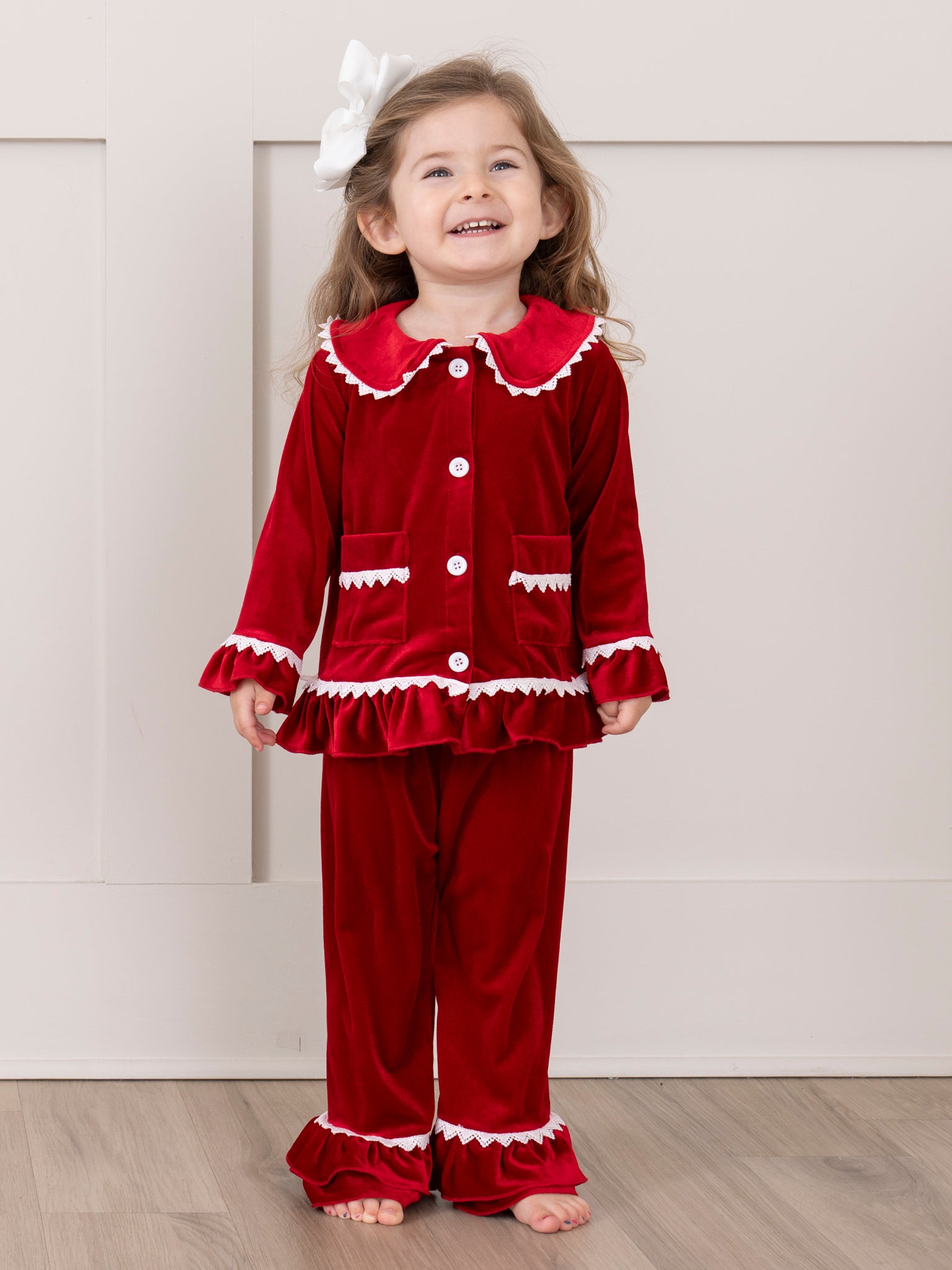 The softest sibling set for all the kiddos! Our customer favorite, the Ruby Velvet Pajamas, is back! These classic Christmas jammies by Marie Nicole Clothing feature functioning buttons, ruffles, and an elastic waistband for easy changing. Perfect for winter nights and sleeping (waiting!) for Christmas morning.