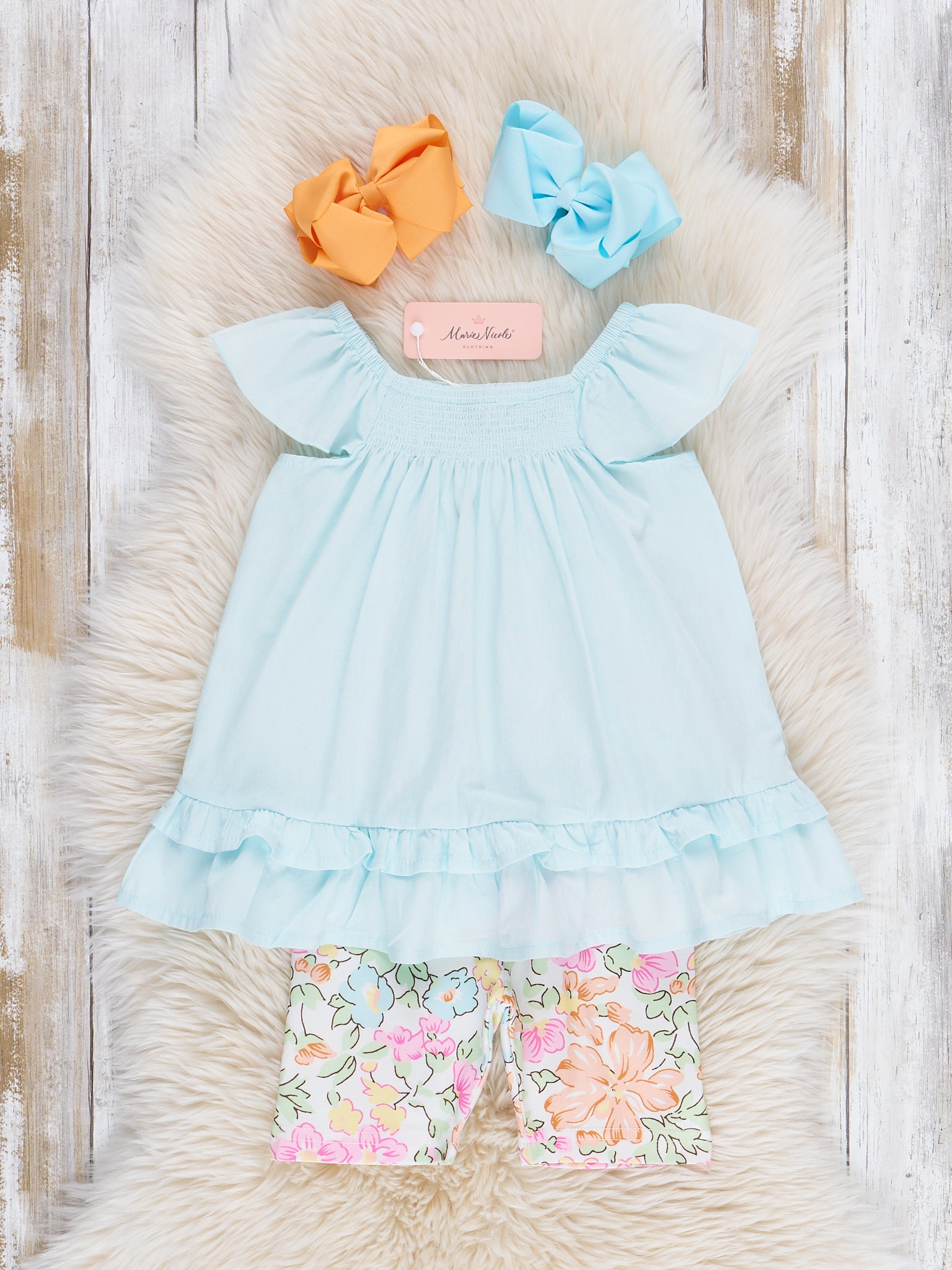 Ride into spring with this darling girls outfit from Marie Nicole Clothing. The light blue swing top features delicate ruffle details, while the wildflower doodle print biker shorts add a playful touch. This sister set is sure to make any little one look and feel like a wildflower!