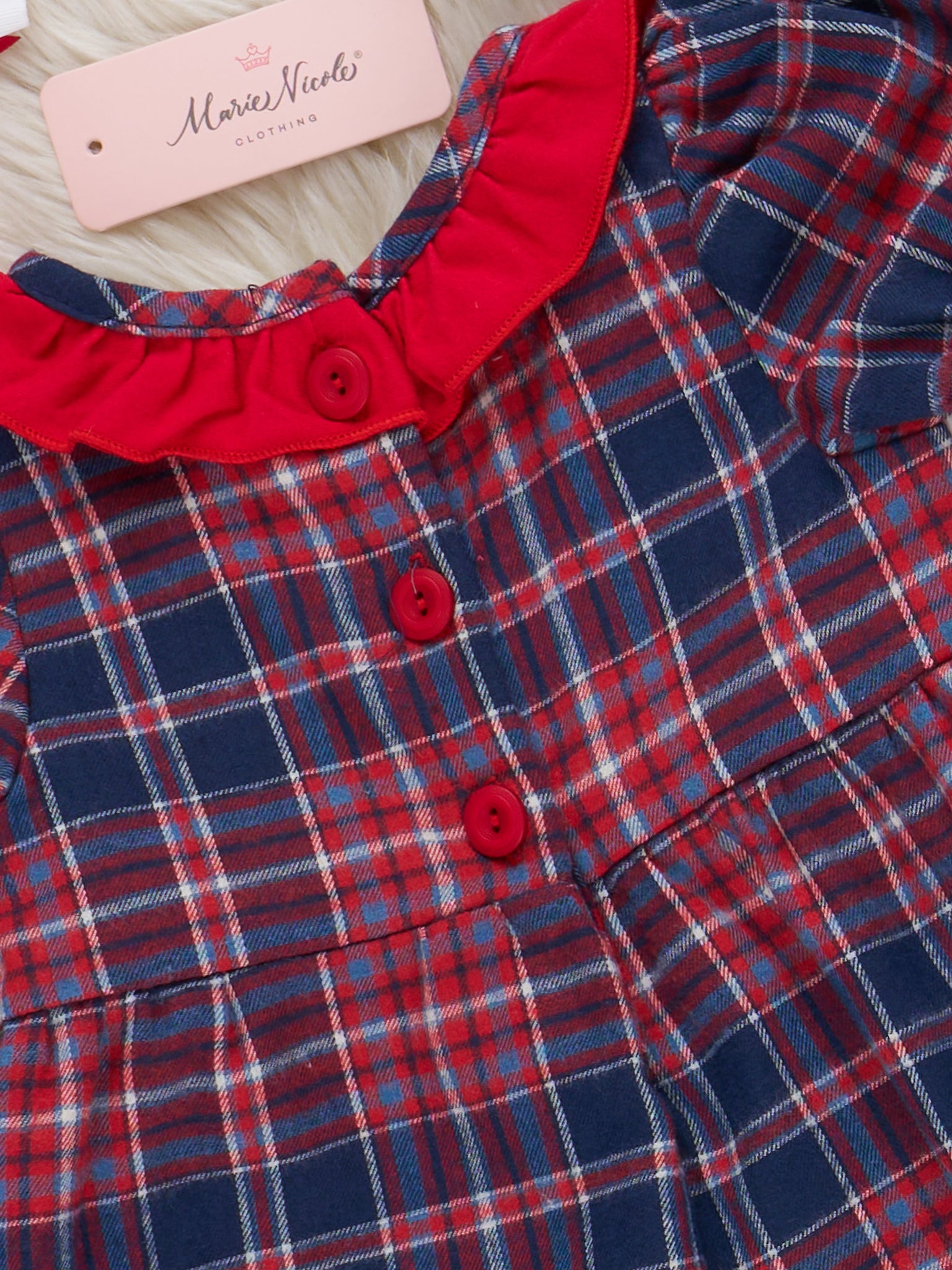 The Santa Spirit Smocked Flannel Overall Romper by Marie Nicole Clothing is a festive sleeveless flannel-fabric romper featuring hand-smocked Santa faces across the chest and accented with charming trimmed pockets. This classic plaid design offers a timeless holiday look—perfect for family celebrations, Christmas photos, and coordinating sibling outfits.