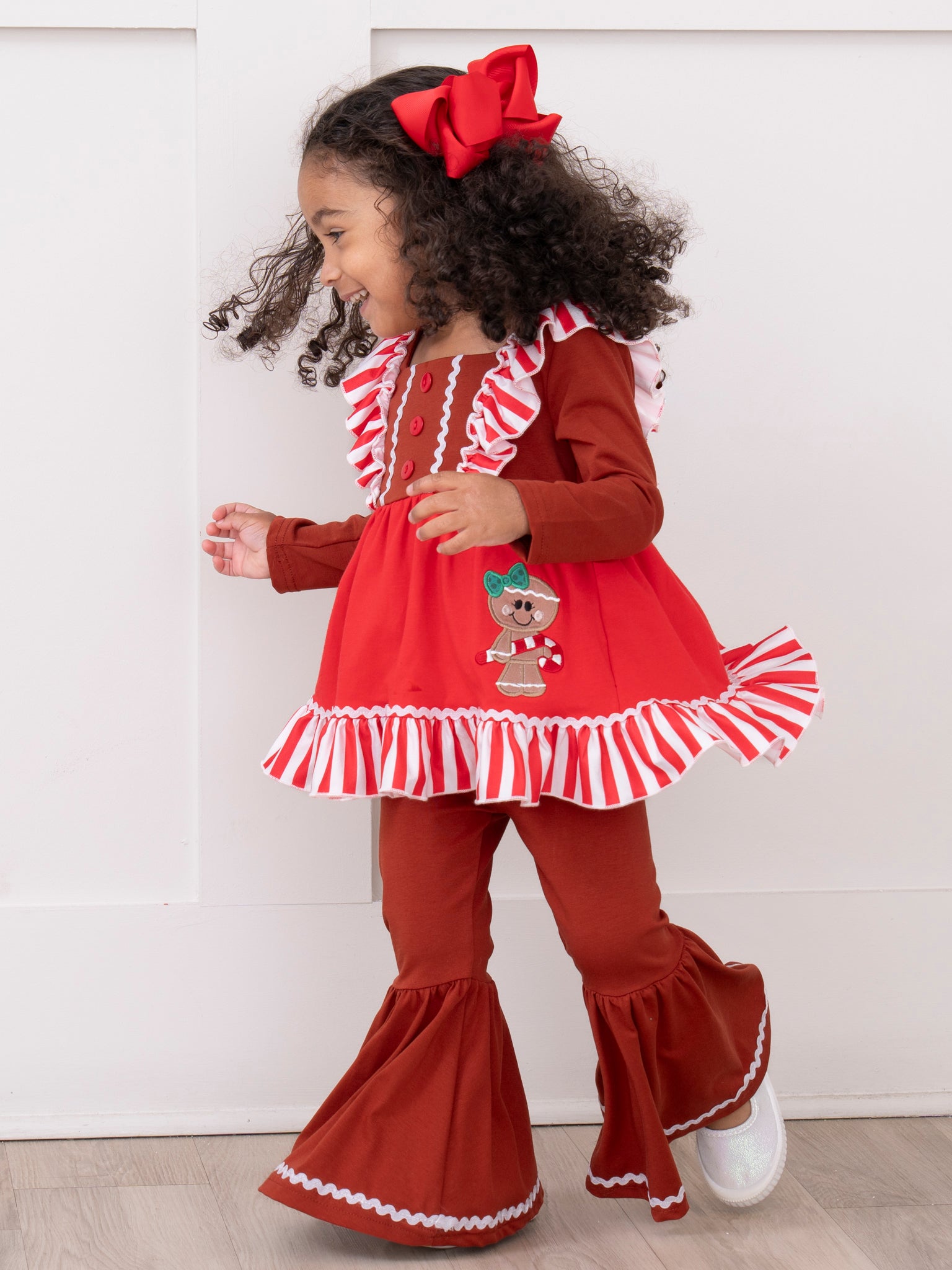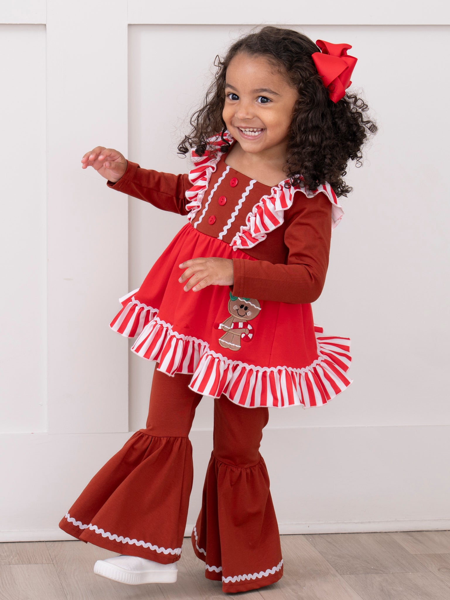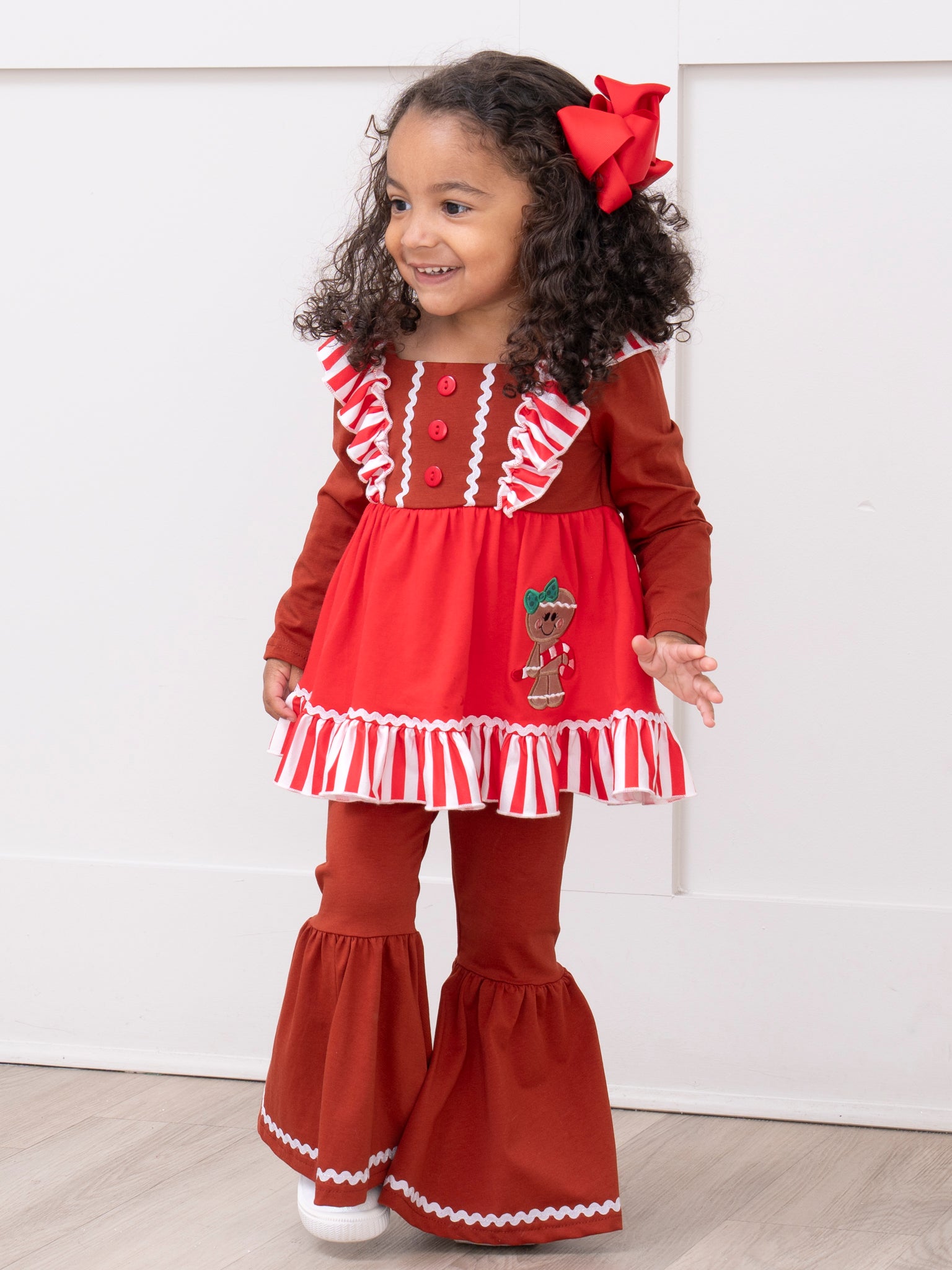 The perfect sister set for your sassy trendsetters! This outfit features a tunic with stripes, flutter sleeves, decorative buttons, a sassy gingerbread appliqué, ruffle trim, & bell bottoms with an elastic waistband.