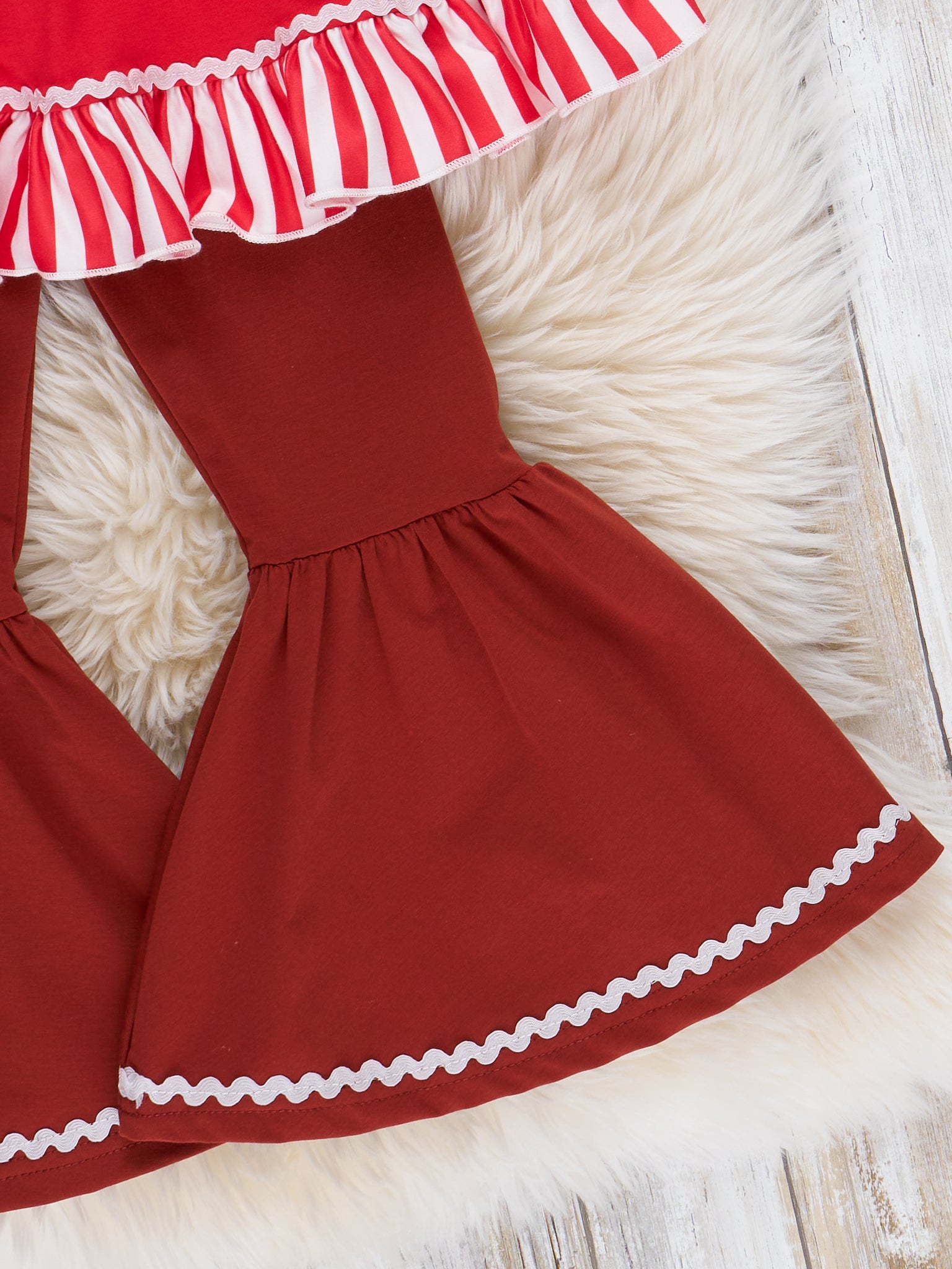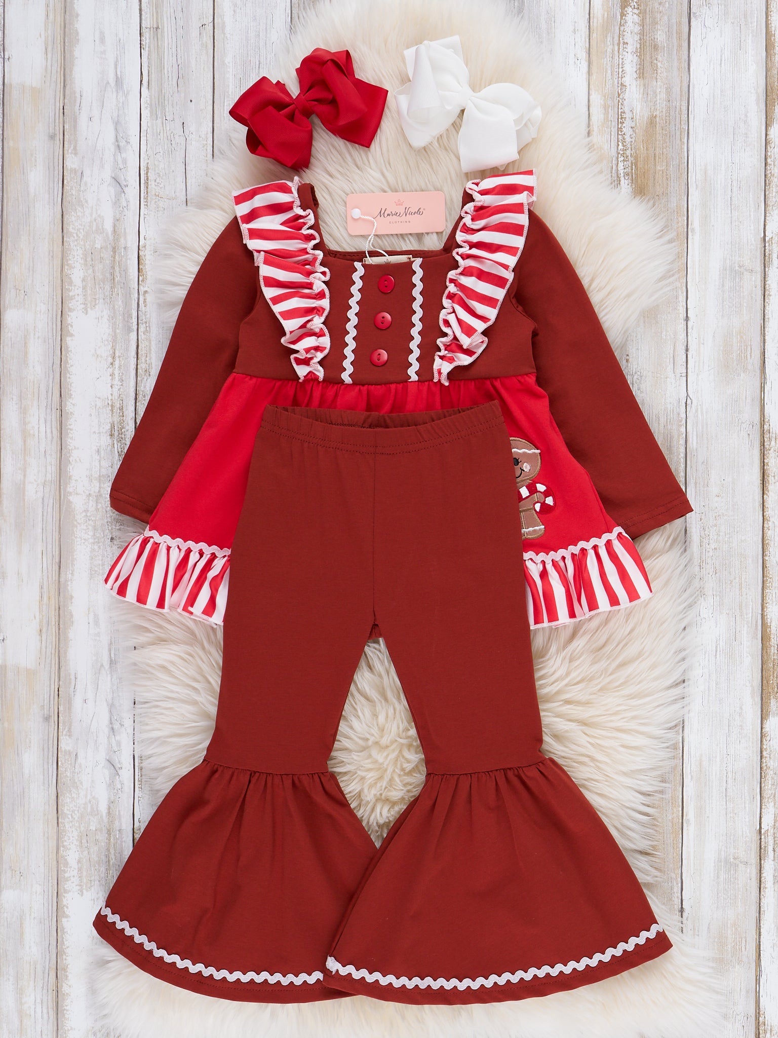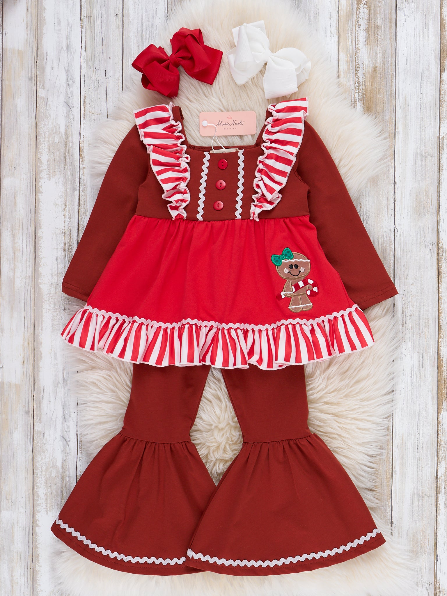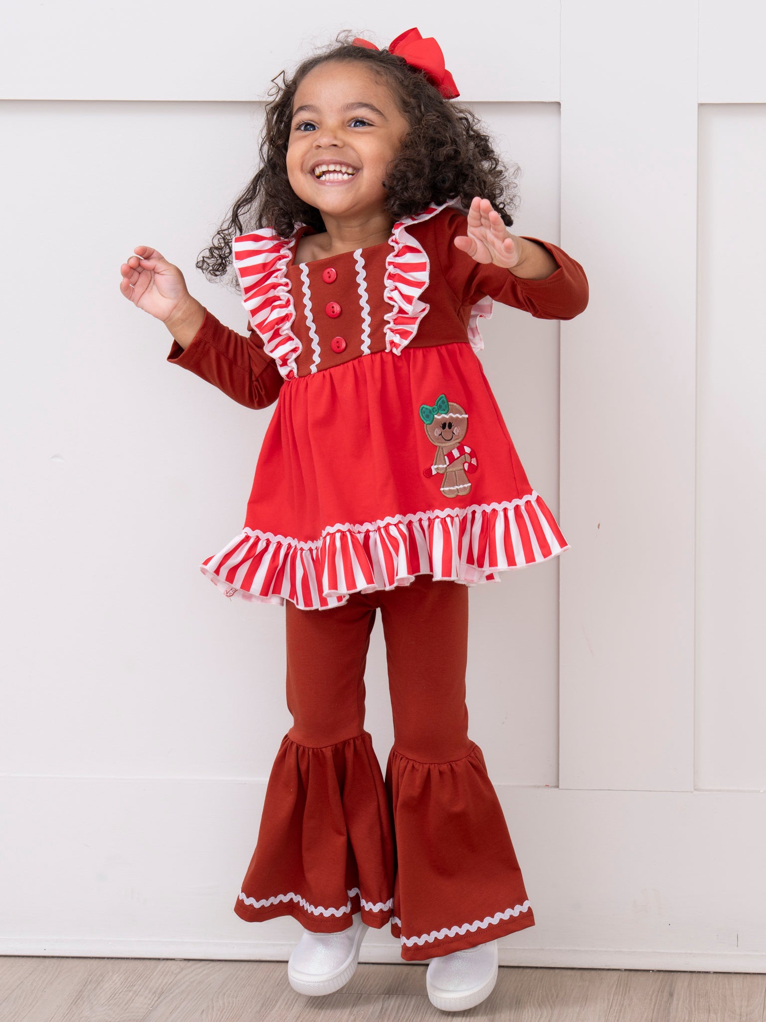 The perfect sister set for your sassy trendsetters! This outfit features a tunic with stripes, flutter sleeves, decorative buttons, a sassy gingerbread appliqué, ruffle trim, & bell bottoms with an elastic waistband.