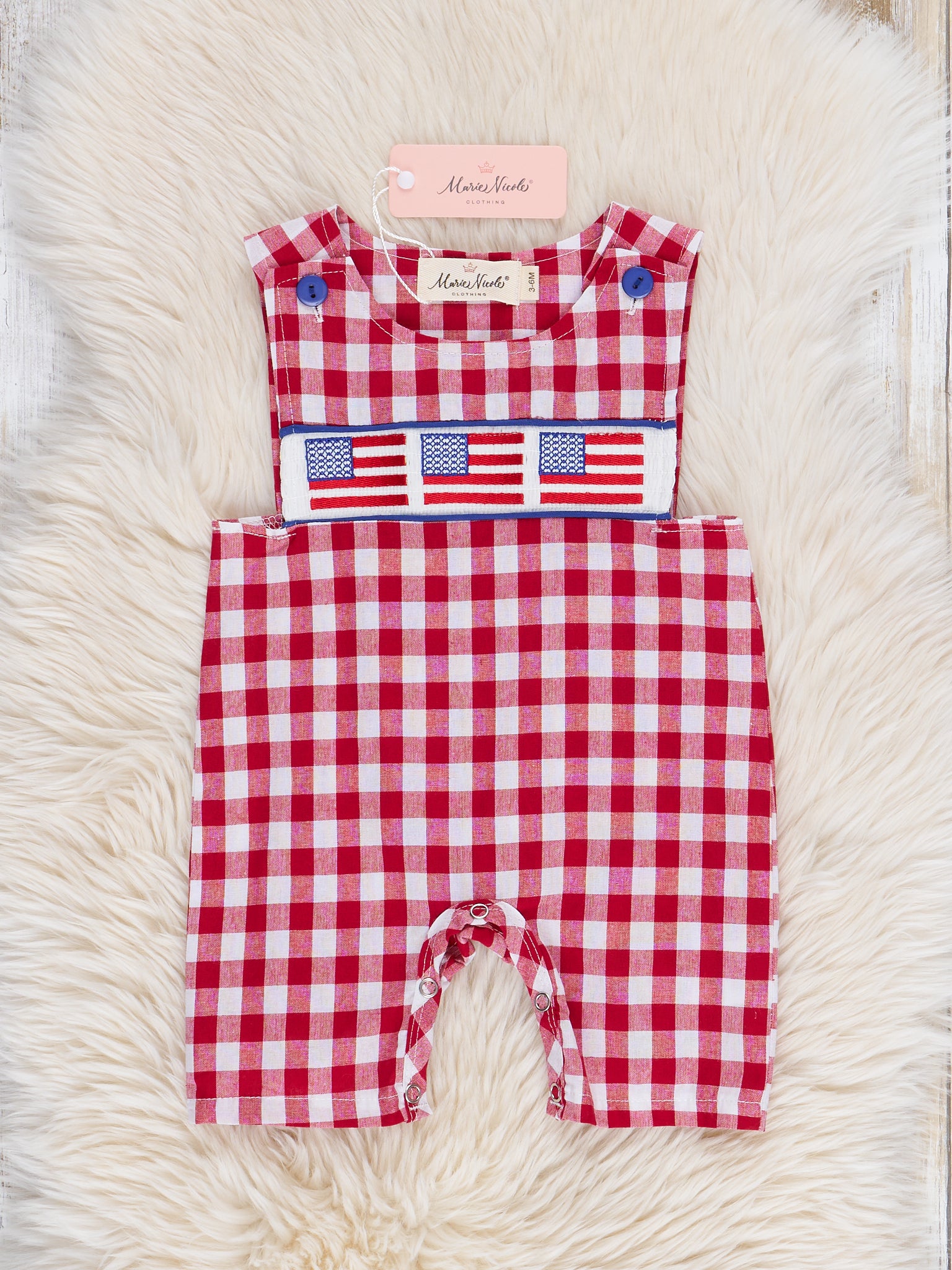 Let your kids rock the red, white, and blue in style with this smocked gingham American flag johnny! Perfect for little patriots, this sibling set by Marie Nicole Clothing is sure to turn heads with its classic gingham pattern and bold embroidered flag. Sure to provide a spark of independence and a feeling of freedom!
