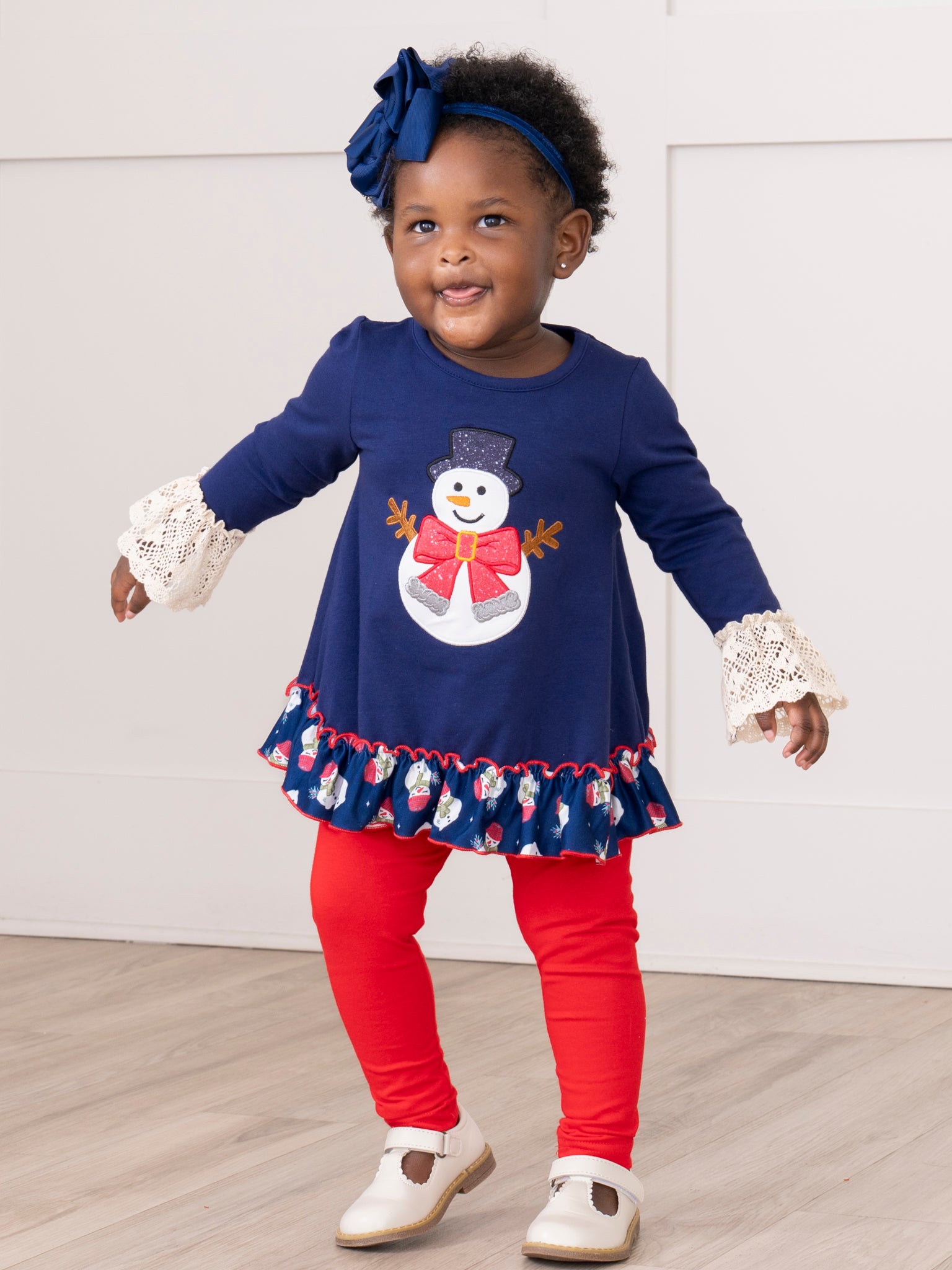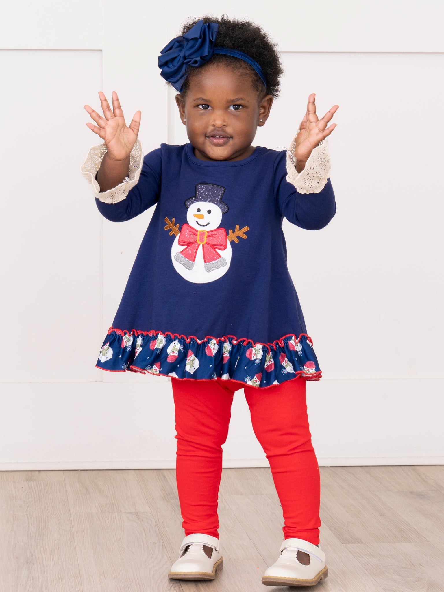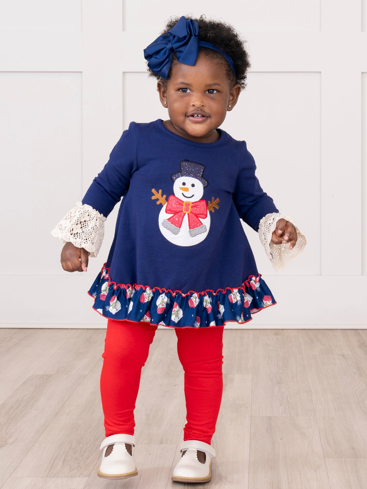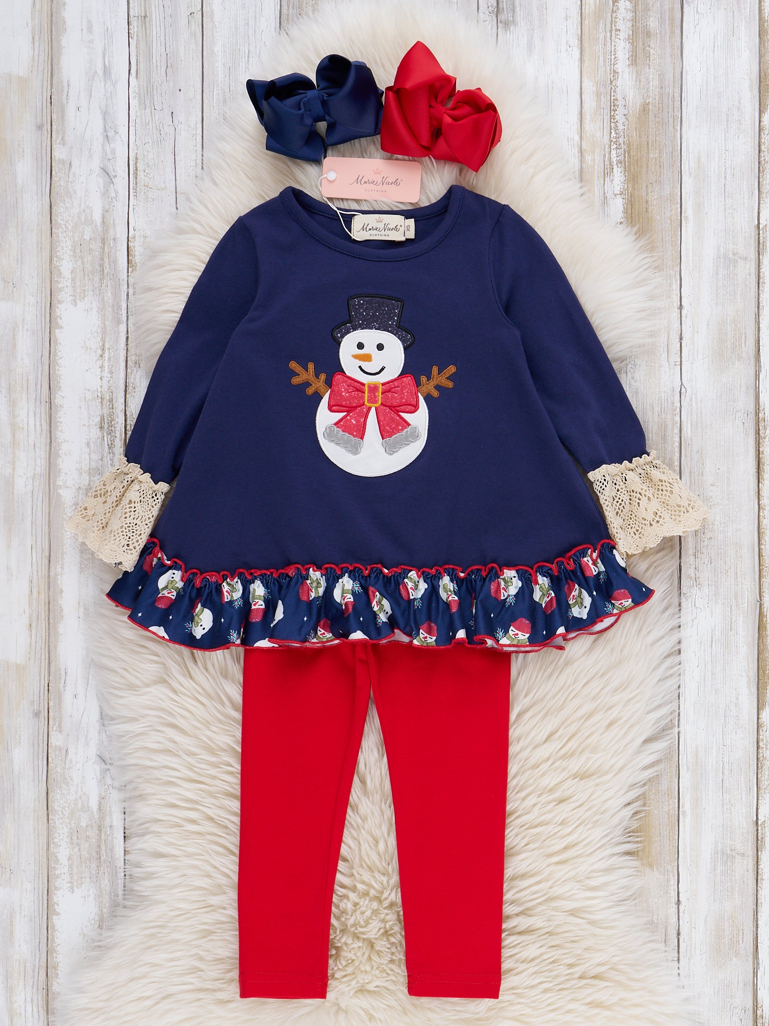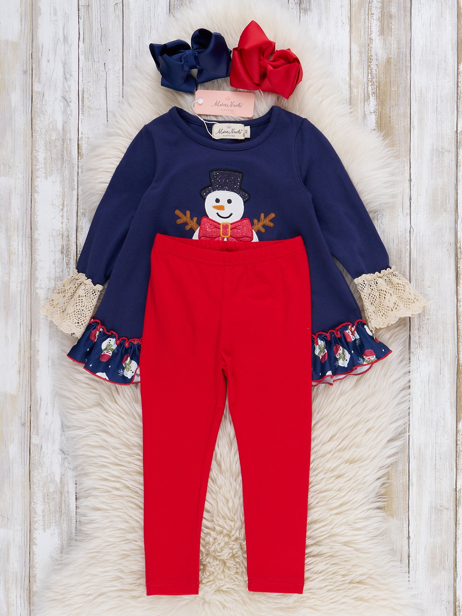 Time for snowman building! Marie Nicole Clothing's Snowman Embroidered Lace Ruffle Outfit is perfect for snow days and winter outings. The snowman-embroidered top has a flowy, ruffled silhouette with lovely lace sleeves for some rustic charm. With snug, red leggings, your little one will be dressed comfy and cute for the holiday season!