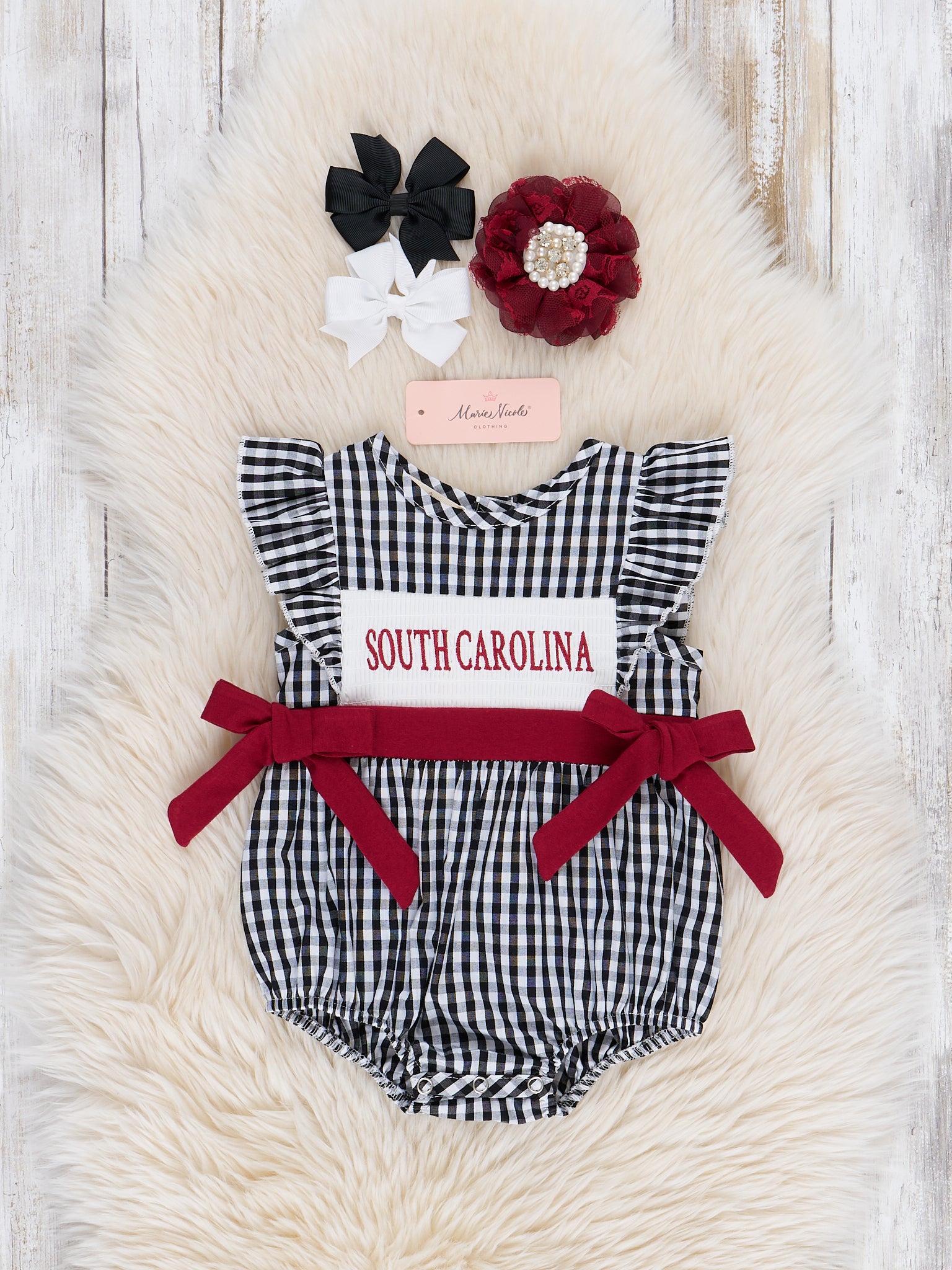 The South Carolina Smocked Gingham Bubble is the perfect blend of playful charm and team spirit for your tiniest fan. This adorable one-piece features a classic black and white gingham print, flutter sleeves, and a smocked panel embroidered with “South Carolina.” Soft, lightweight, and designed with snaps for easy changes, this bubble from Marie Nicole Clothing is a game day must-have. Finished with sweet red side bows, it’s a spirited look made for cheering in comfort and style.