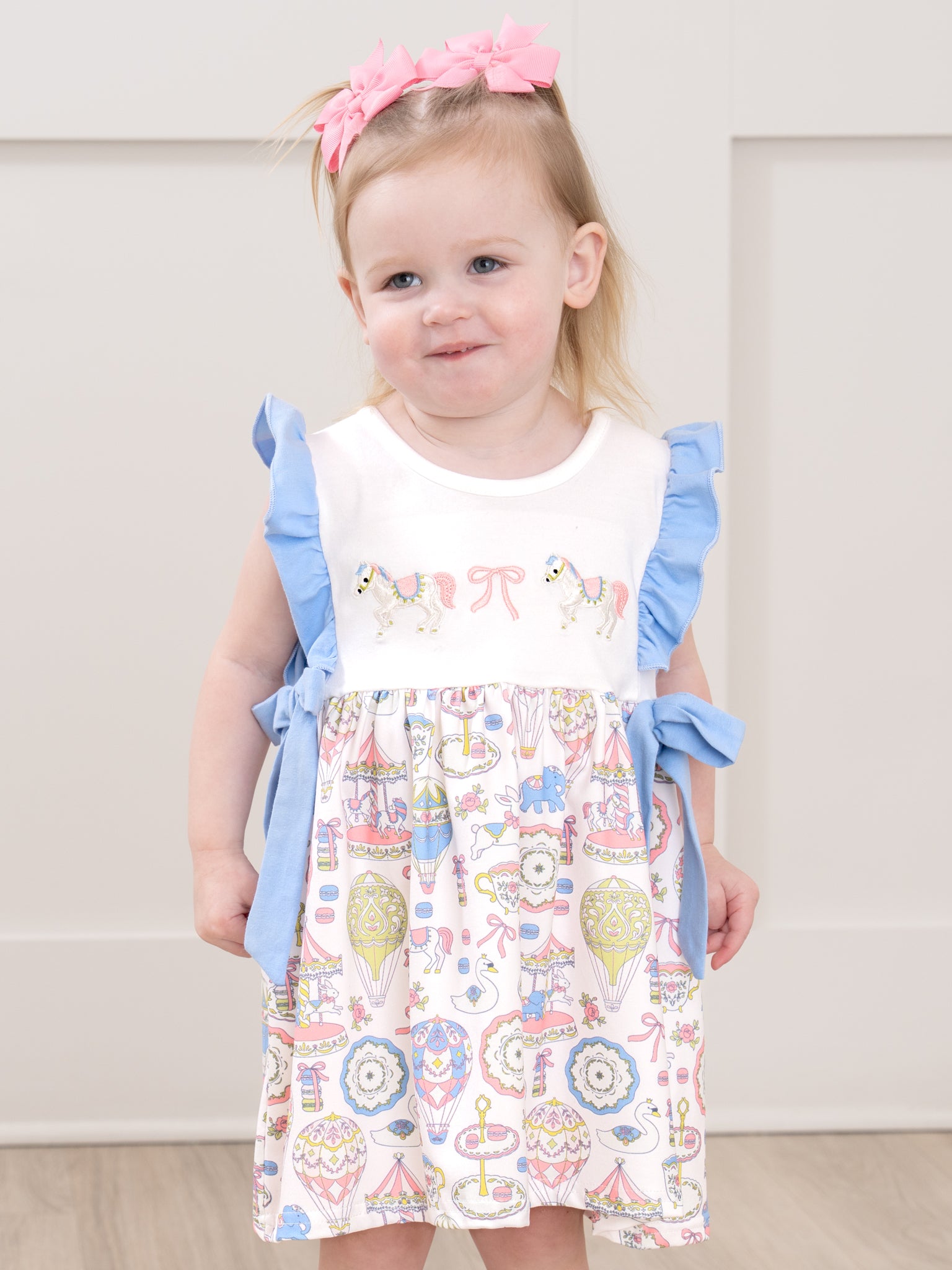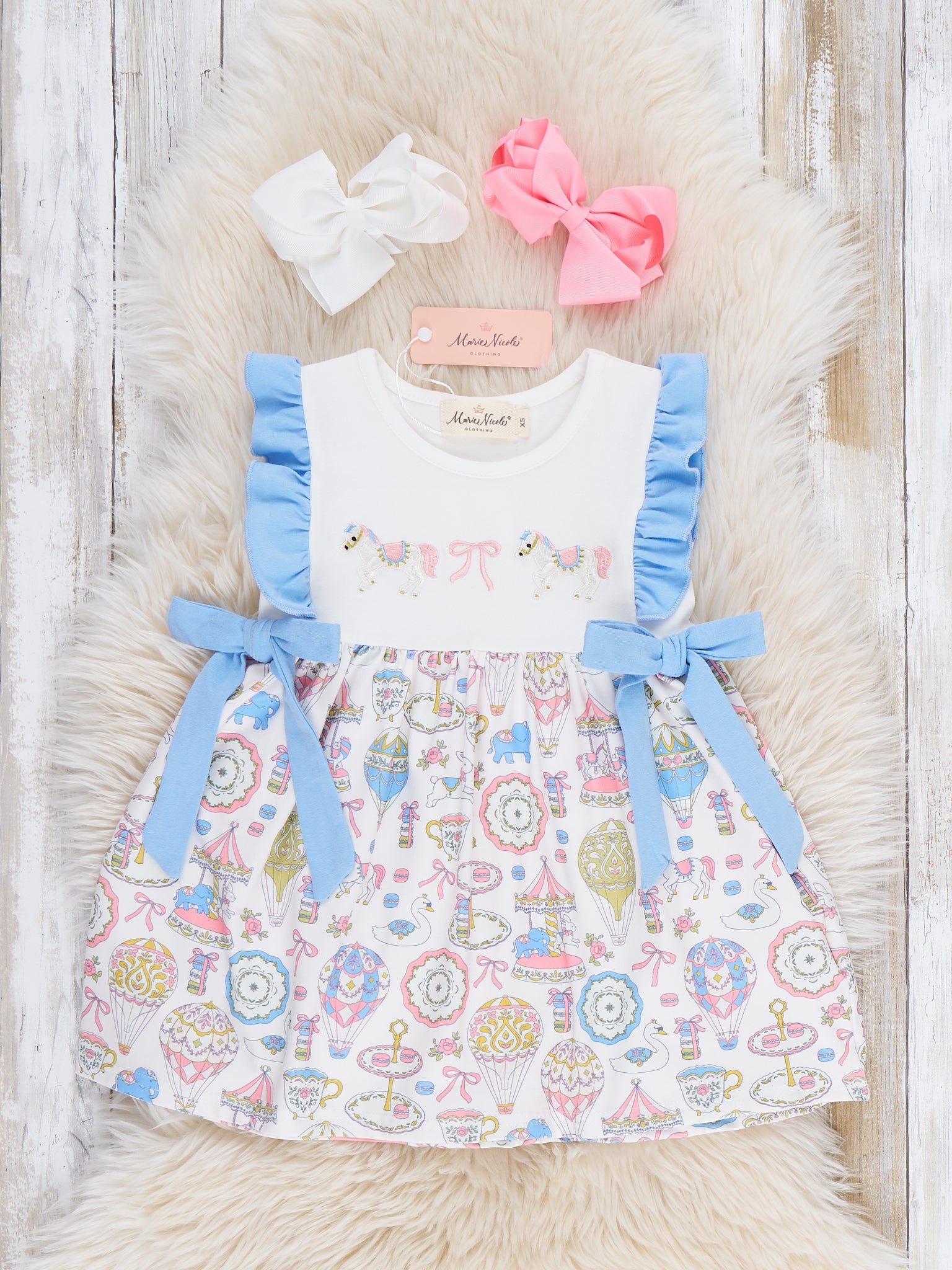 The Storybook Carousel Magic Embroidered Dress by Marie Nicole Clothing twirls with fairytale charm, showcasing carousel pony embroidery and fluttery ruffle sleeves. A softly gathered skirt and side bow accents add sweet movement and boutique flair, while the comfortable knit bodice keeps little ones cozy for parties, portraits, or whimsical everyday play.