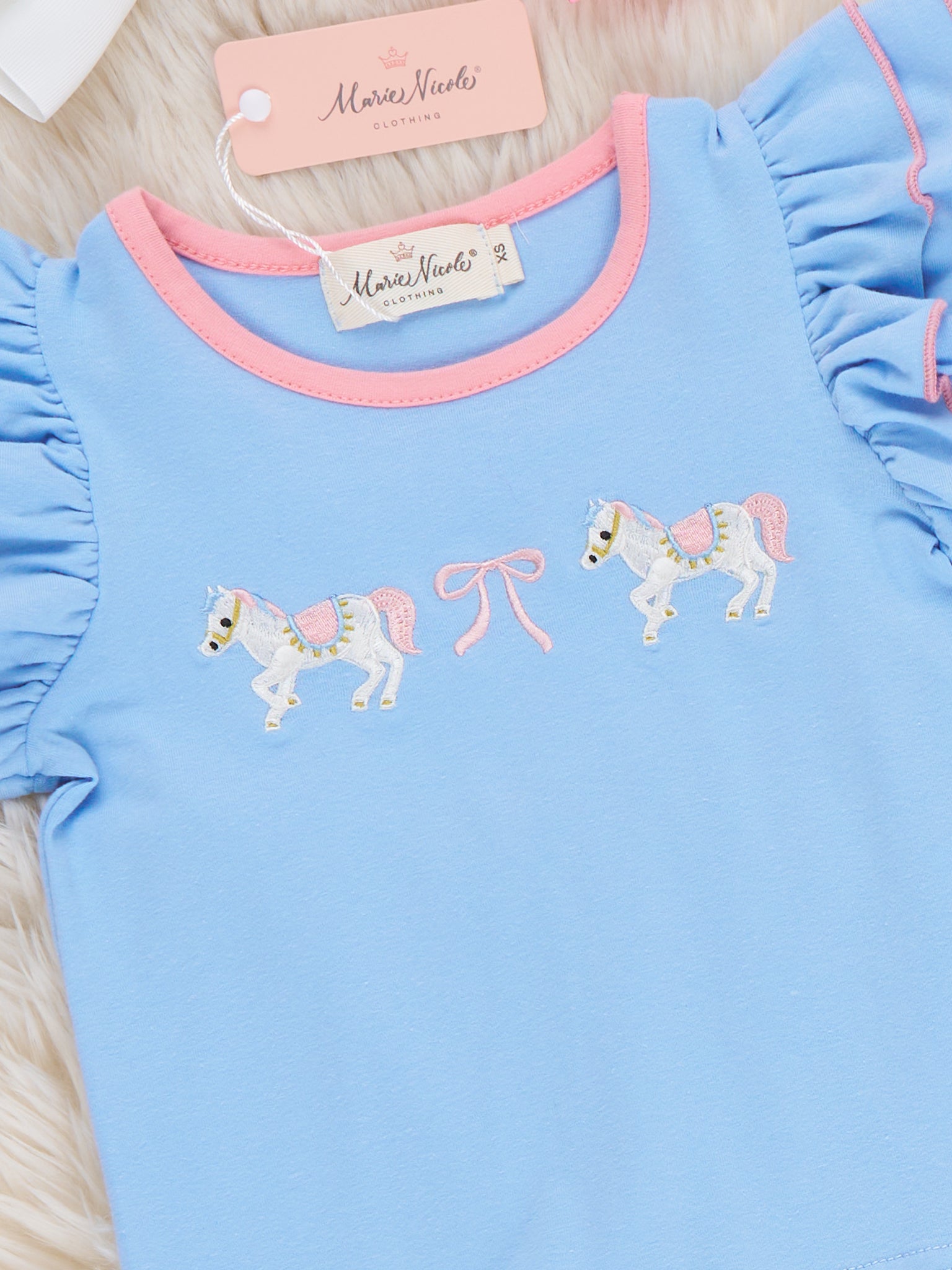 The Storybook Carousel Magic Embroidered Outfit by Marie Nicole Clothing brings fairytale fun to everyday wear with its sweet carousel pony embroidery and fluttery sleeve detail. Coordinating ruffle-hem pants feature a whimsical pattern that invites imagination, while the soft, stretchy knit keeps little ones comfy for playdates, parties, or cozy days at home.