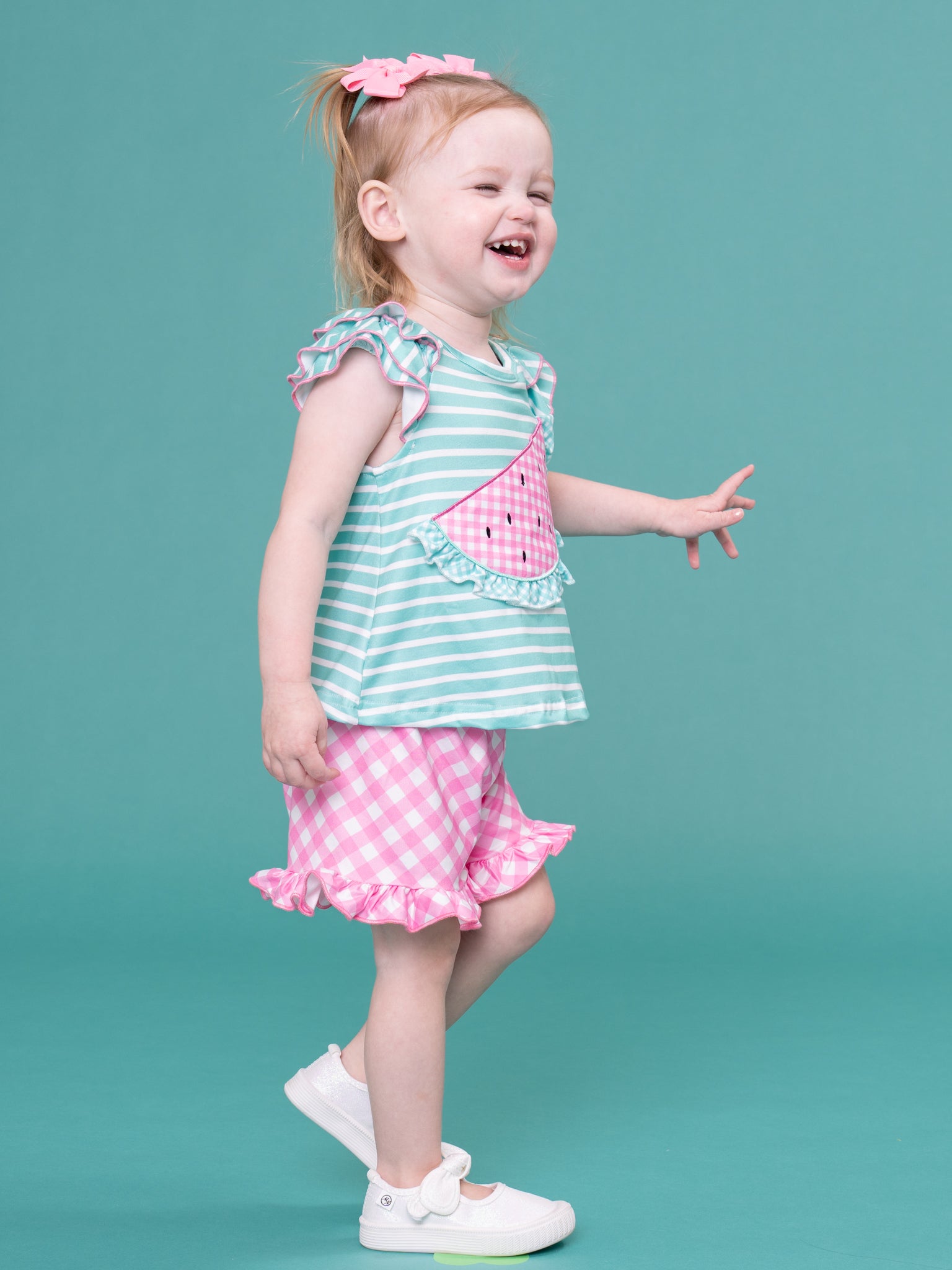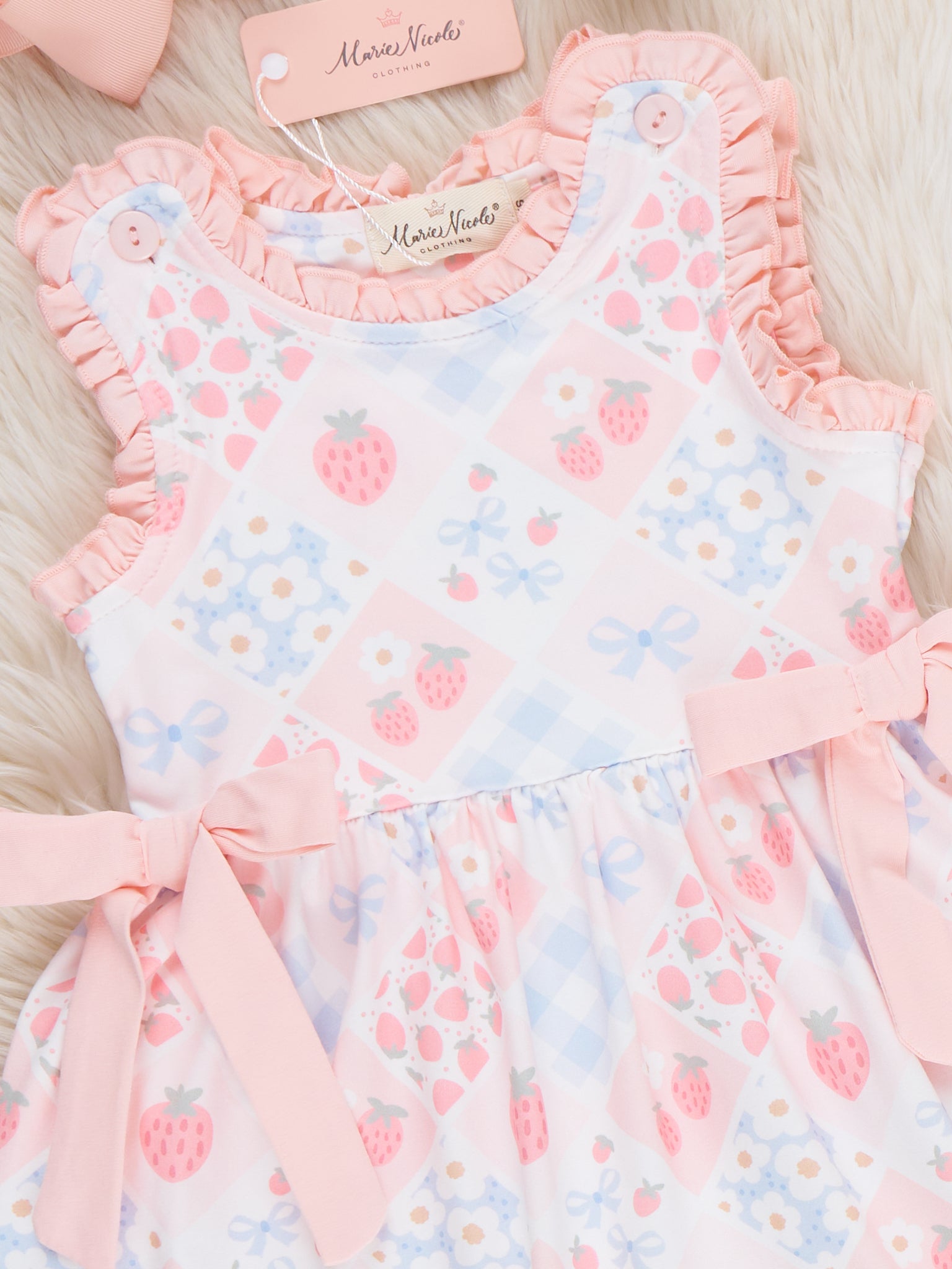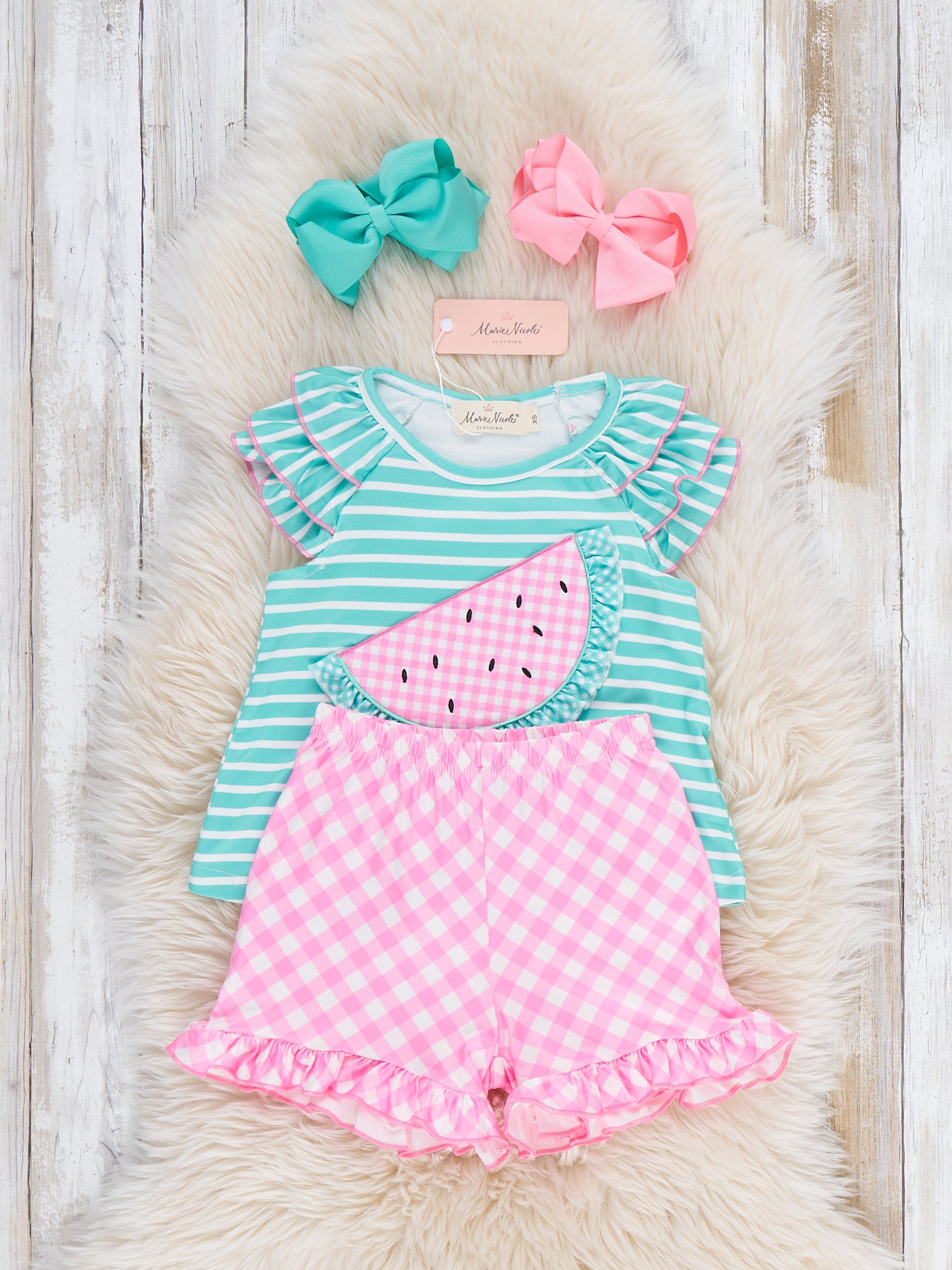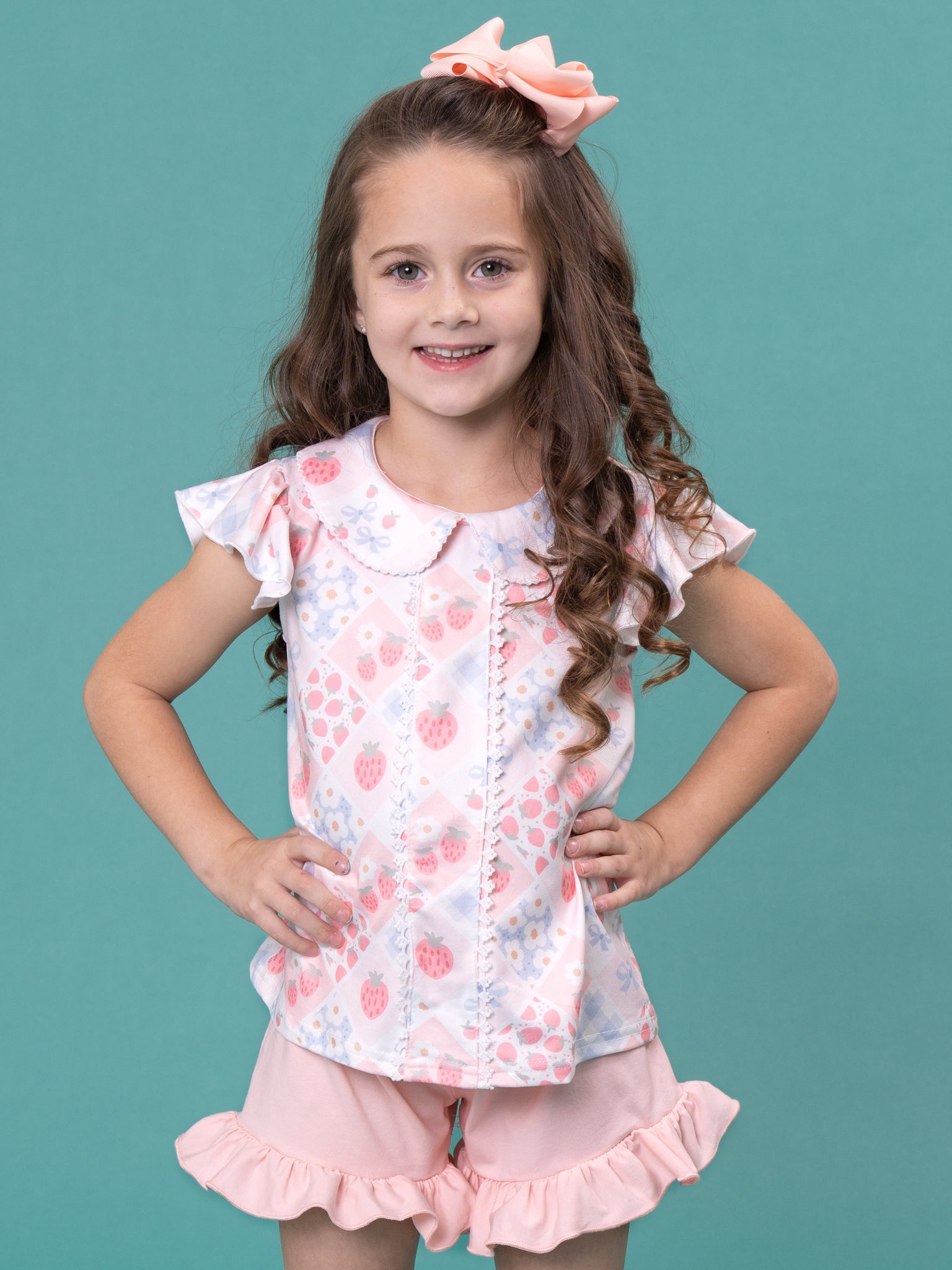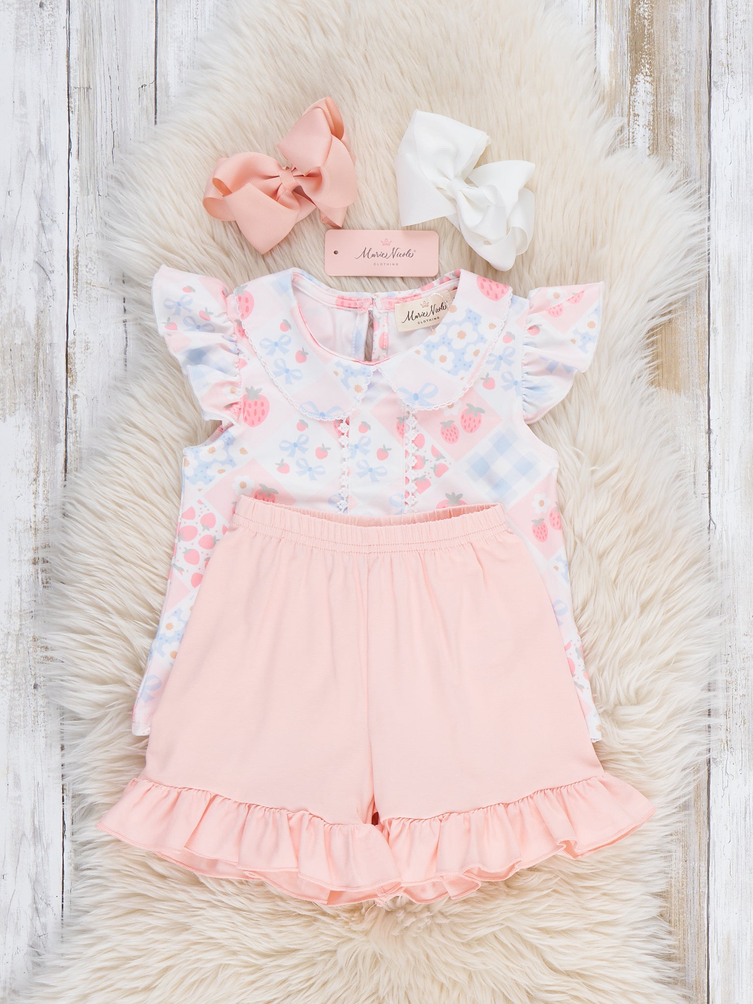 The Strawberry Sherbet Ruffle Outfit by Marie Nicole Clothing serves up soft, dreamy sweetness with a flutter-sleeve top in a patchwork-style berry print and coordinating ruffle-hem shorts. Comfy knit fabric and an easy pull-on fit make this set perfect for play, lounging, and picture-ready days filled with snuggles and twirls.