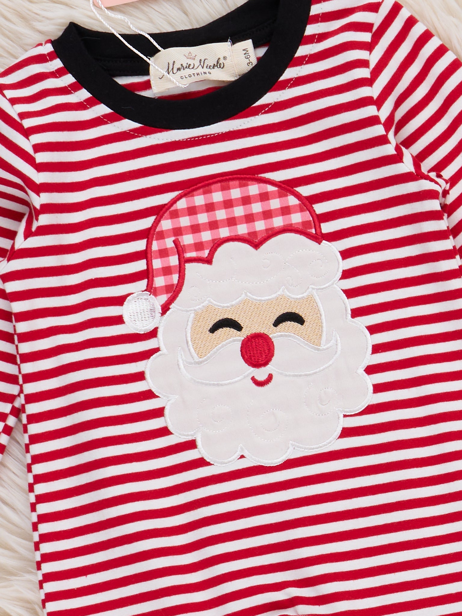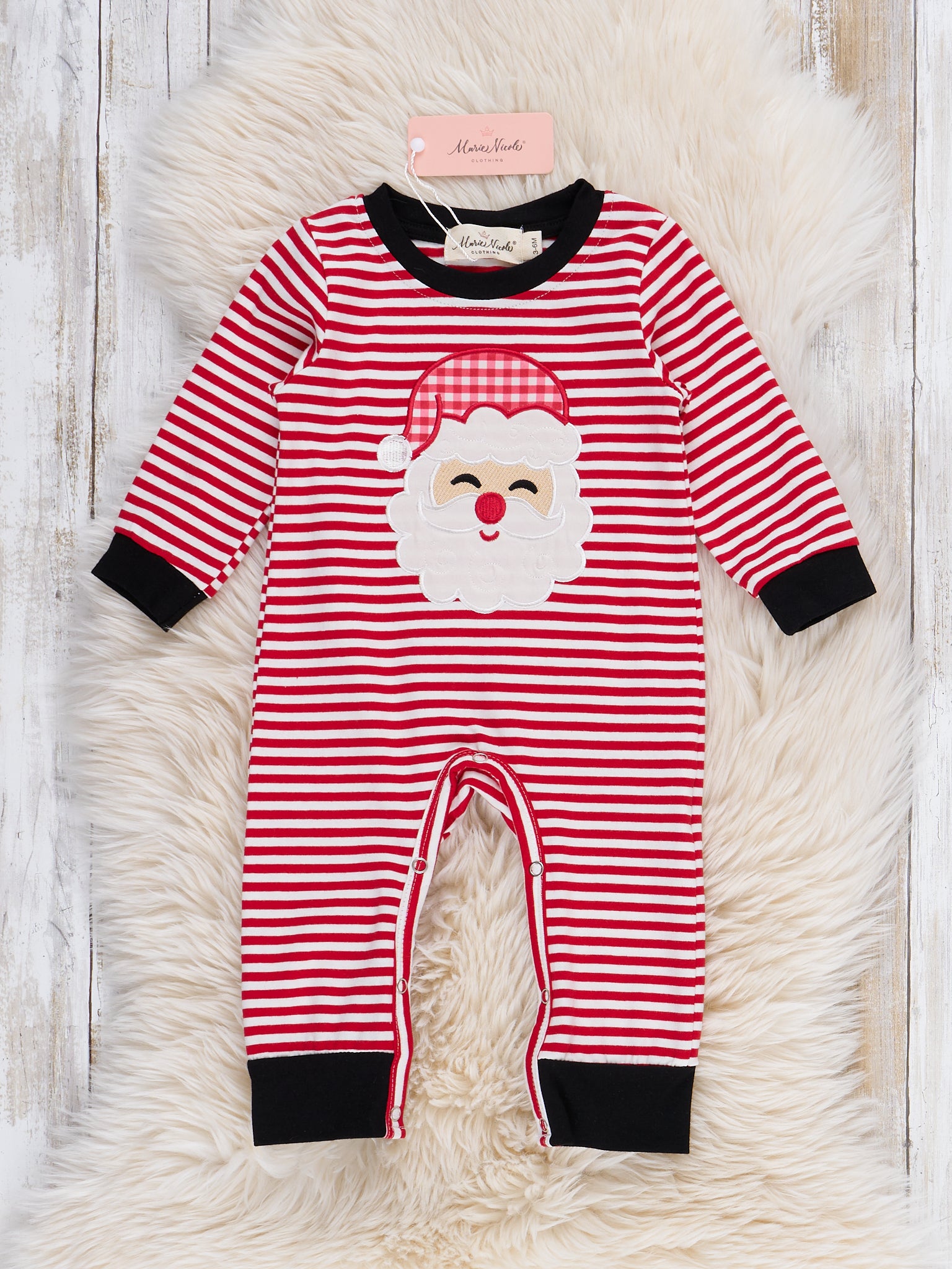 The Stripe Santa Ensemble Embroidered Romper by Marie Nicole features a long-sleeve design with cheerful stripes, a festive Santa applique on the front, and contrast trim at the neckline, cuffs, and ankles. This cozy romper offers a playful holiday look with easy snap closures for convenient changes.
