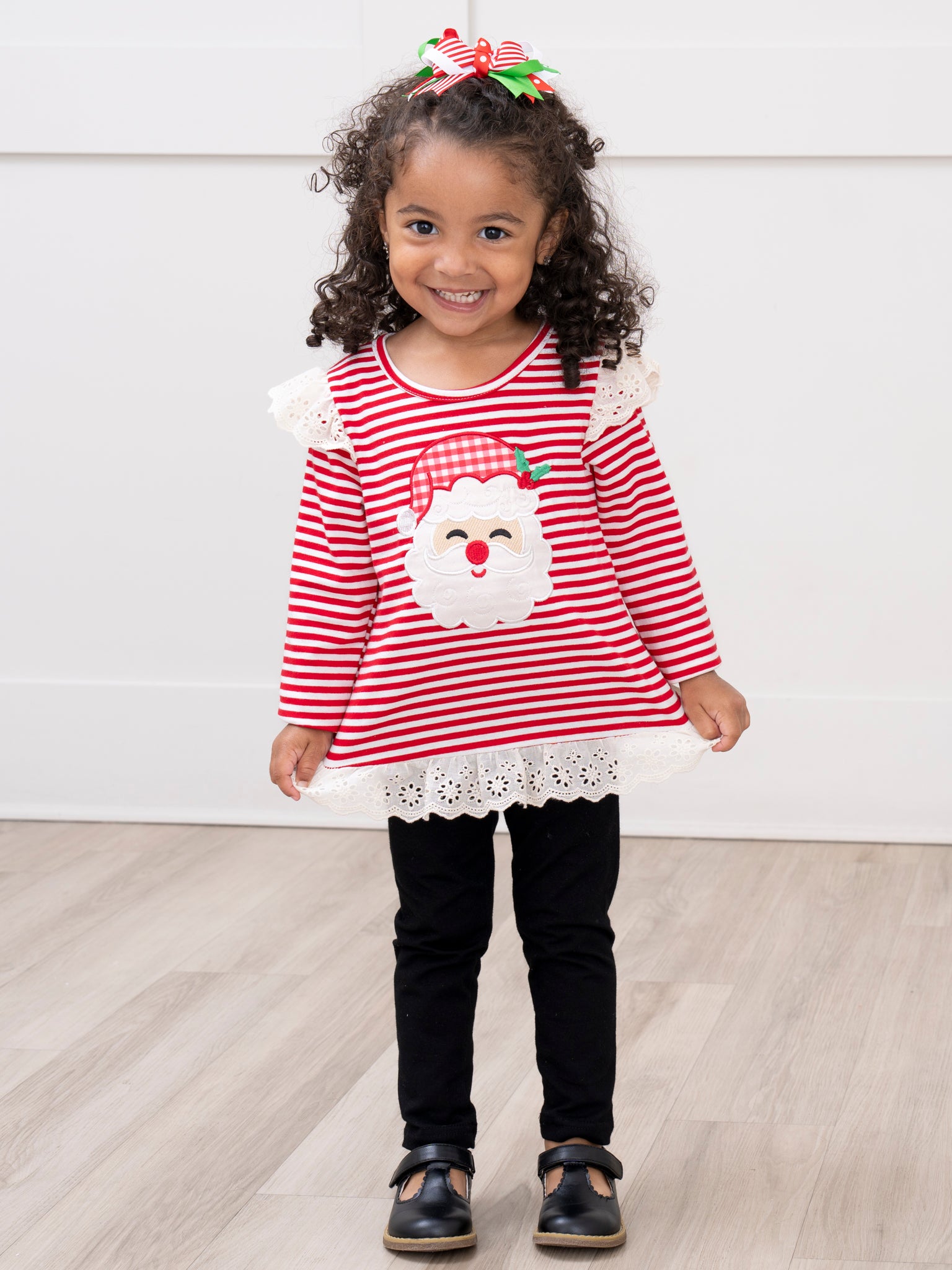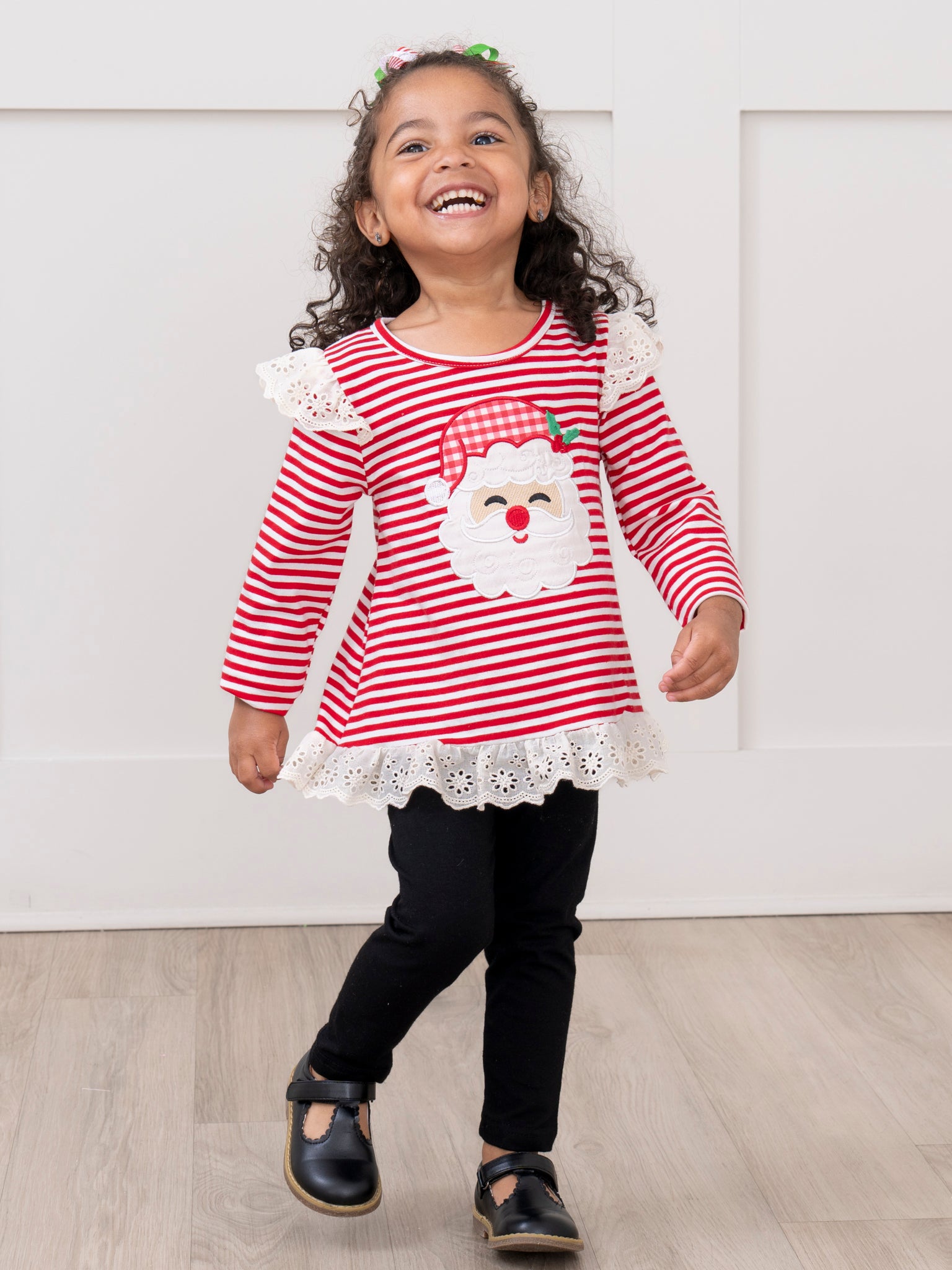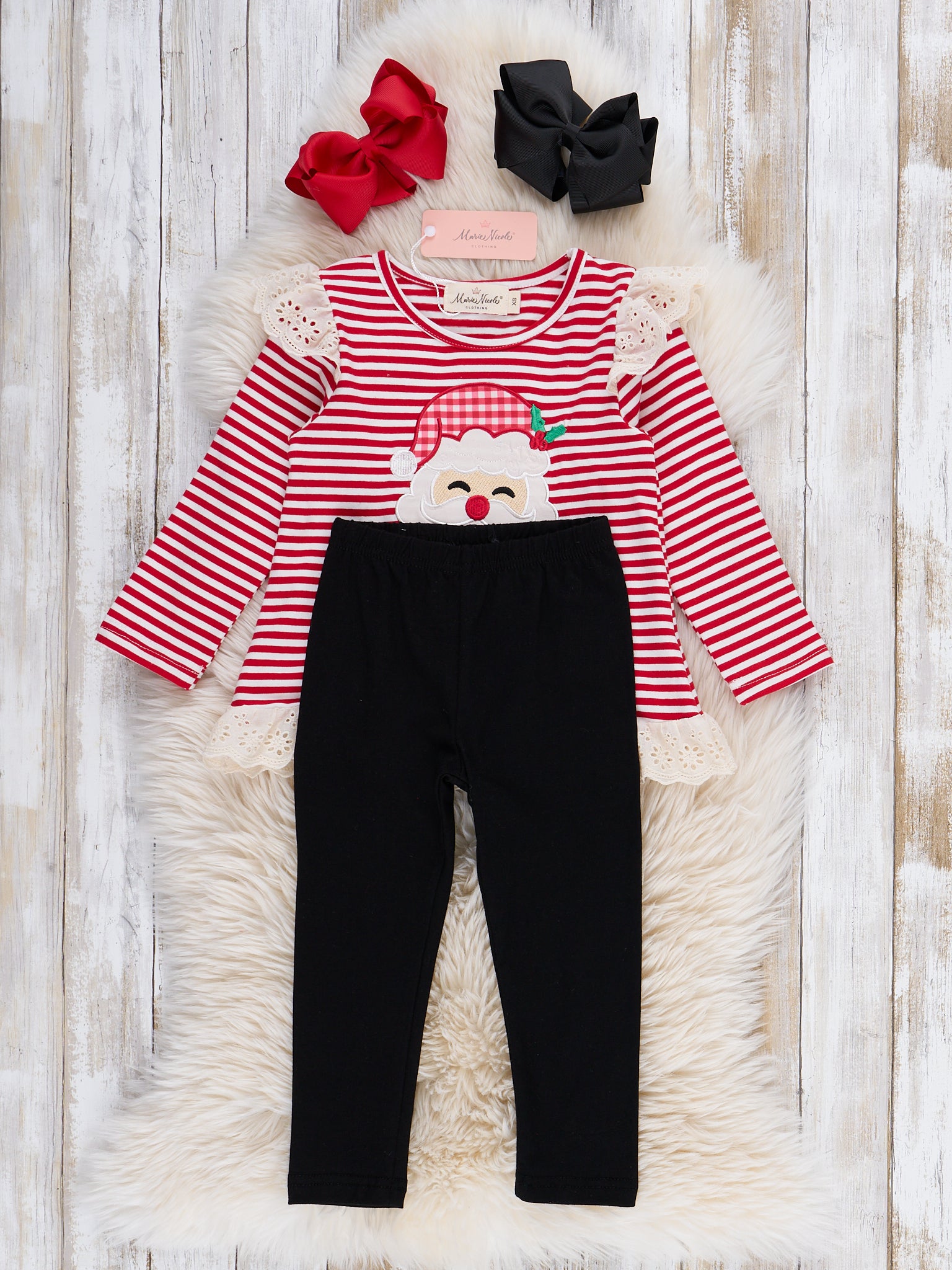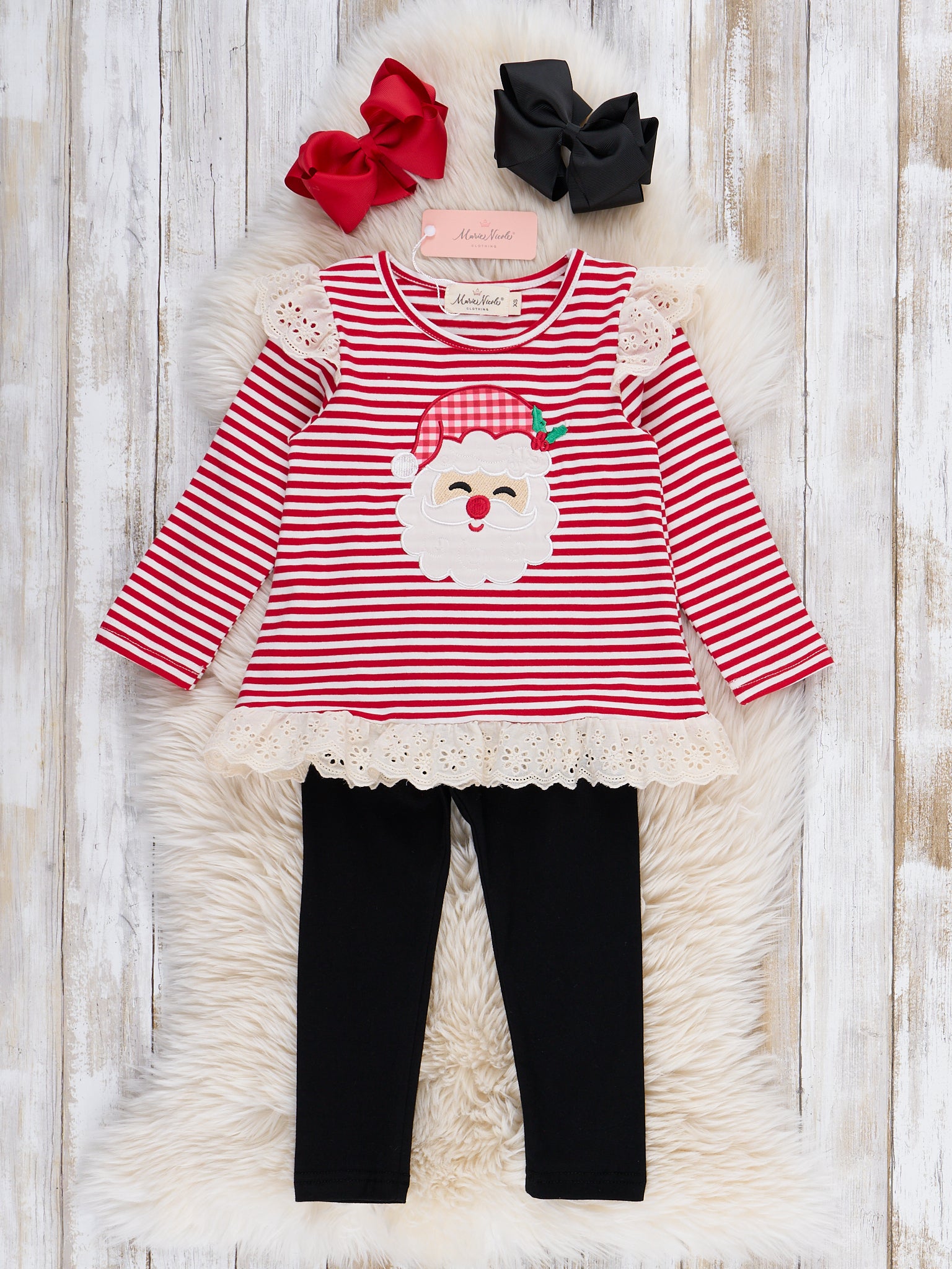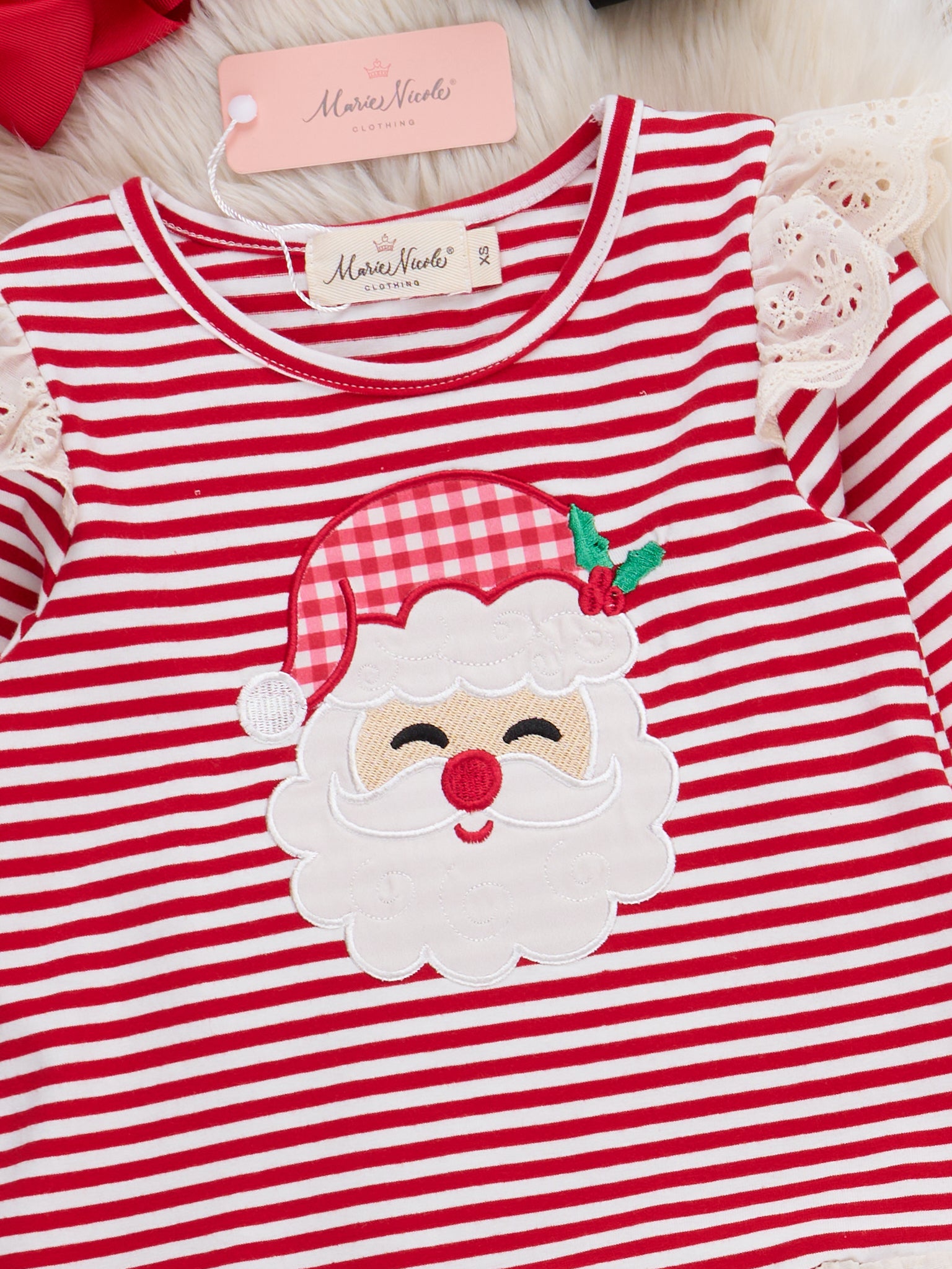 The Stripe Santa Ensemble Embroidered Ruffle Outfit by Marie Nicole features a long-sleeve top with cheerful stripes, playful shoulder ruffles, and a festive Santa face embroidery, finished with a decorative lace trim at the hem. Paired with classic, comfortable leggings, this set is perfect for bringing holiday spirit and everyday comfort
