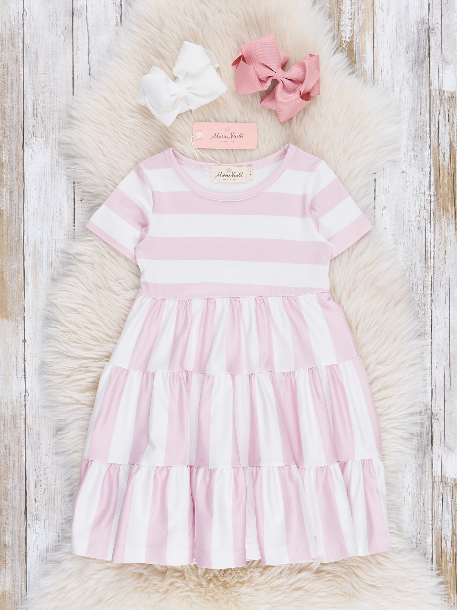 The perfect mom & me set by Marie Nicole Clothing for a tea party for 2! The Striped Swing Dress in mauve is a lovely pick for the warming spring weather, and we love the ruffles on these classic, striped swing dresses. Great for matching with momma!