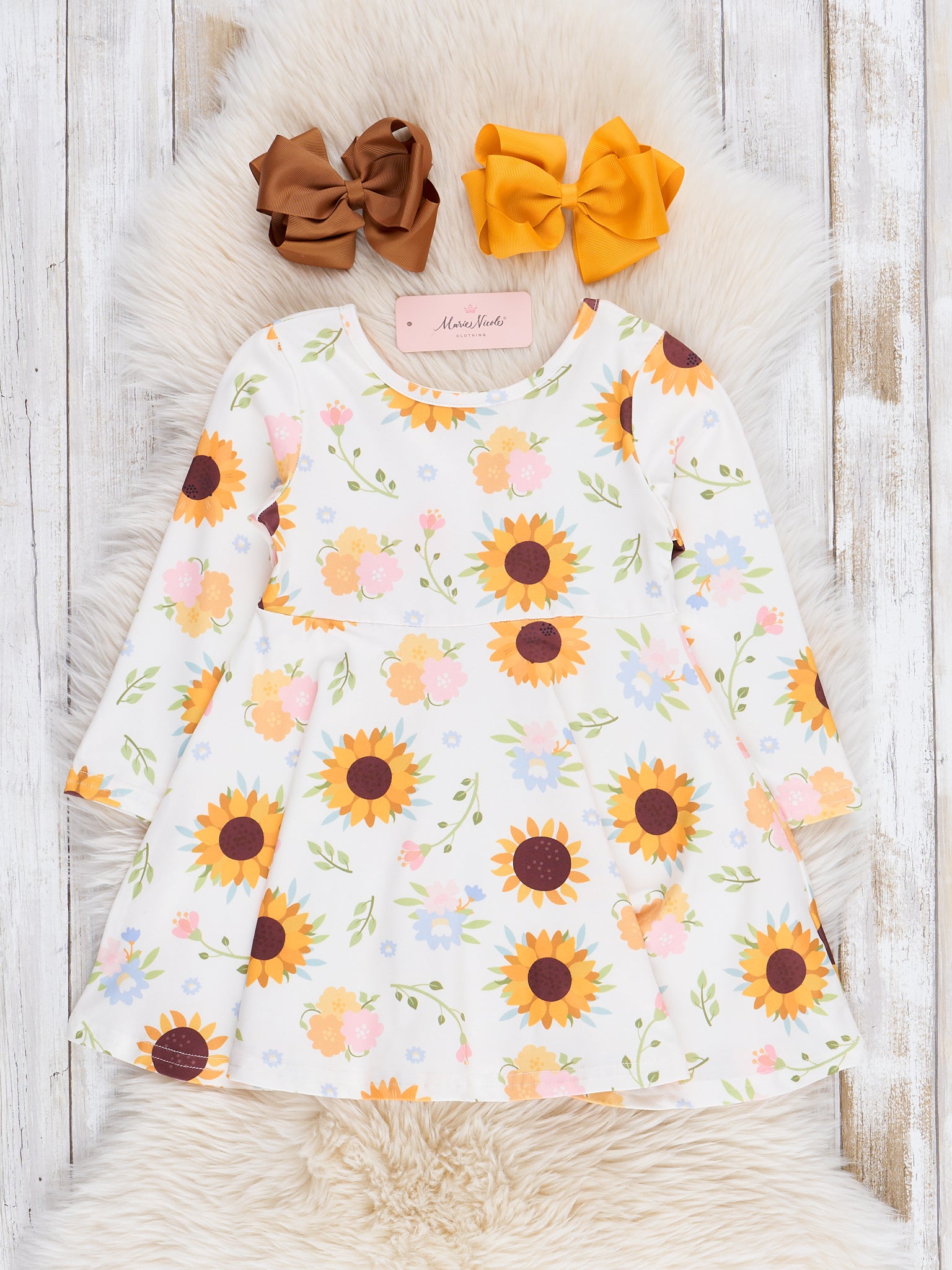 Let your little one flutter around in style with this darling sunflower dress! Featuring bright and cheerful sunflowers and daisies, this dress is bound to bring a smile to all the daisies in the garden. Let your little one have a blast while looking their best!