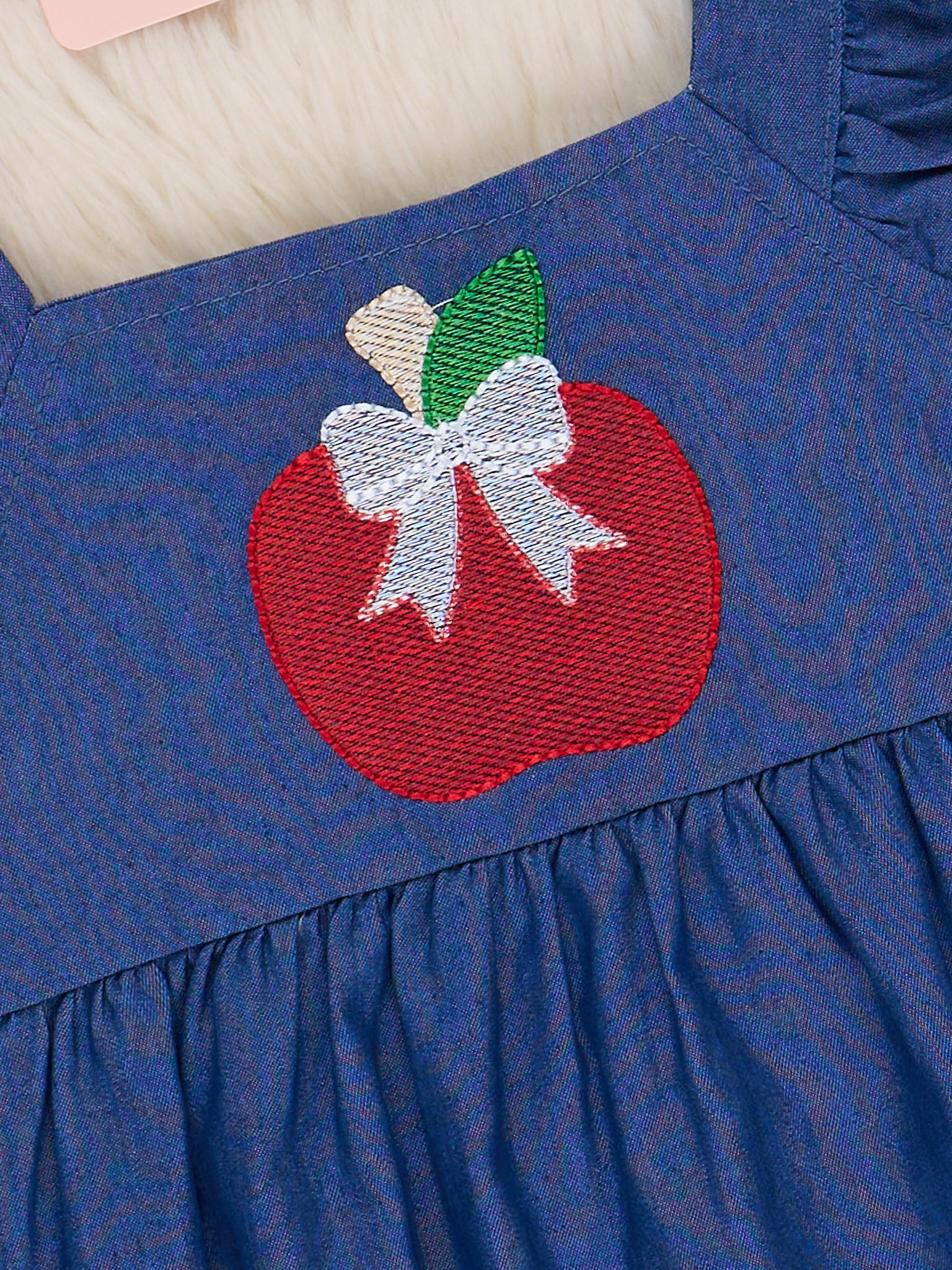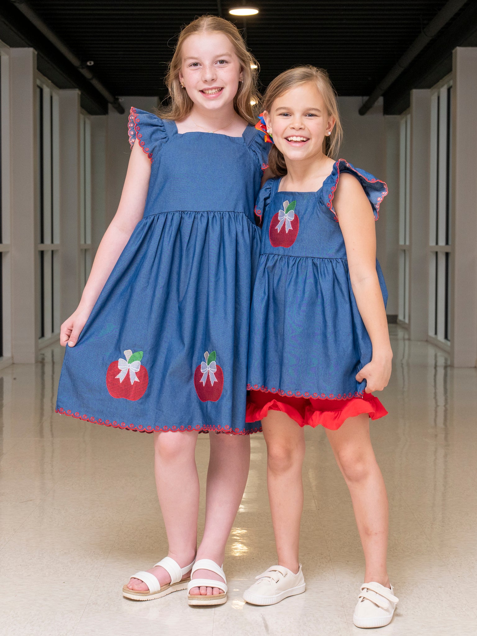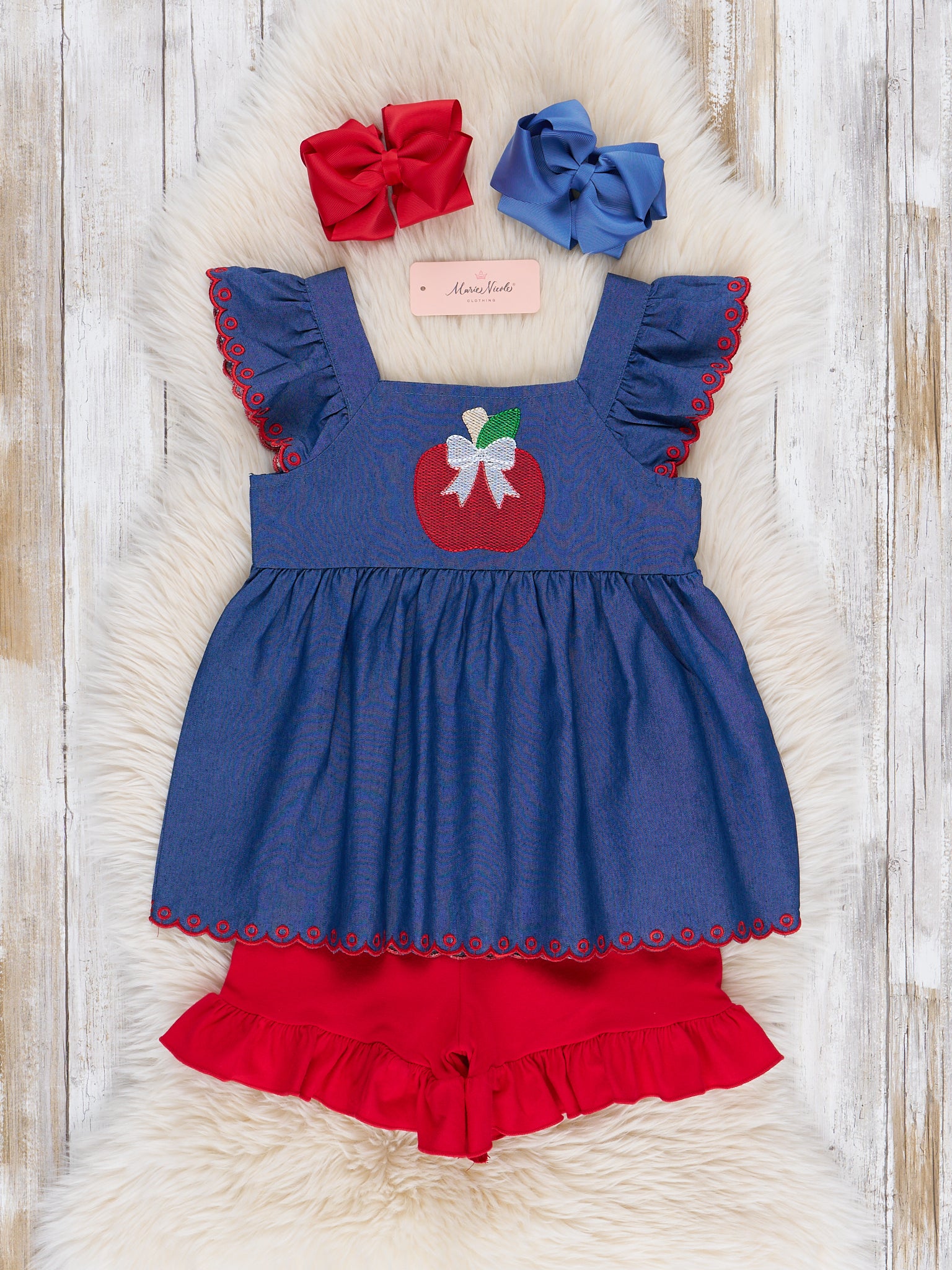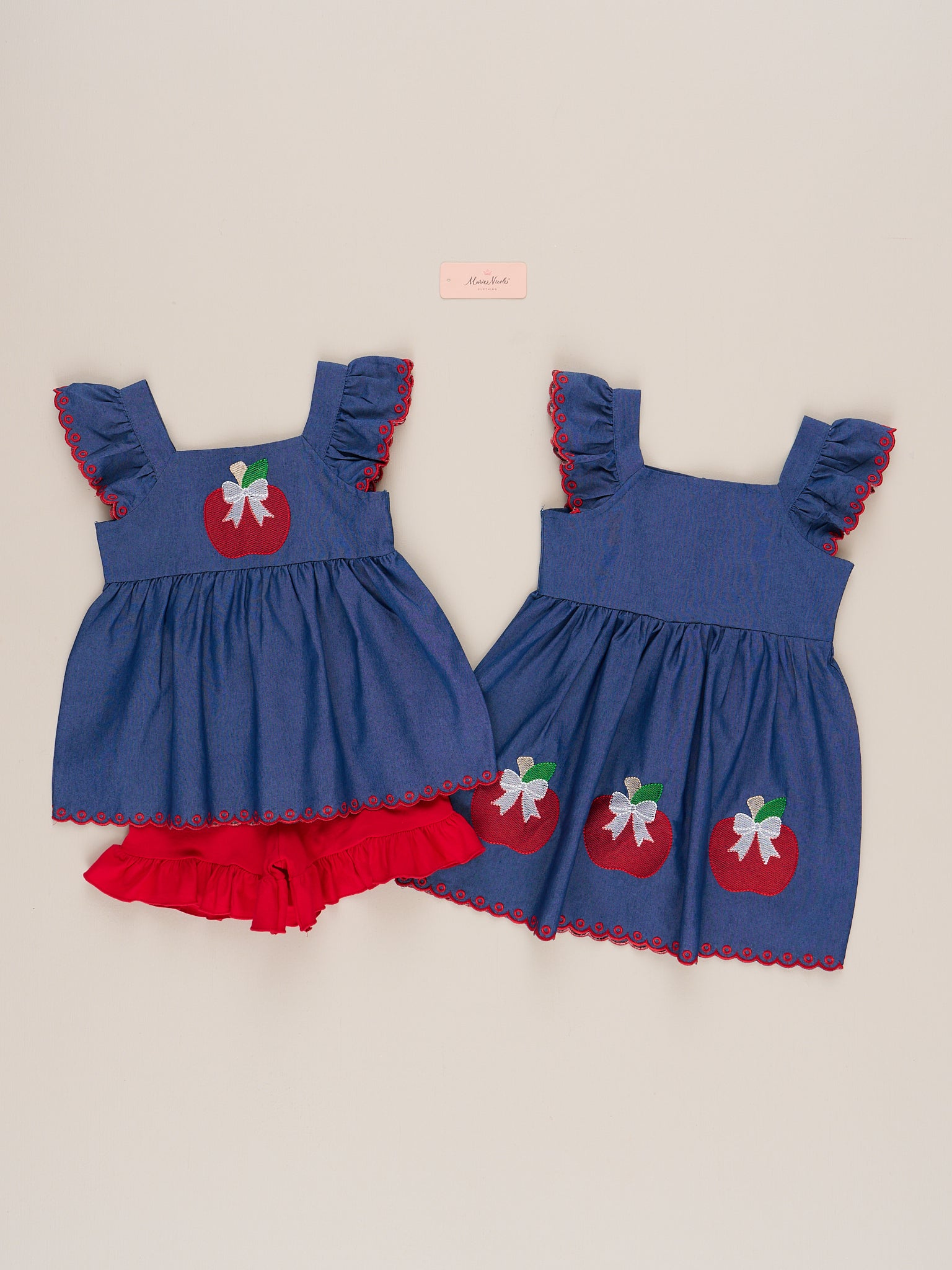 The Sweet Apple Chambray Ruffle Outfit is a charming and timeless choice perfect for back-to-school days and casual outings. Featuring a soft chambray fabric adorned with delicate apple embroidery and finished with gentle ruffle details, this outfit from Marie Nicole Clothing blends classic style with everyday comfort. Lightweight and breathable, it’s ideal for playdates, family gatherings, or any day she wants to look effortlessly sweet.